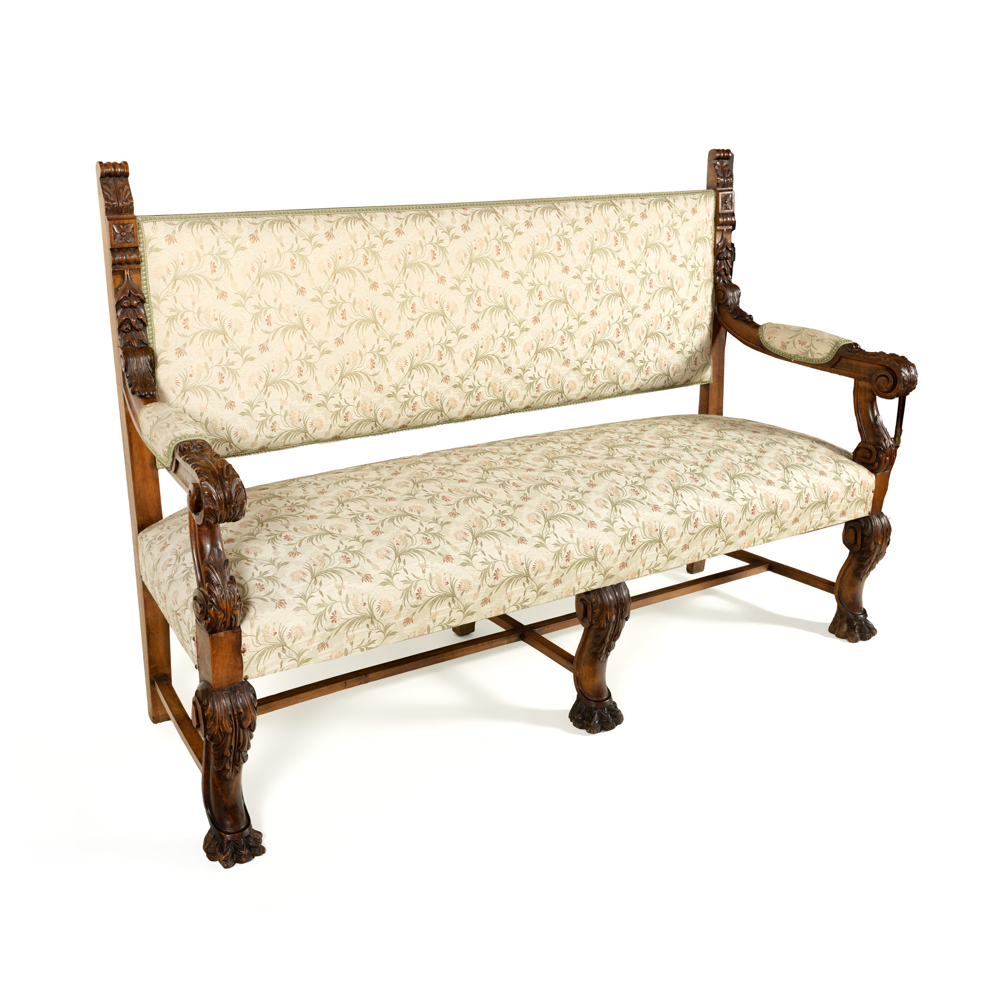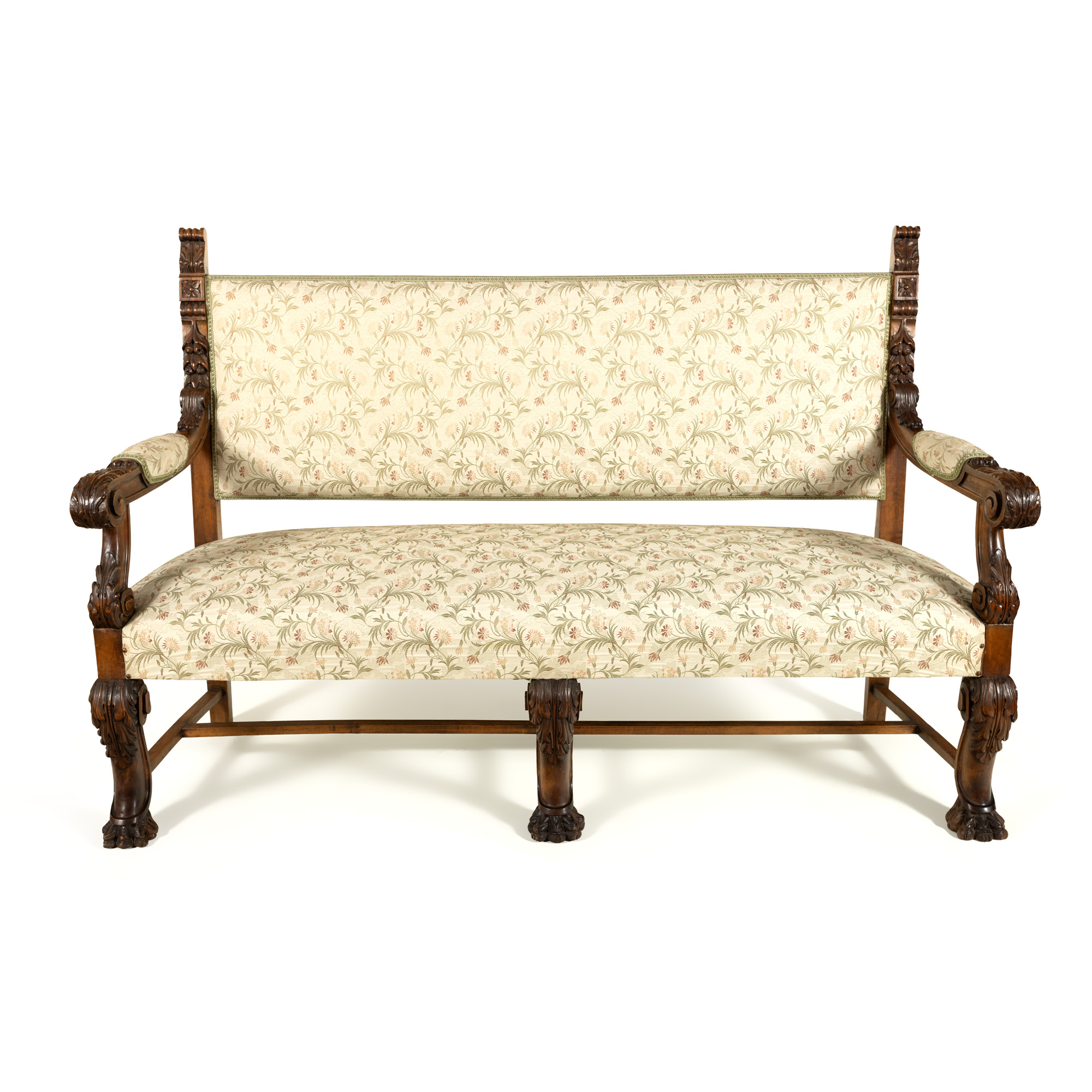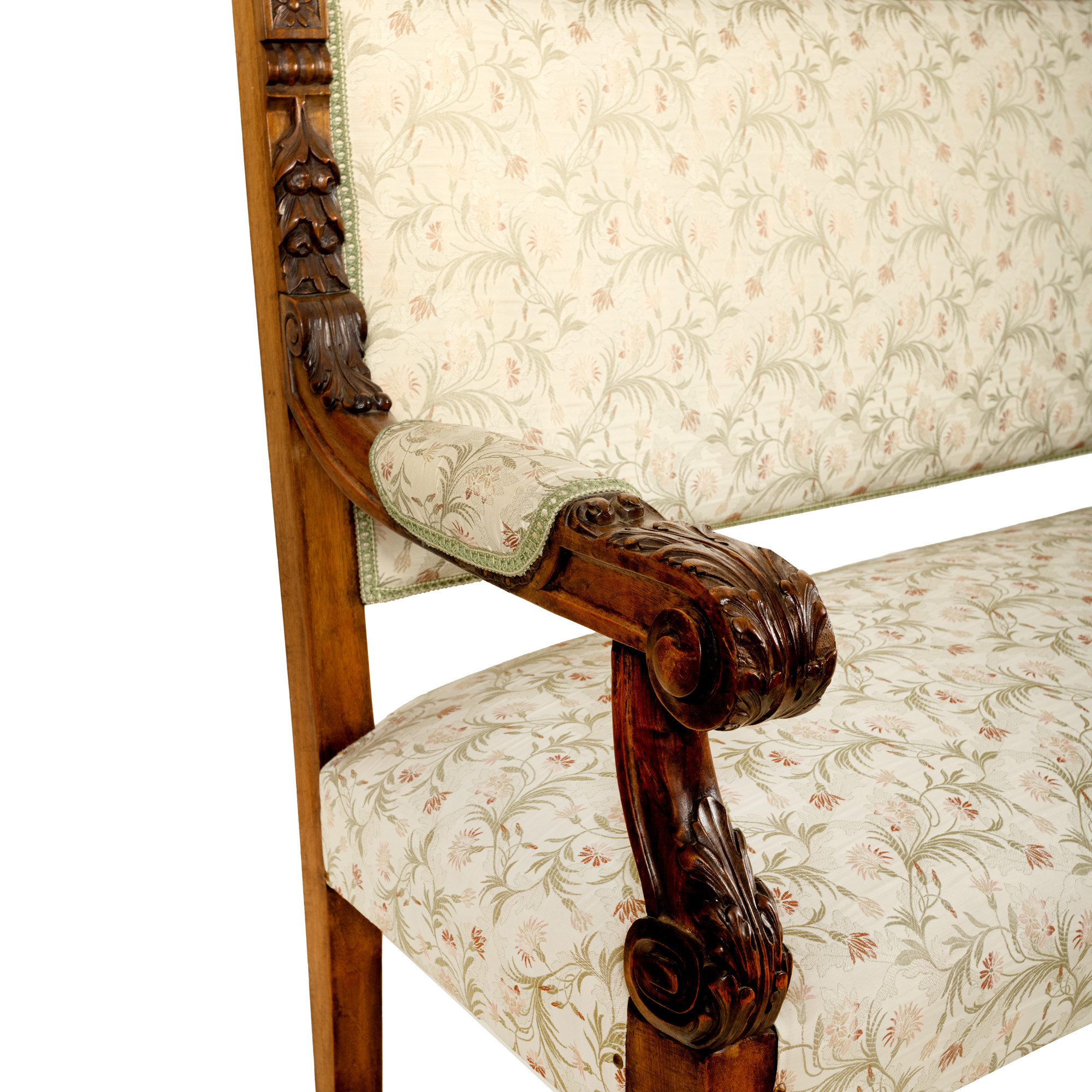 57. Canapea Victoriană din lemn de nuc, decorată cu tapiserie cu motive florale, începutul sec. XX