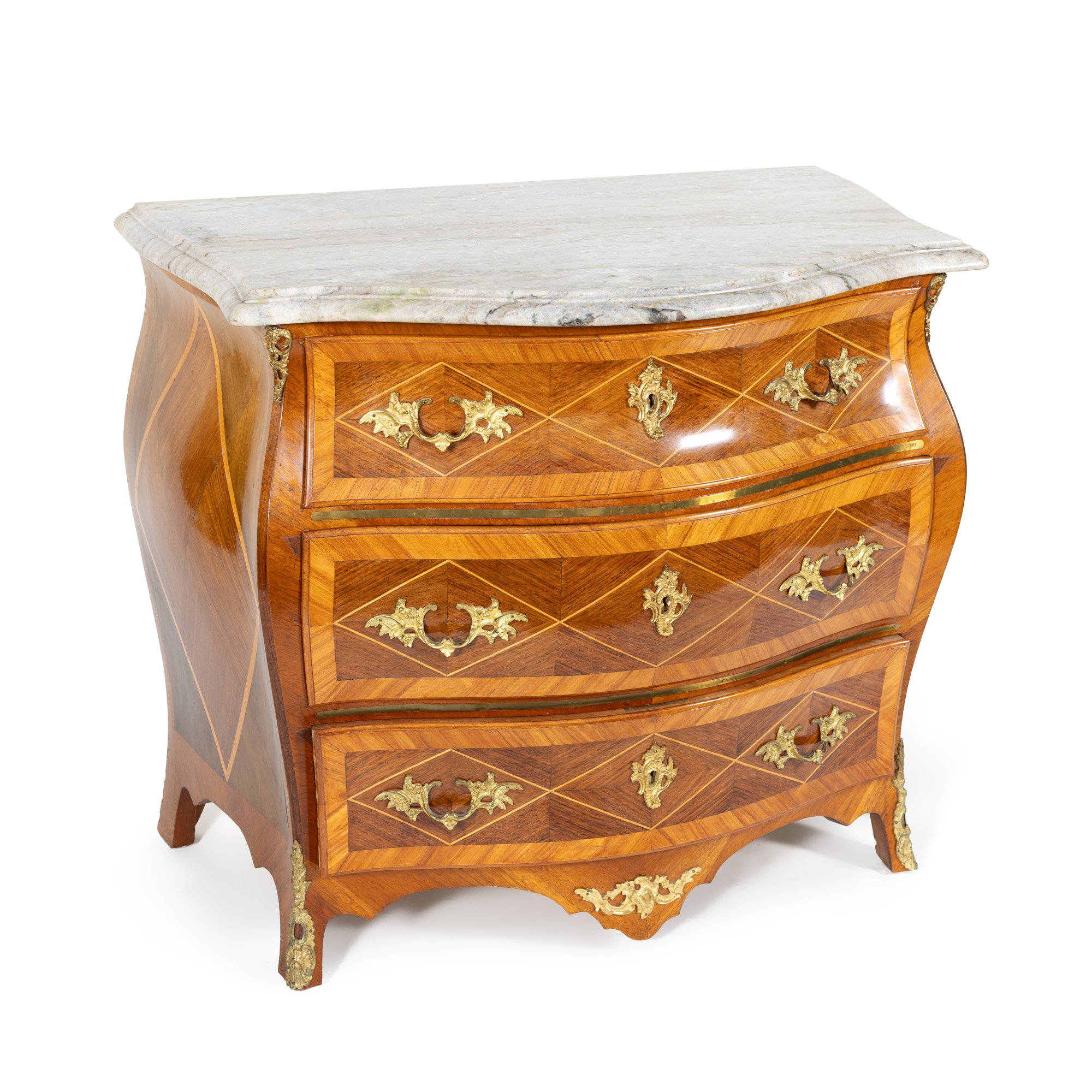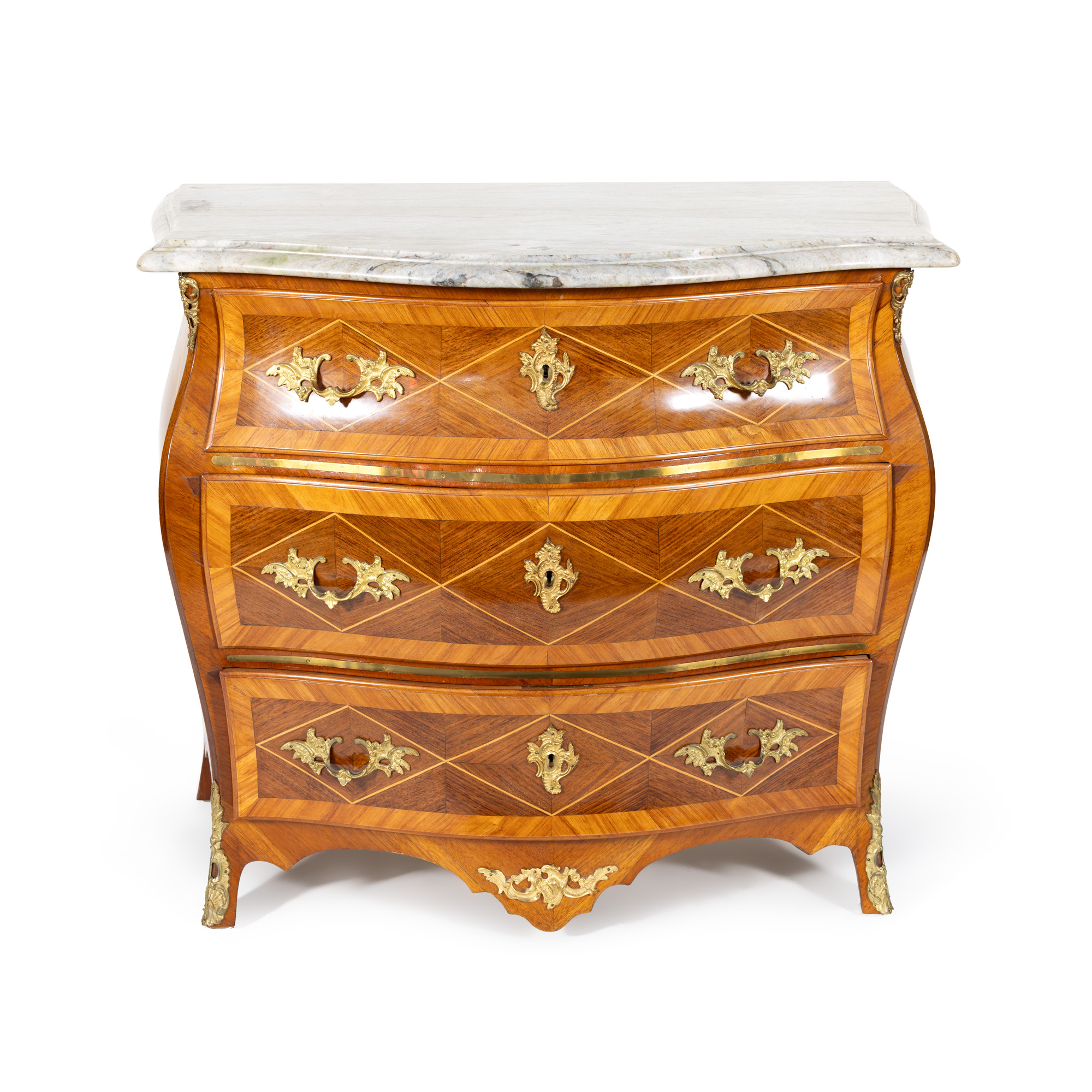 112. Comodă bombé în stil Louis XV, ornată cu intarsii și ornamente din bronz doré, cca. 1900
