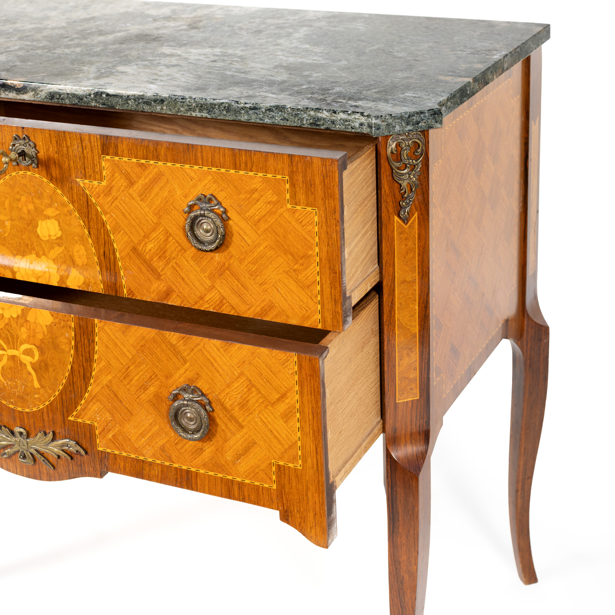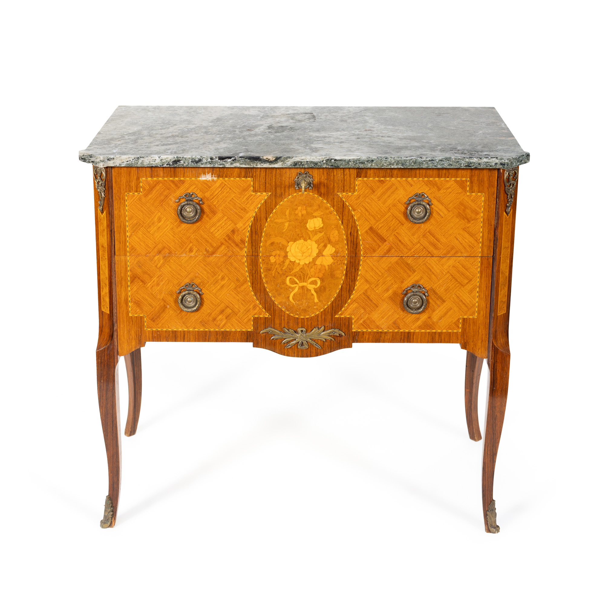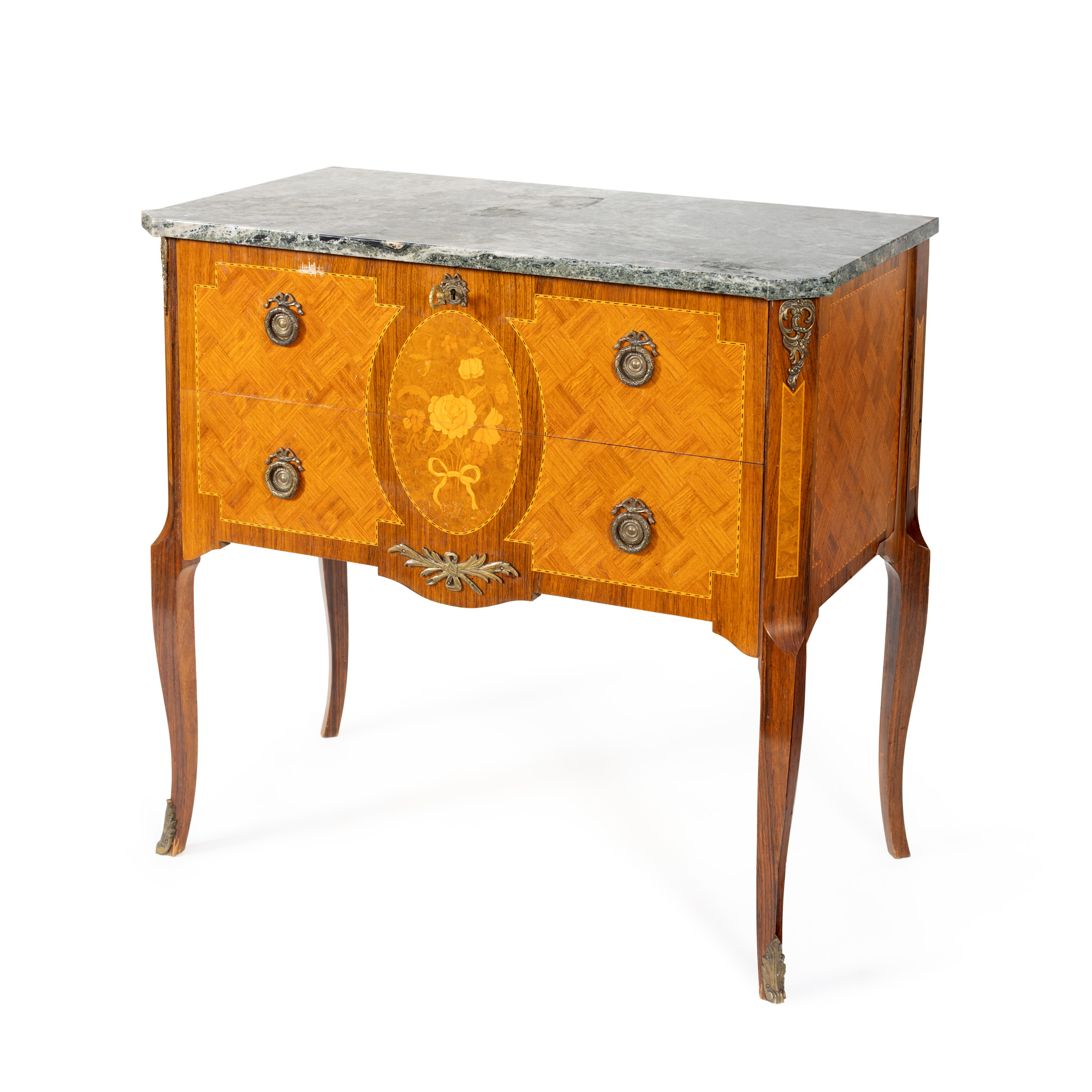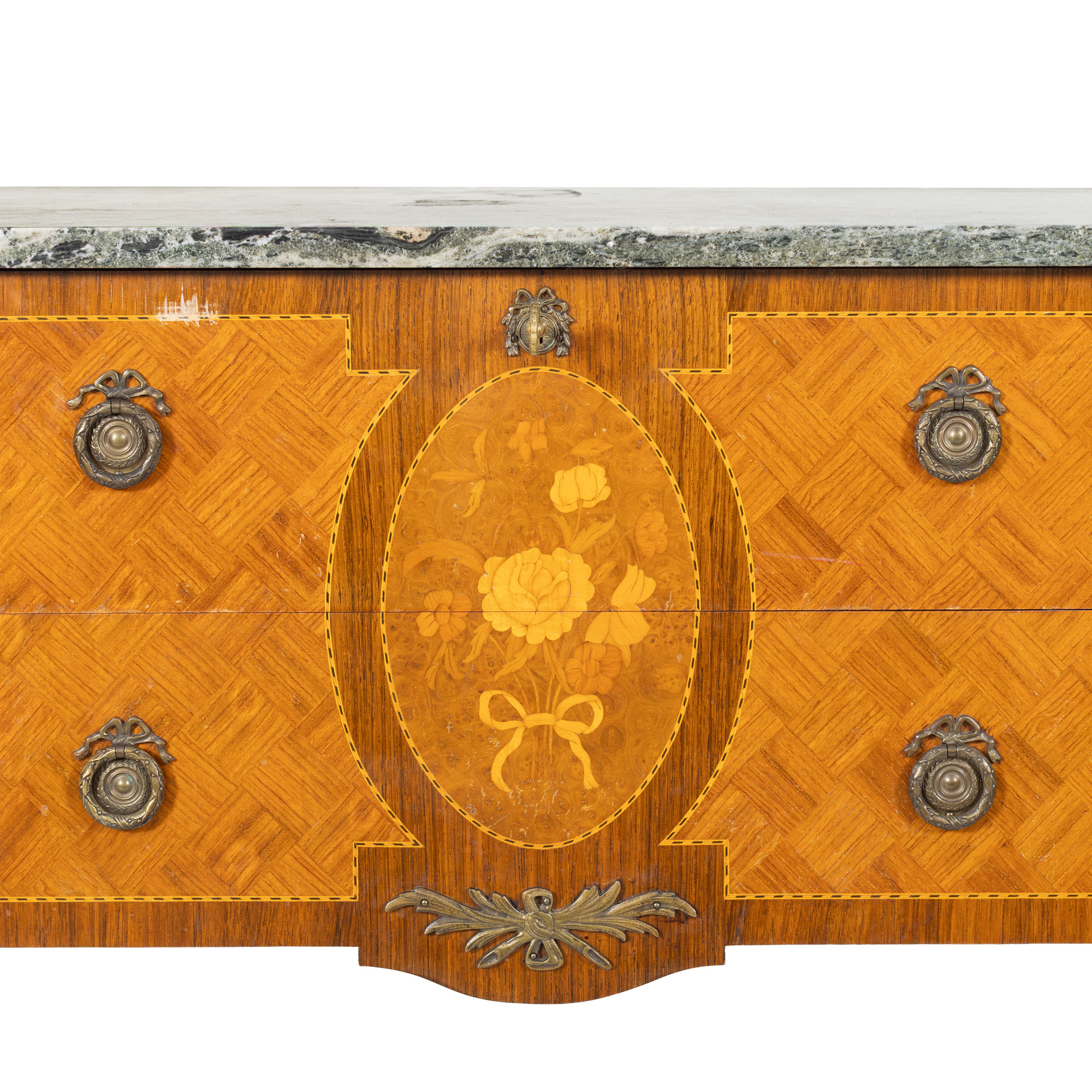 48. Comodă în manieră Louis XV, cu blat de marmură, decorată cu intarsii florale, cca. 1900