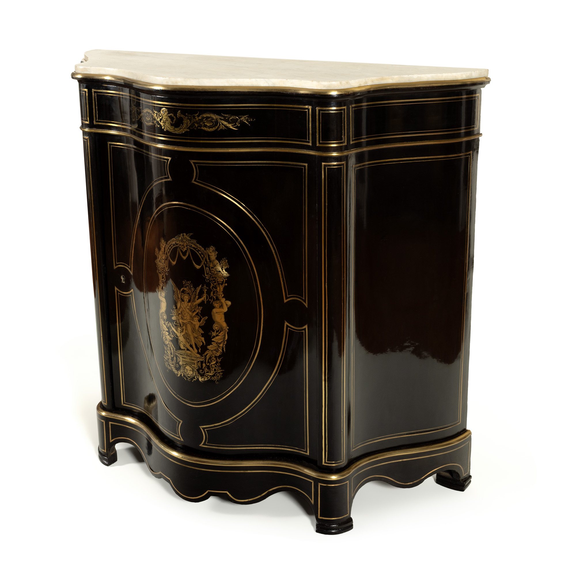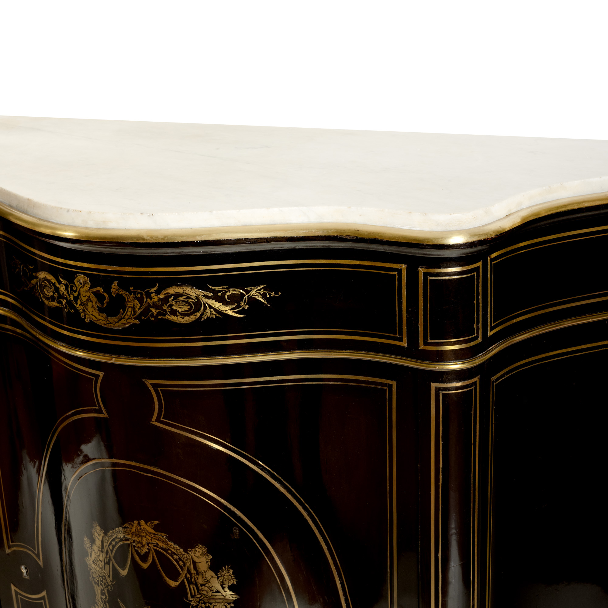 37. Comodă tip Boulle în stil Napoleon III, ornată cu intarsii și decorațiuni din bronz, sfârșitul sec. XIX