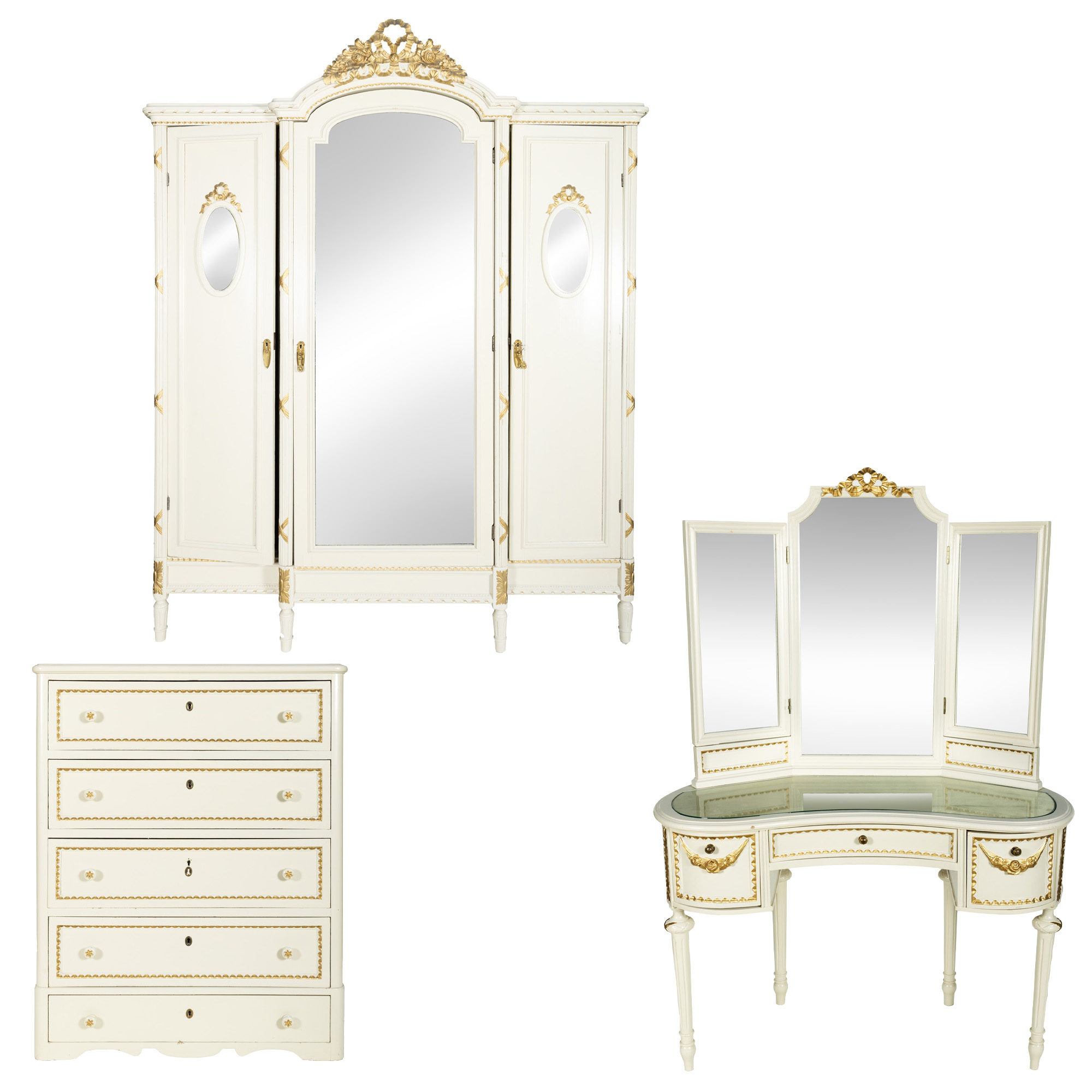 70. Garnitură pentru dormitor Louis XVI, formată din măsuță de toaletă, comodă și armoar, prima jumătate a sec. XX