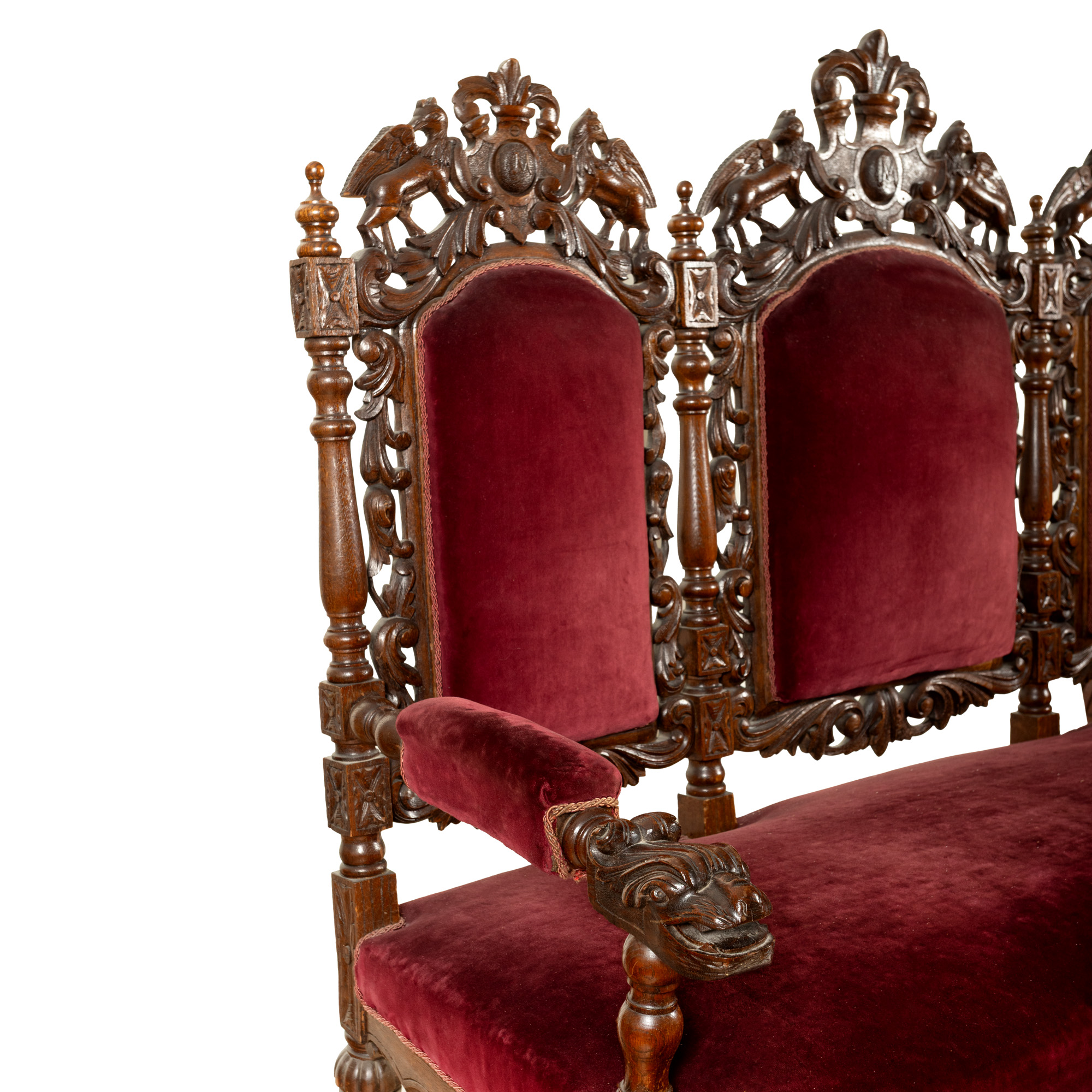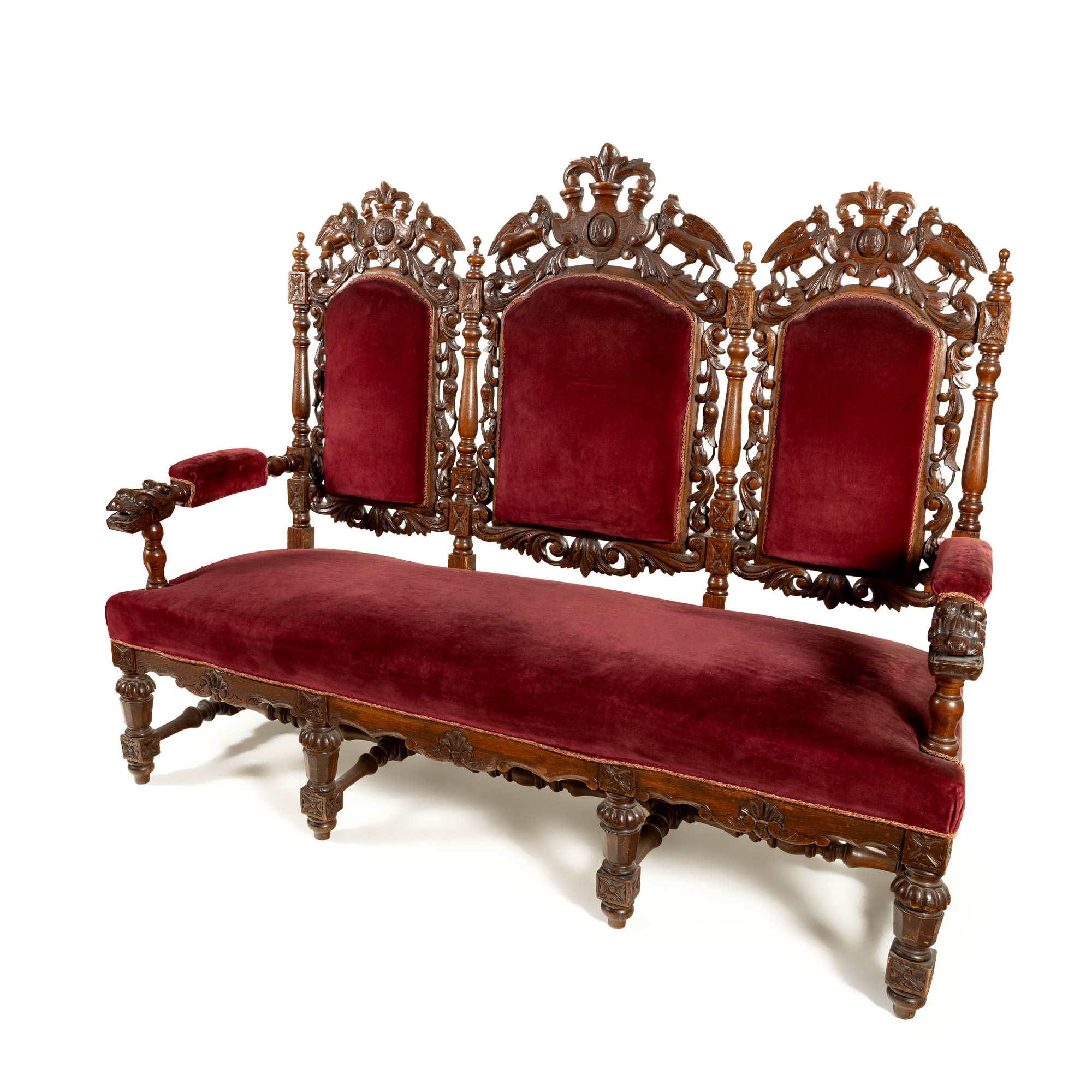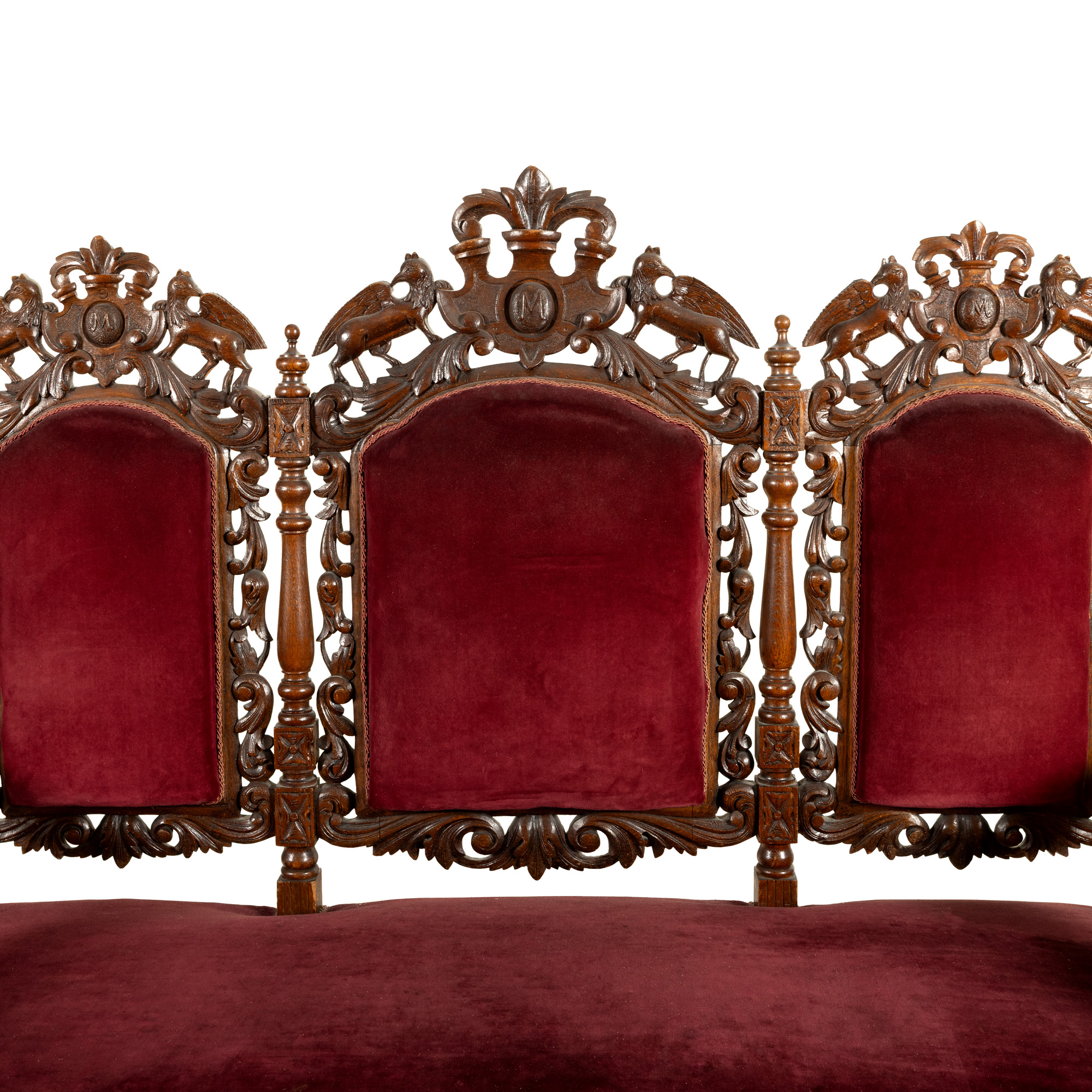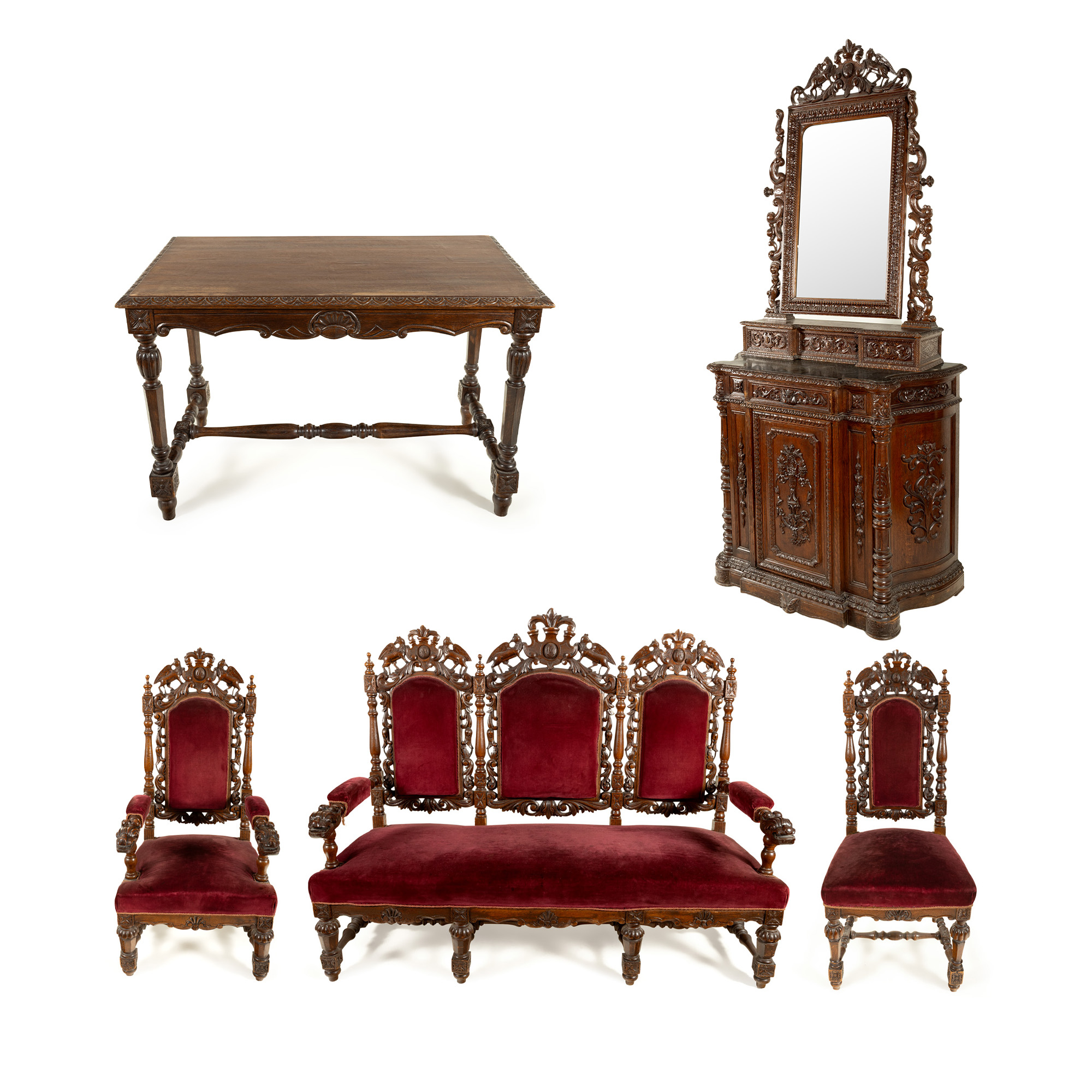 69. Garnitură pentru salon Neo-Gotic, formată din credență, masă, banchetă, pereche de scaune și fotolii, monogramată ”M”, sfârșitul sec. XIX