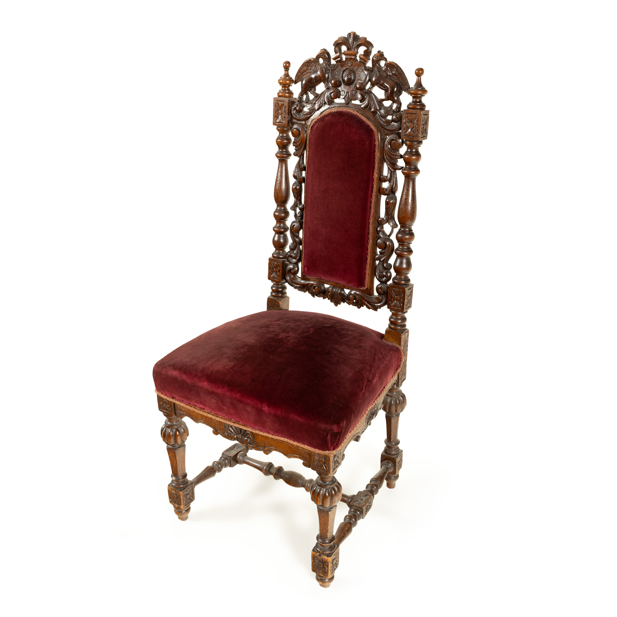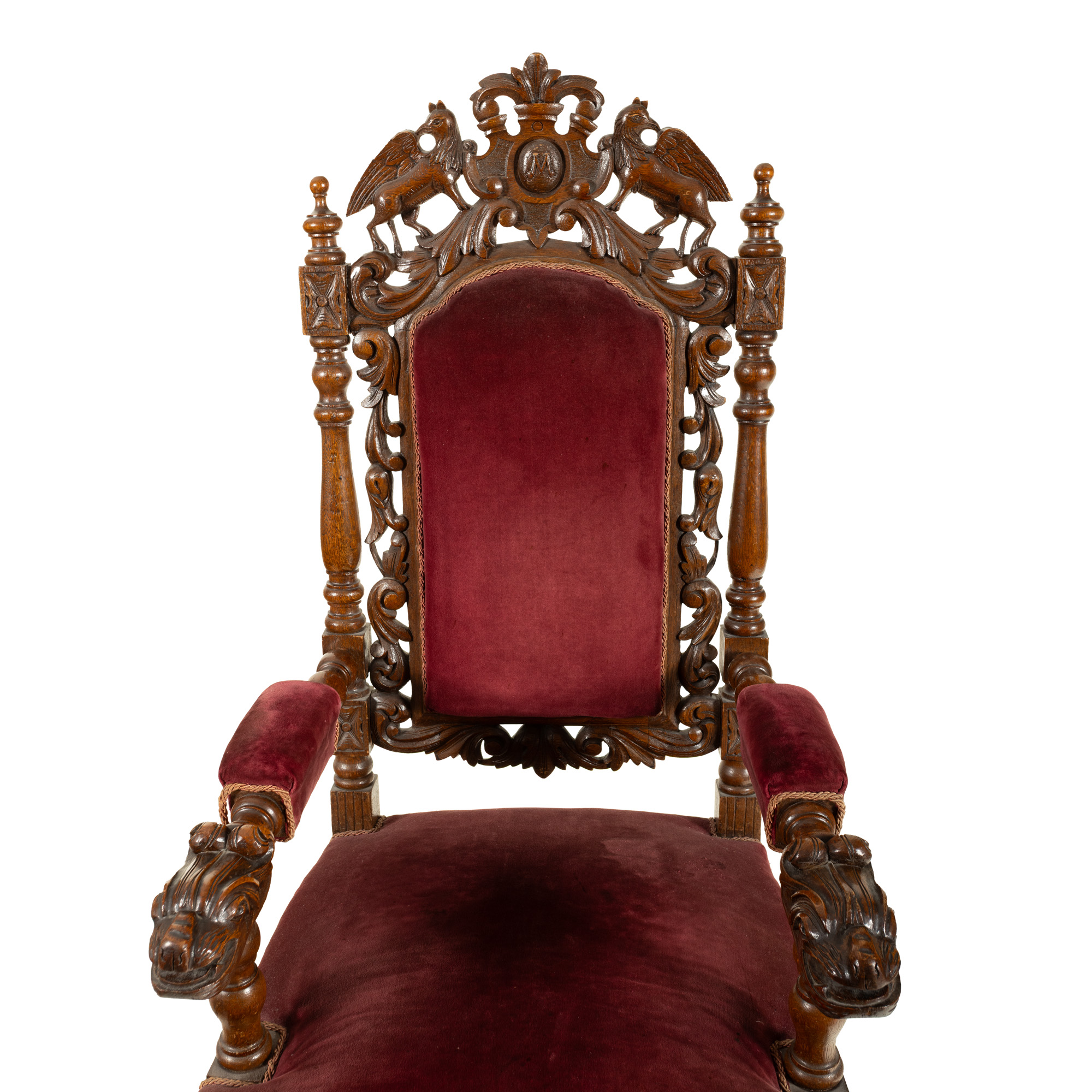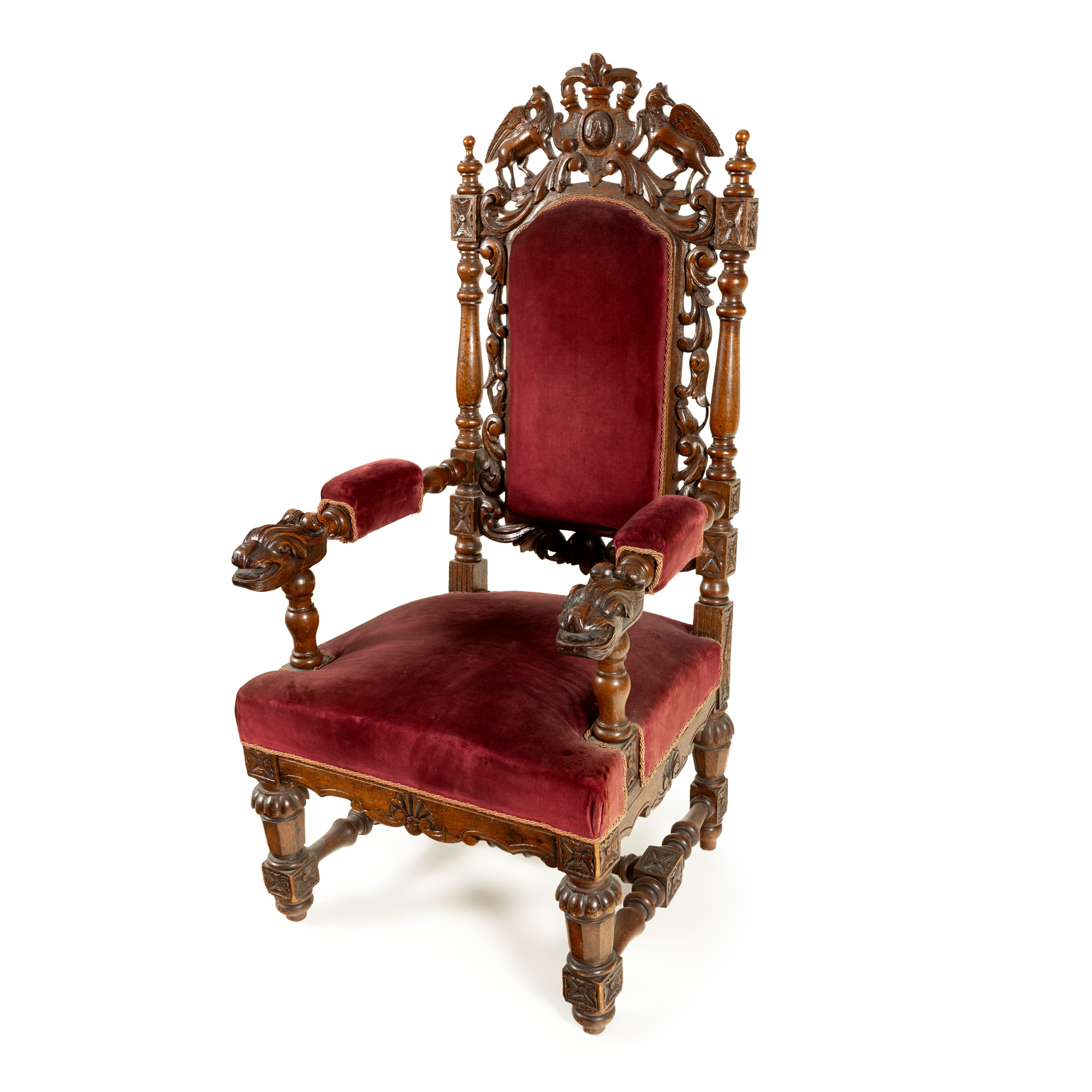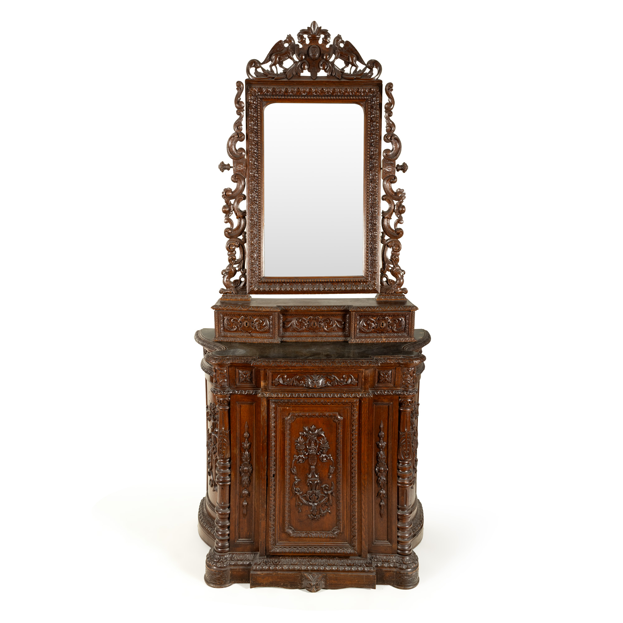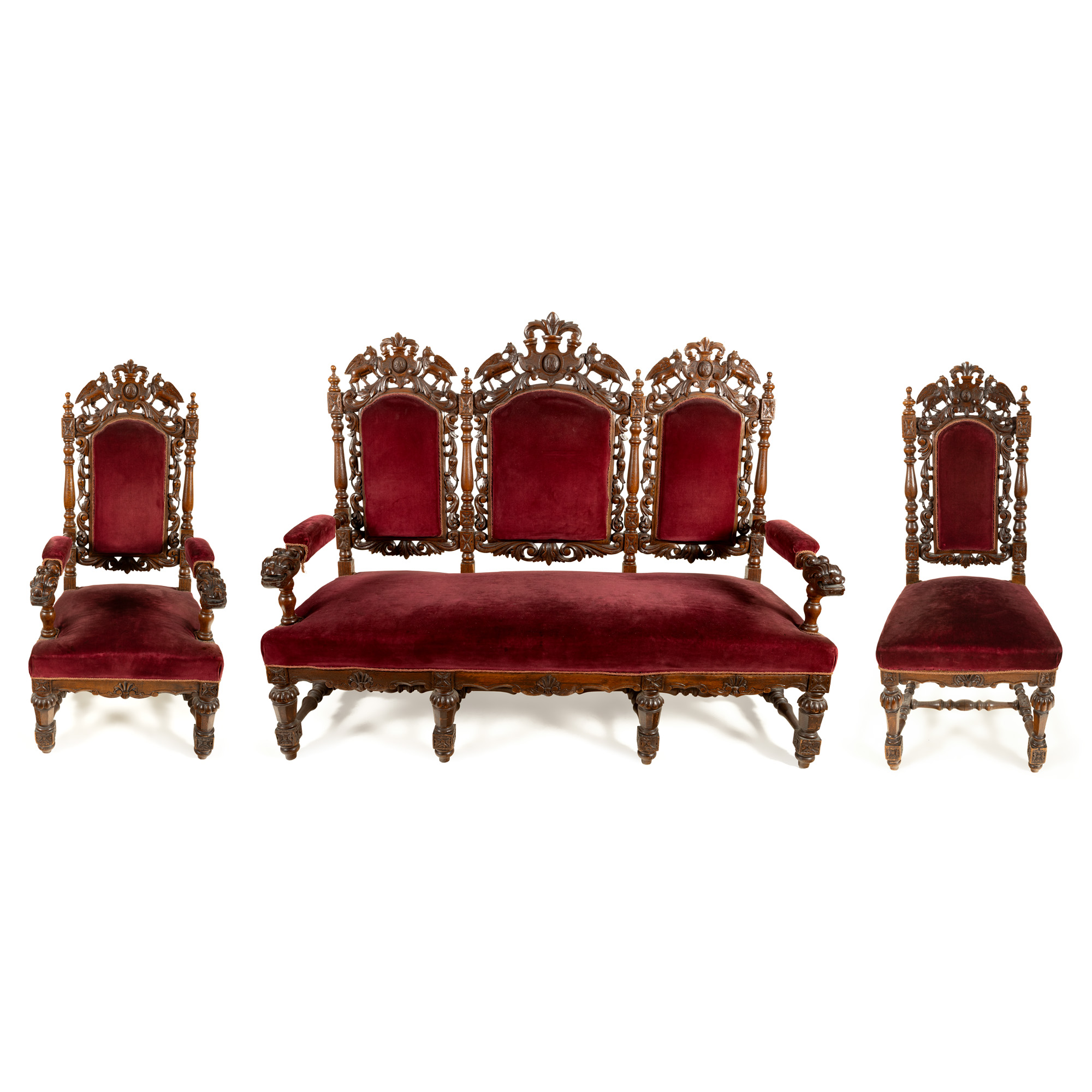 69. Garnitură pentru salon Neo-Gotic, formată din credență, masă, banchetă, pereche de scaune și fotolii, monogramată ”M”, sfârșitul sec. XIX