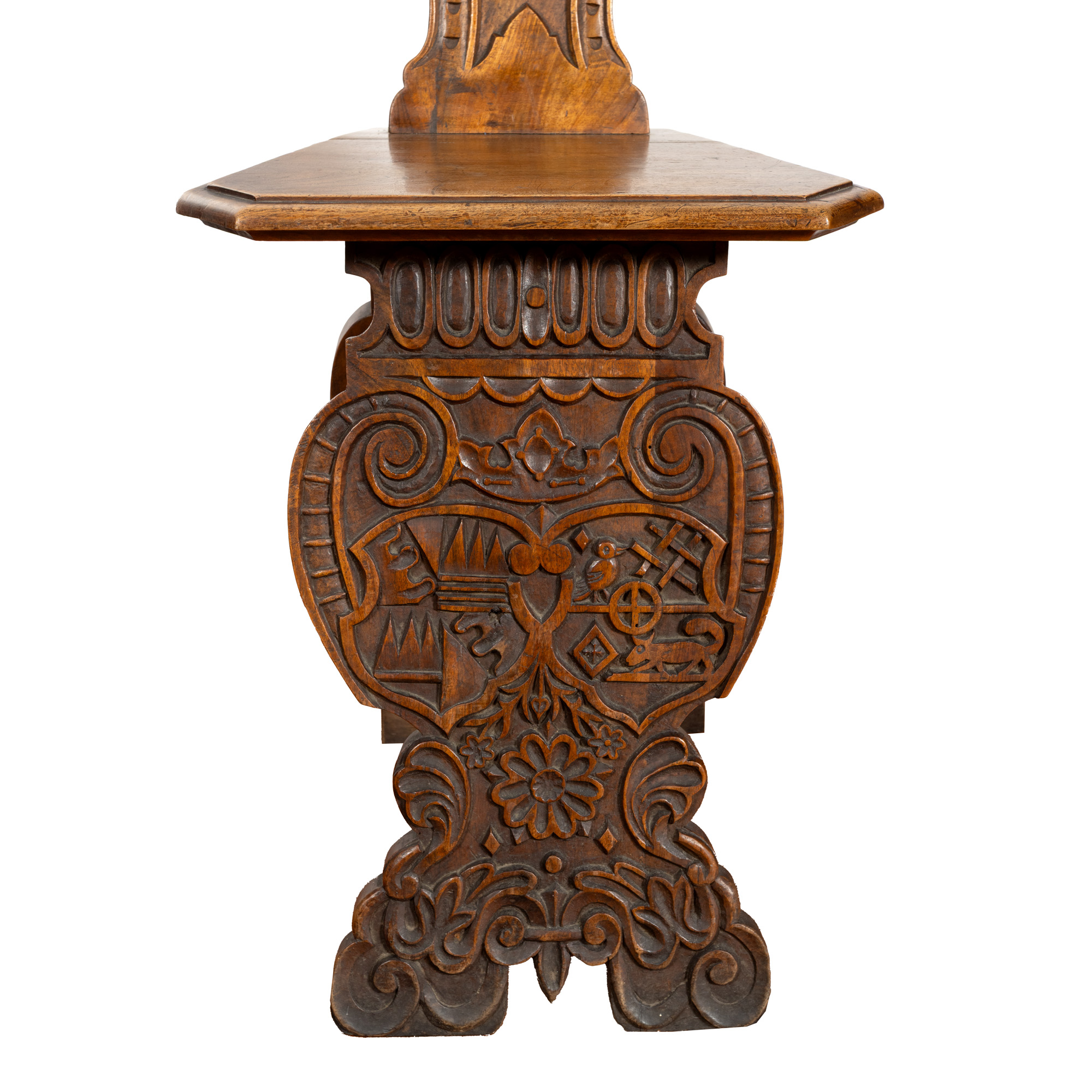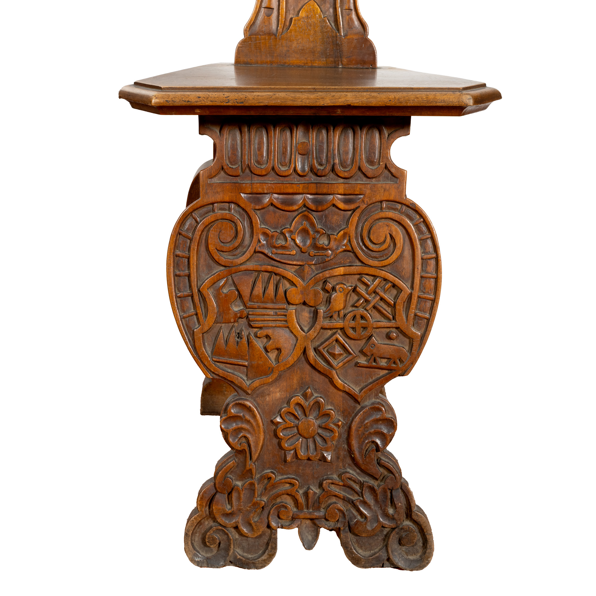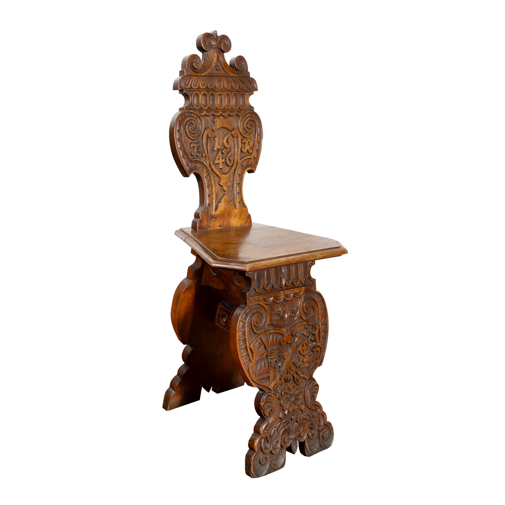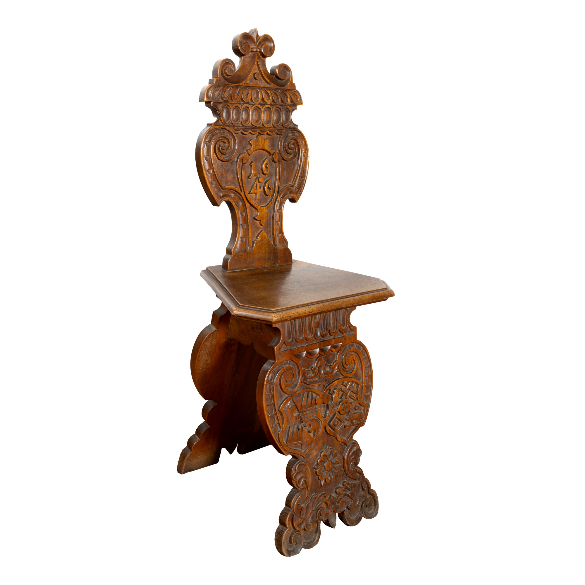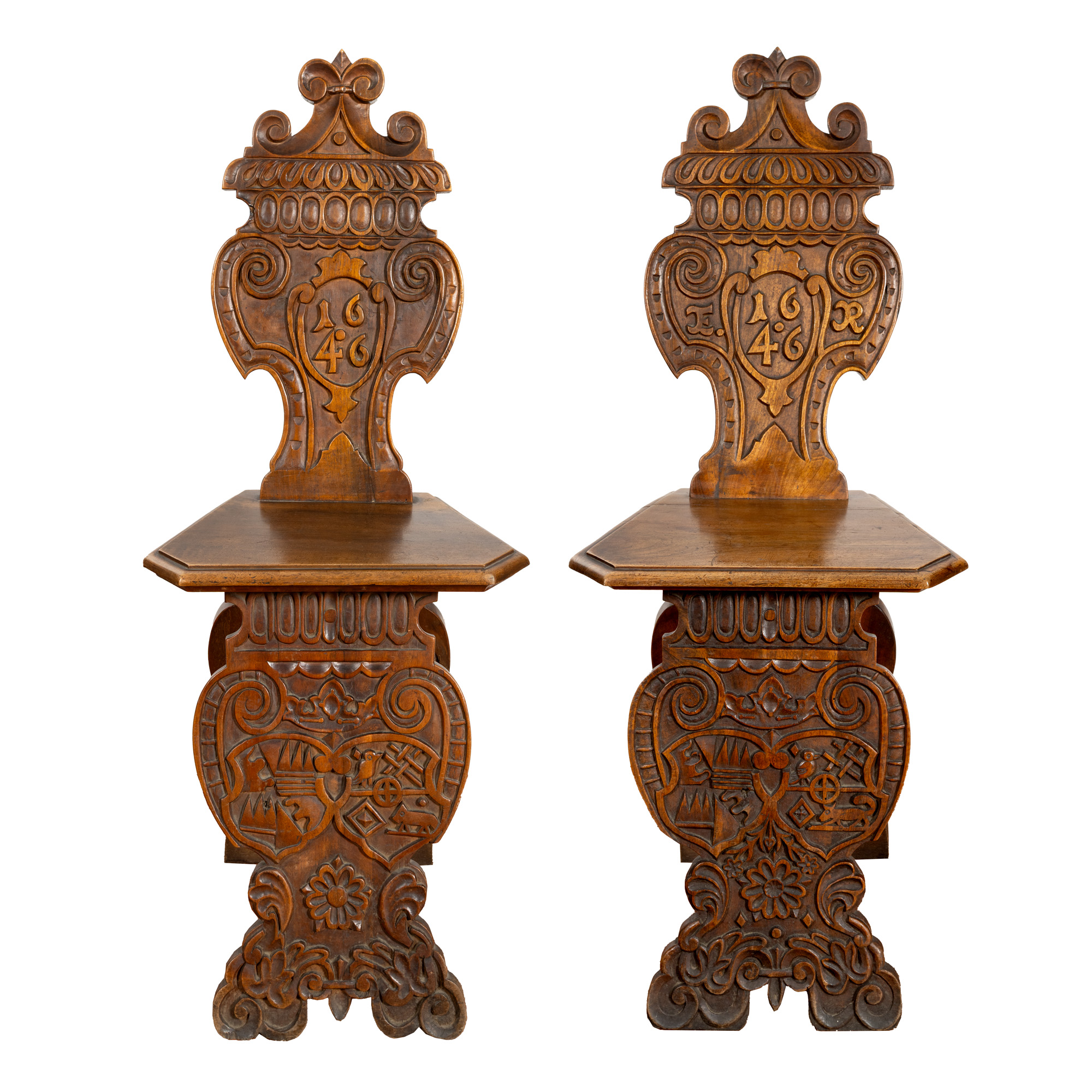 75. Pereche de scaune din lemn de stejar, datate 1646 și monogramate ”ER” (Elizabeth Regina - Elisabeta I a Marii Britanii), reinterpretare de sec. XIX