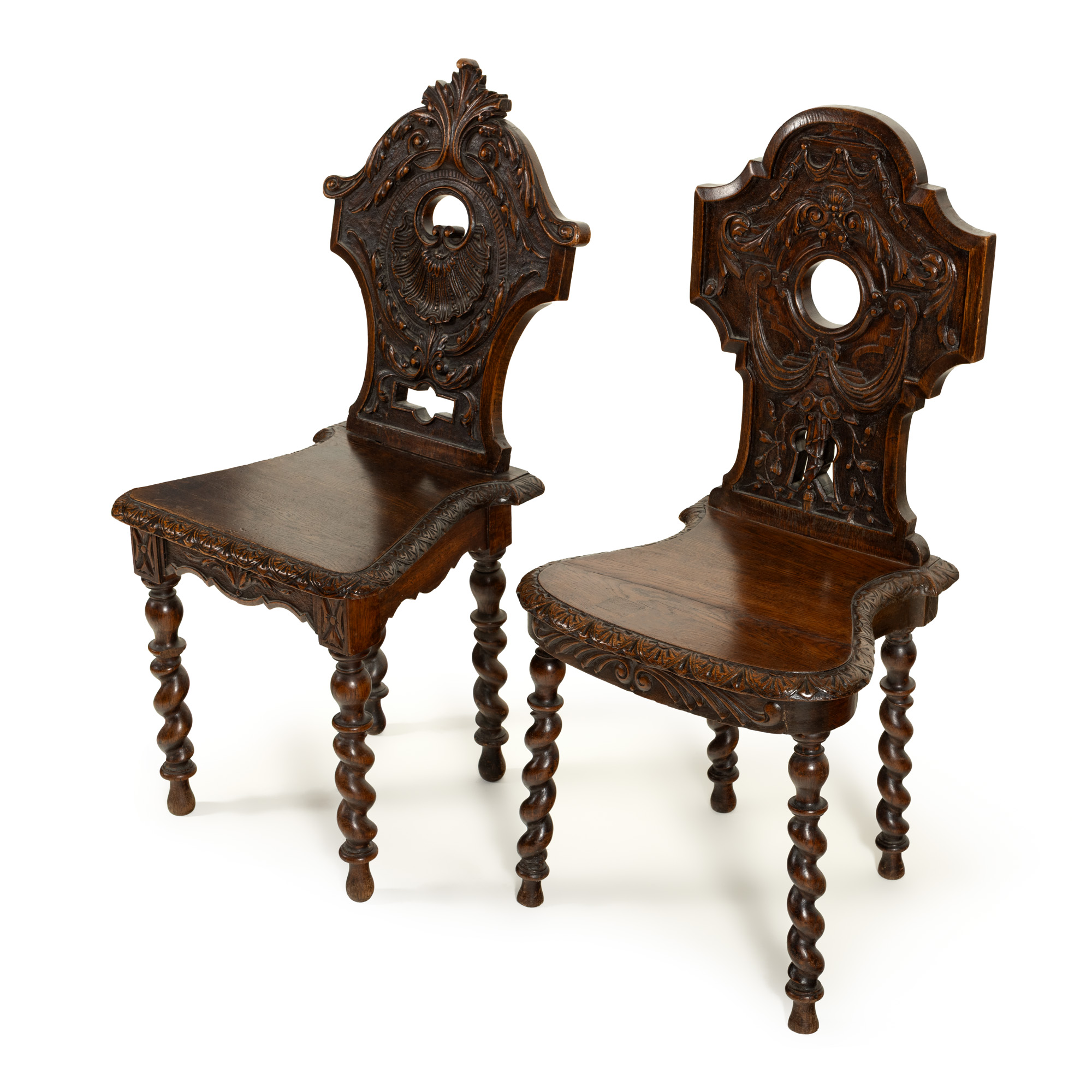 43. Pereche de scaune Neo-Baroce, el și ea, sculptate și picioare torsadate, sec. XIX