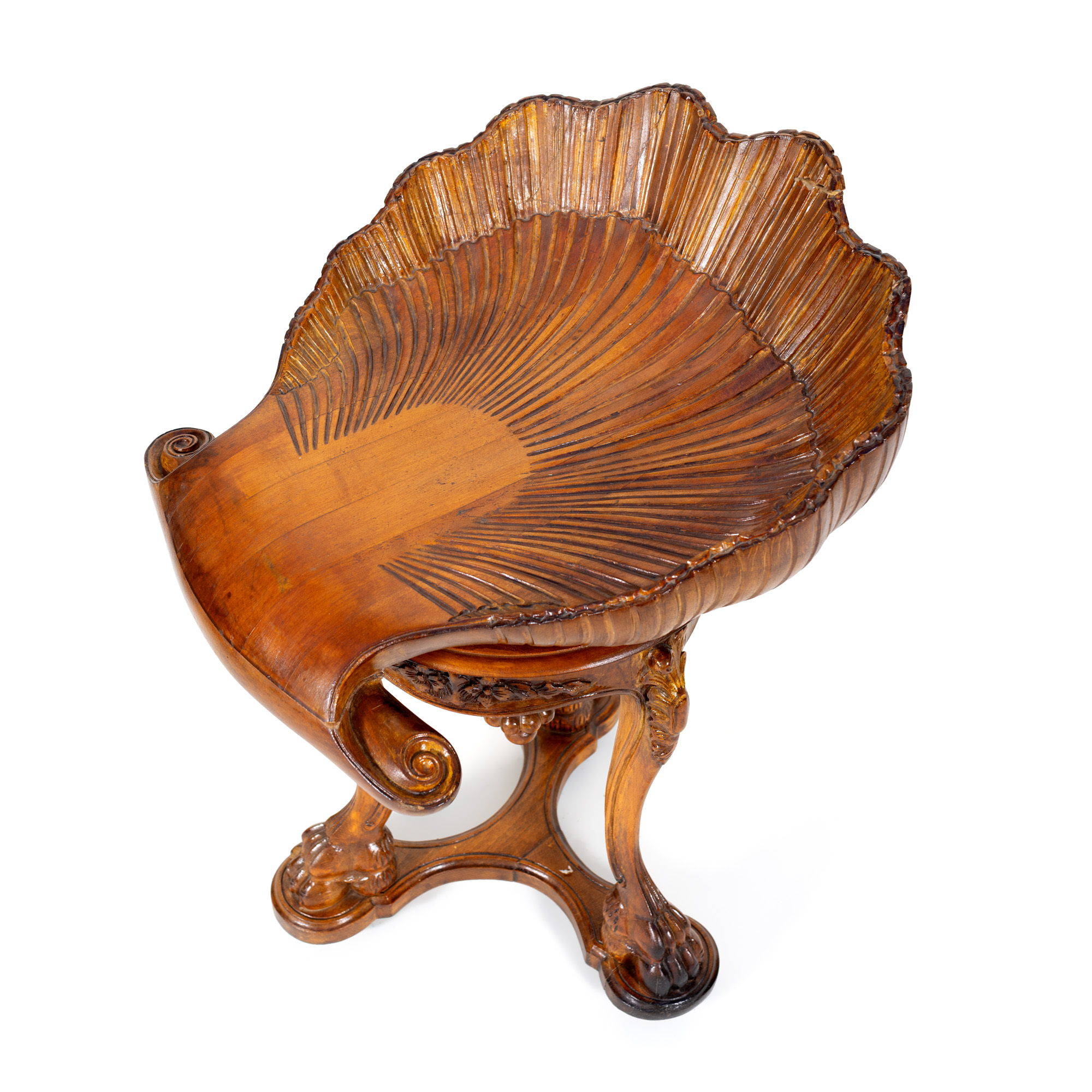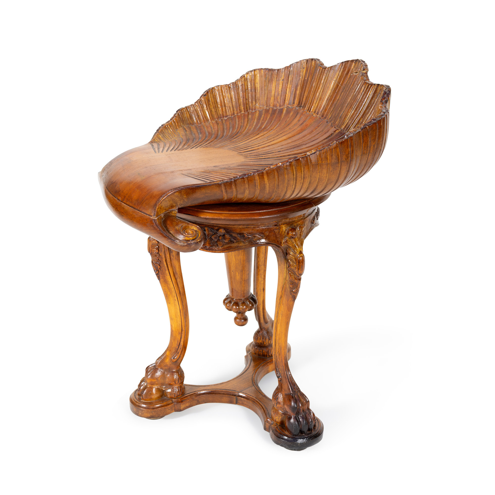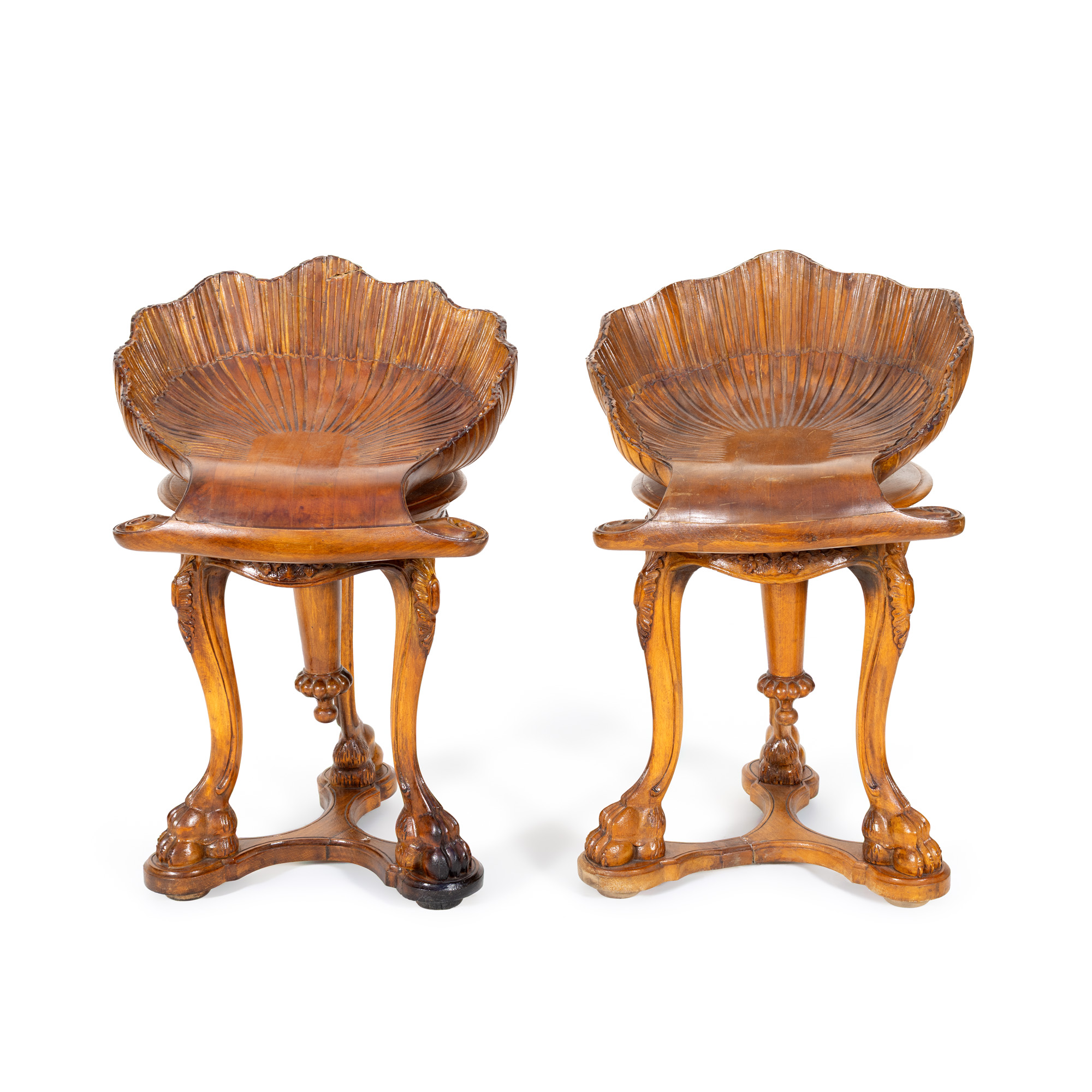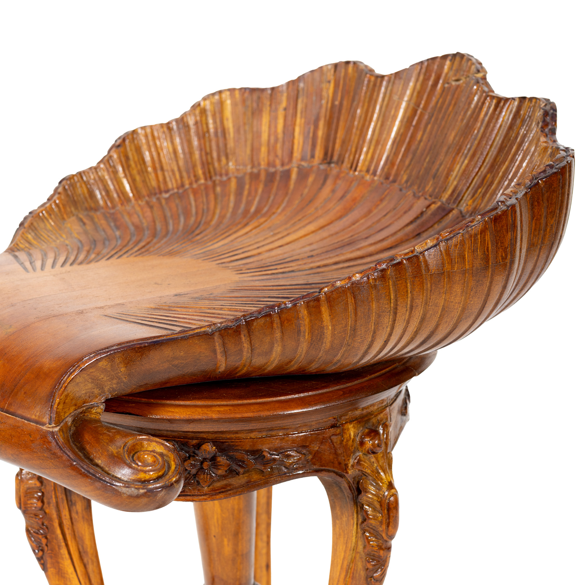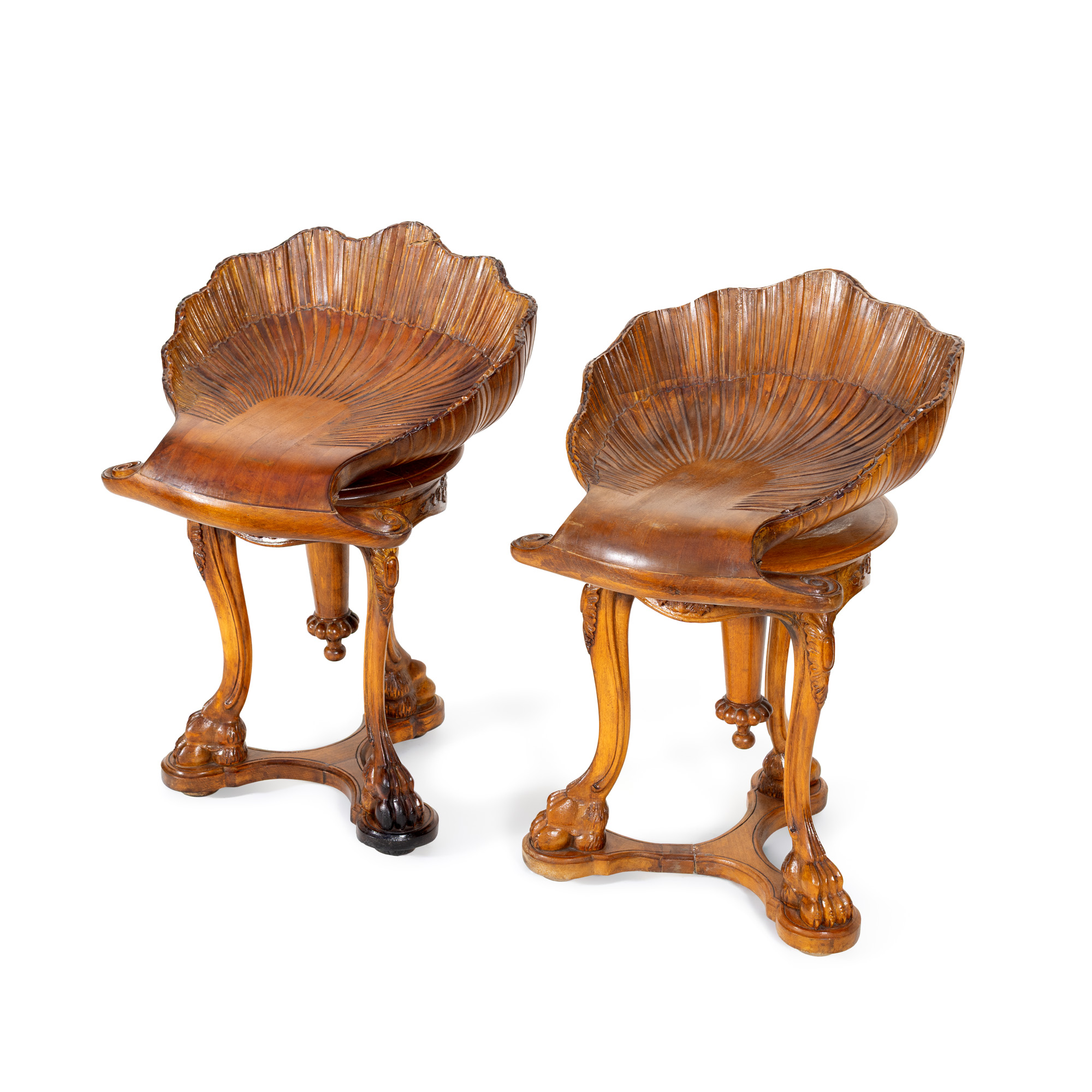 44. Superbă pereche de taburete din lemn de nuc, Neo-Rococo, sculptate sub formă de scoică, cca. 1900-1930