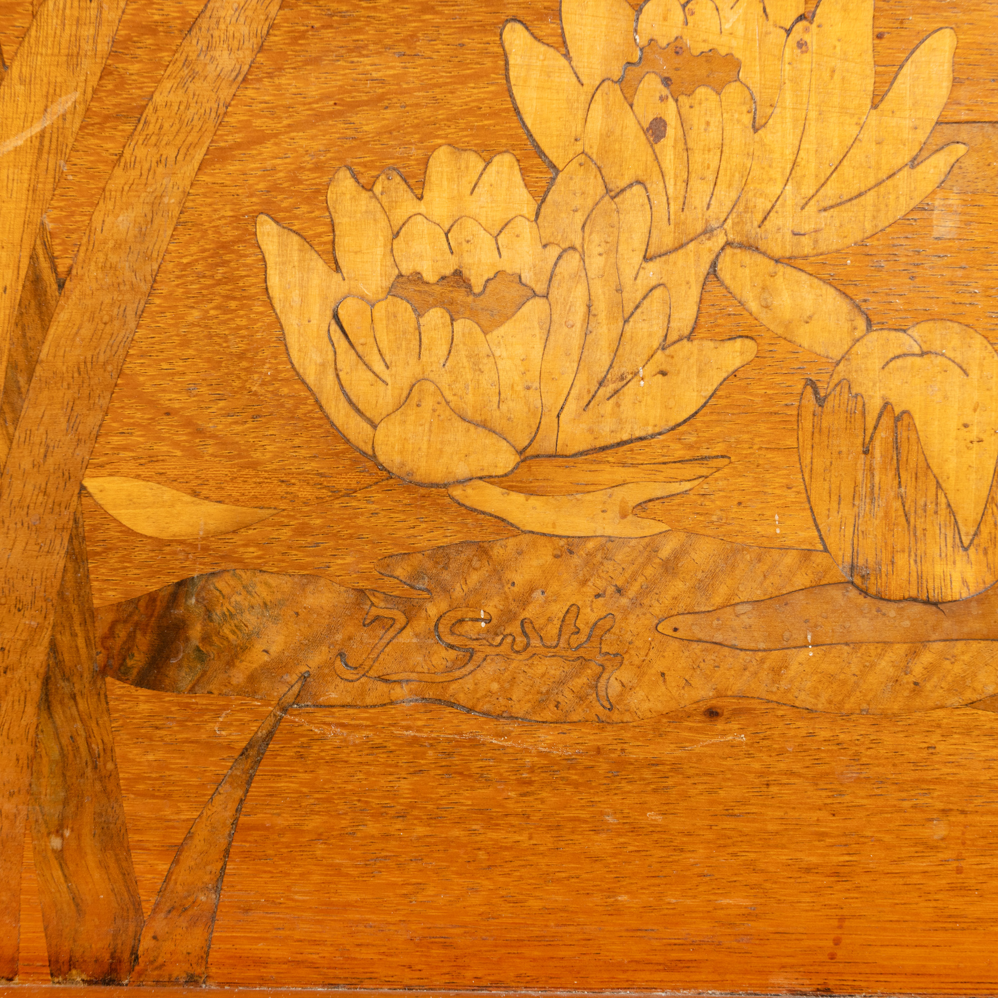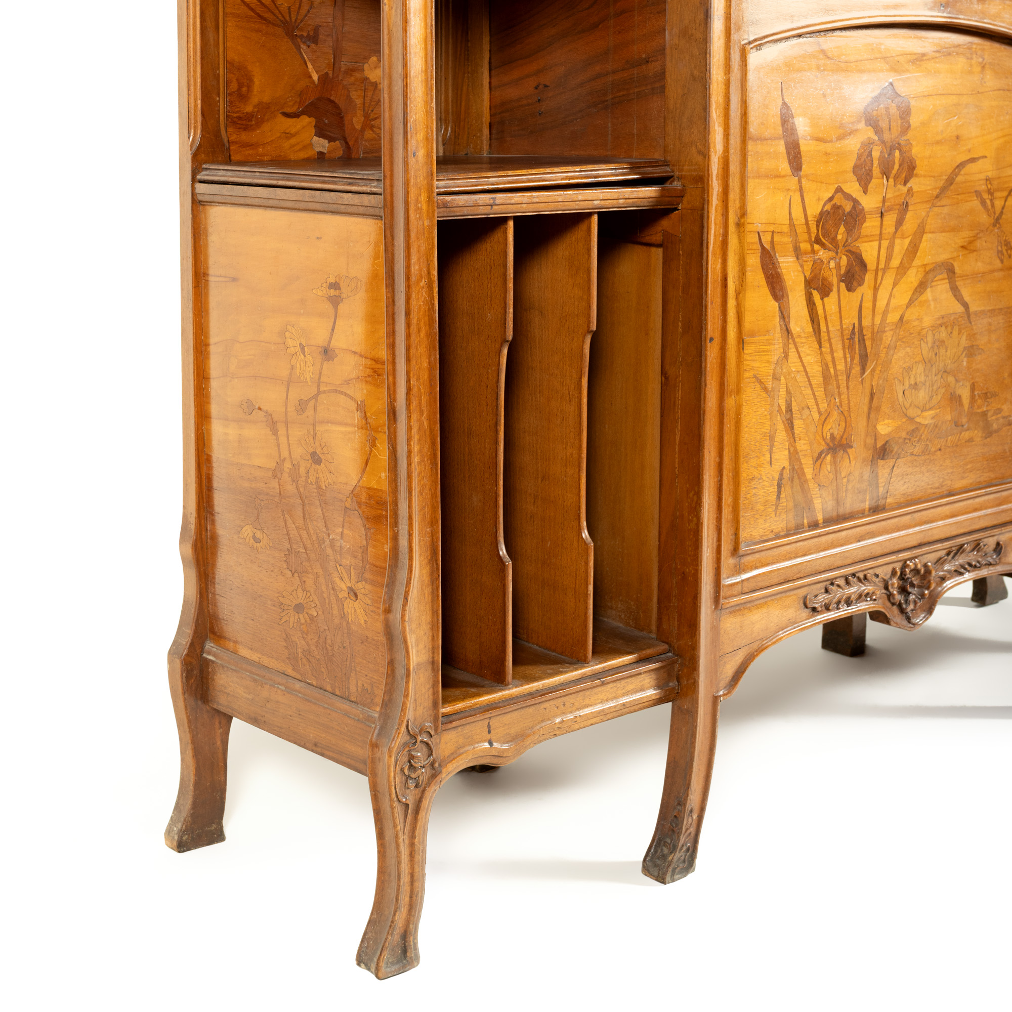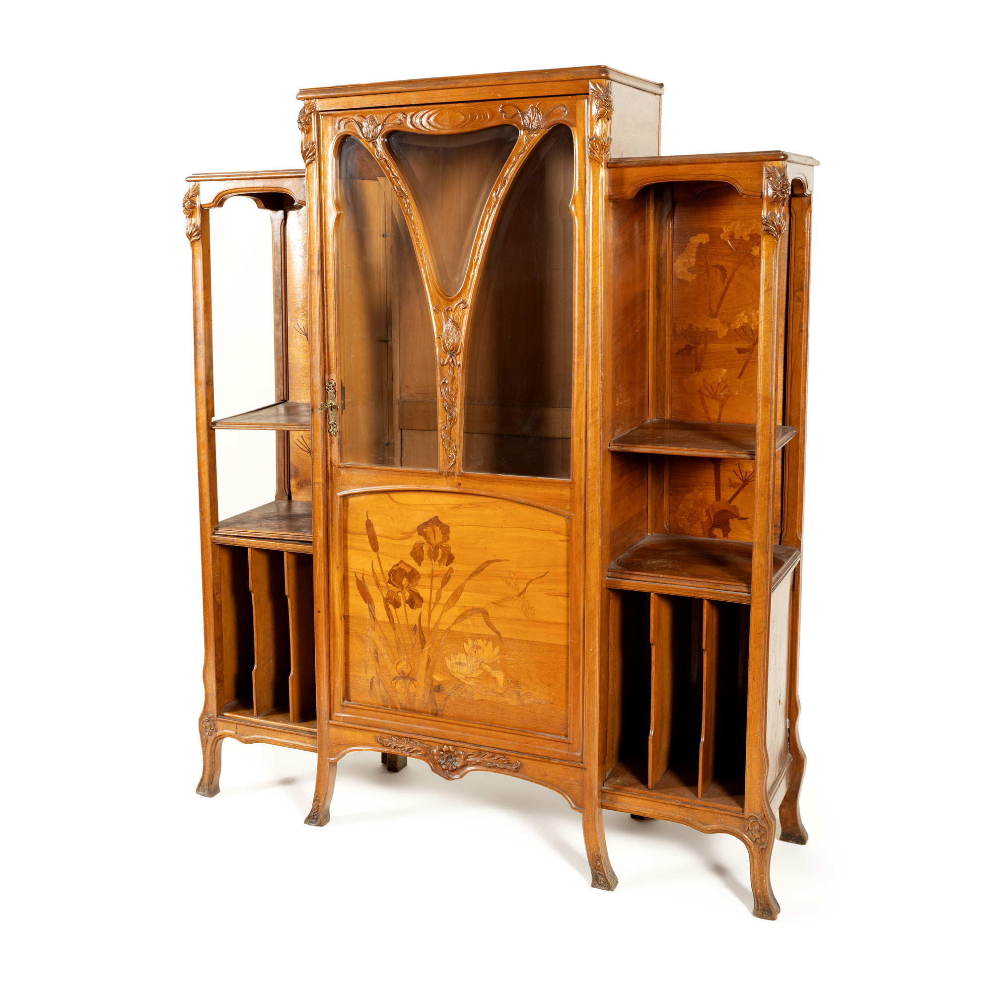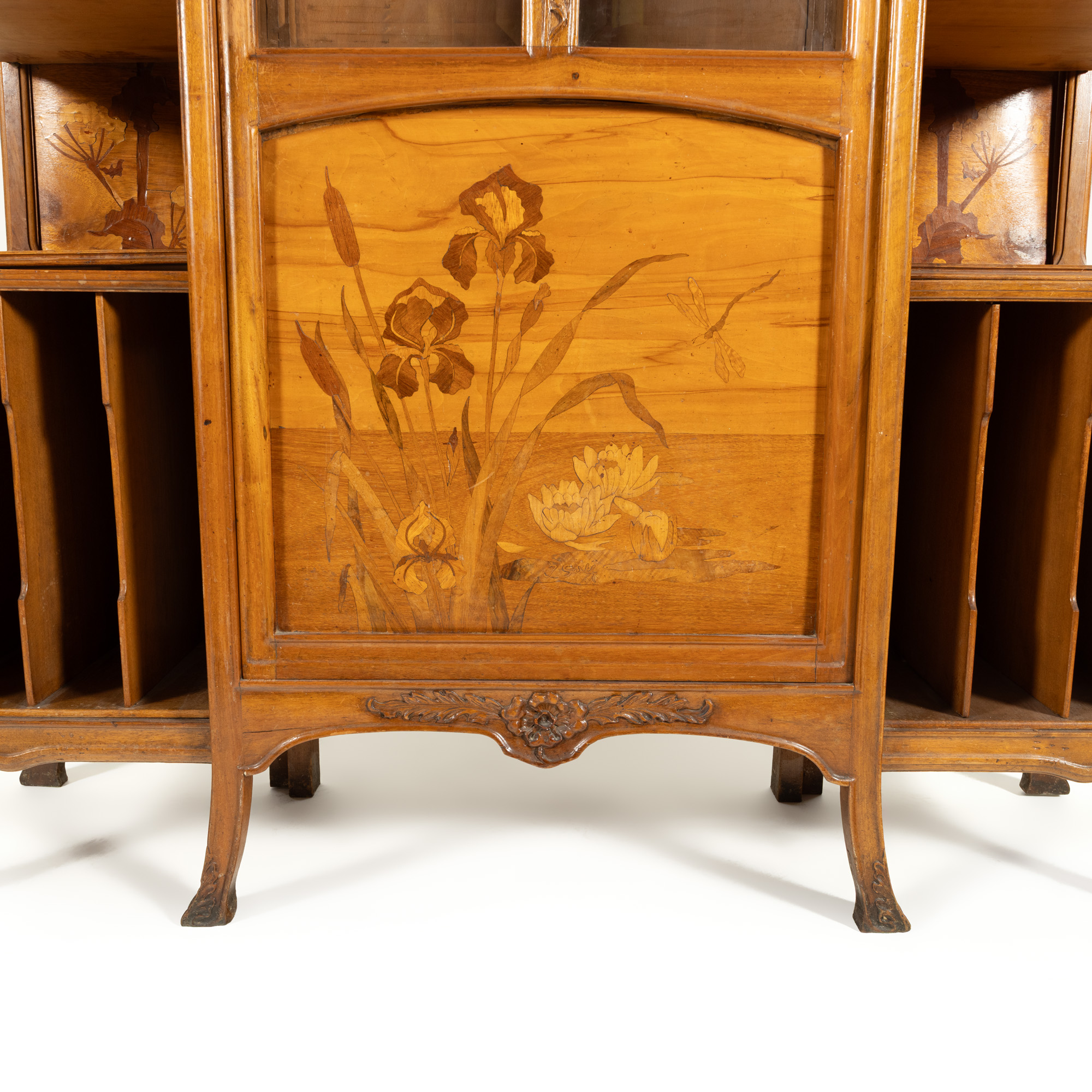 29. Vitrină Gallé, în stil Art Nouveau, din lemn de nuc, marchetată cu flori de iris, nuferi și libelulă, cca. 1905