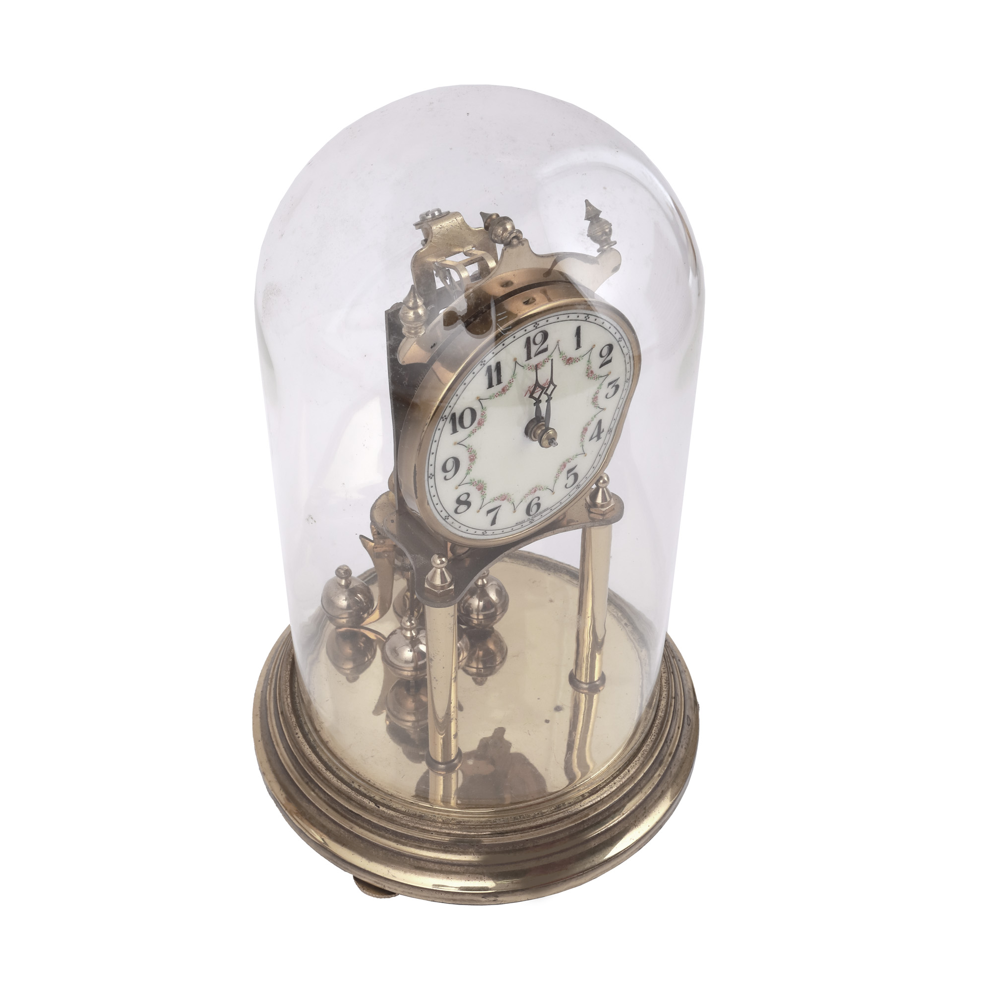 Ceas cu pendul pe bază circulară, cu cadran marcat cu cifre arabe și lambrechin floral, sub clopot de sticlă. Mecanismul necesită revizie.