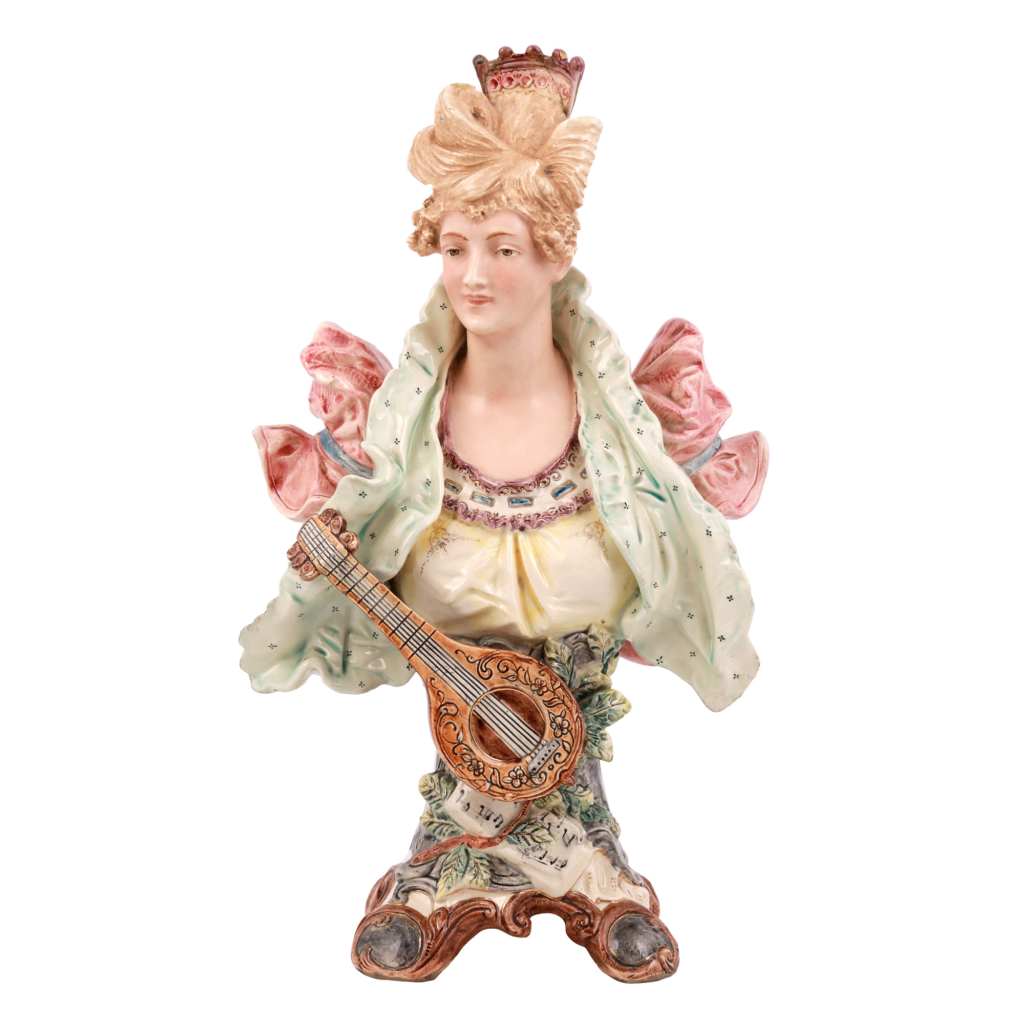90. Frumoasă statuetă modelată în porțelan pictat, curtezană cu chitară