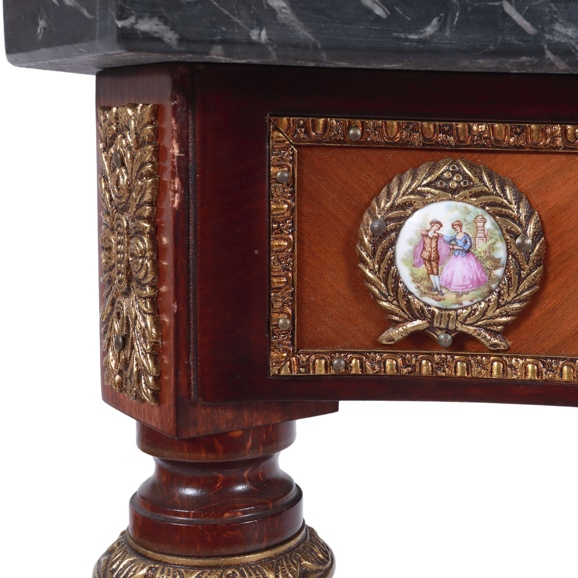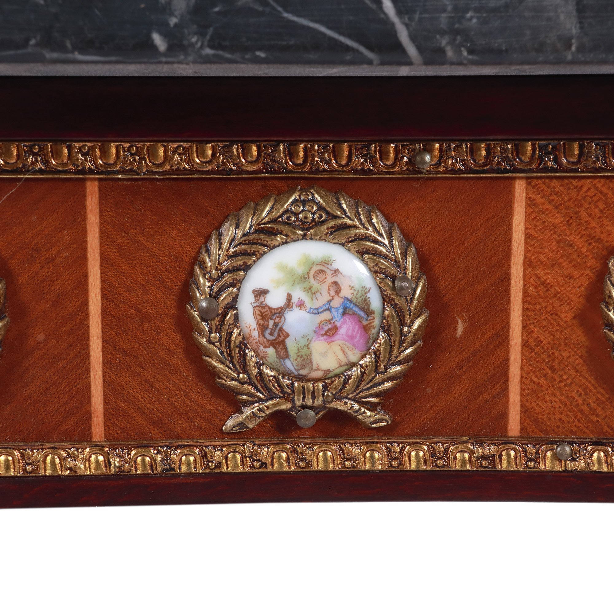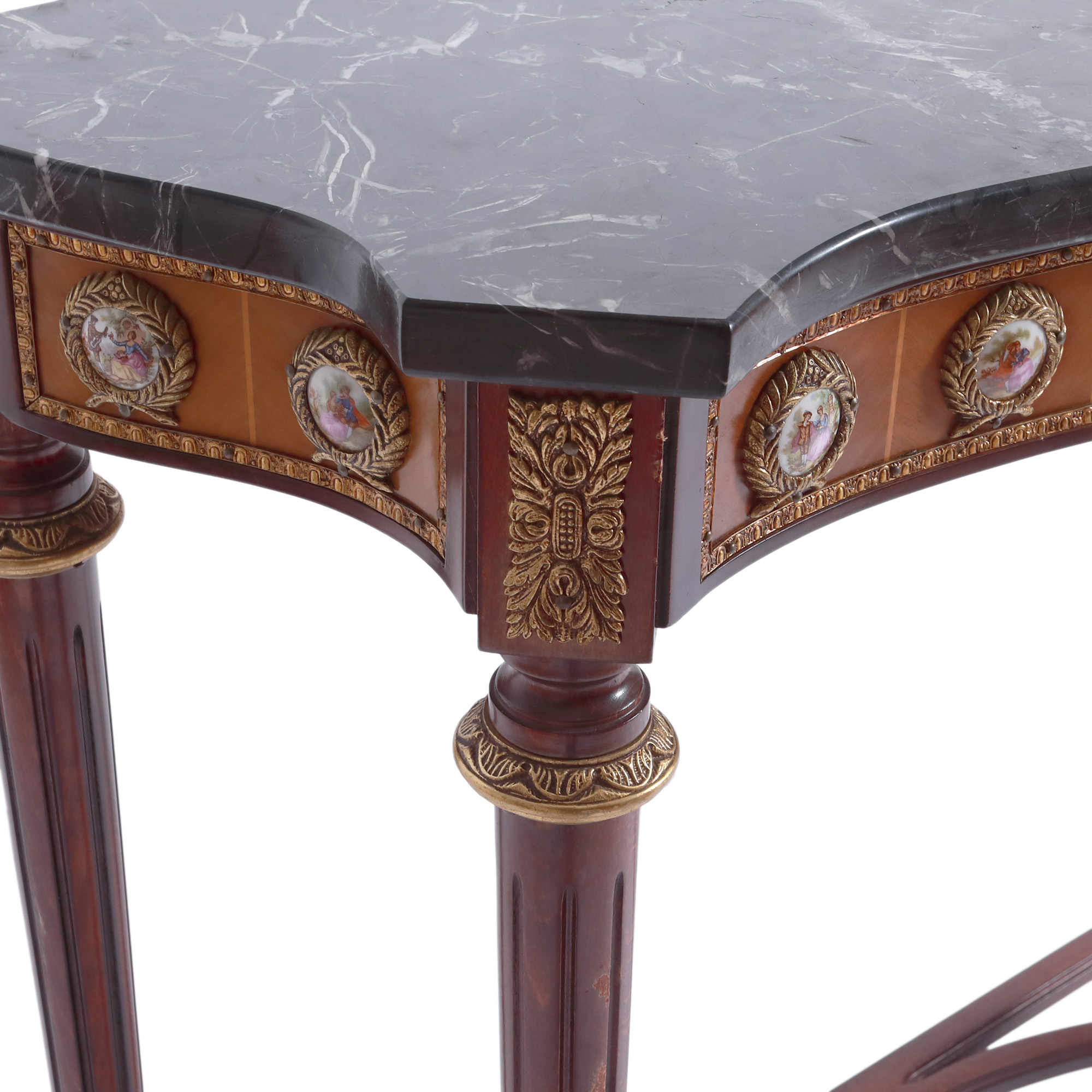 15. Superbă oglindă cu consolă Louis XV, decorată cu medalioane din porțelan pictat, ilustrând scene galante, Stil Rococo, prima jumătate a sec. XX
