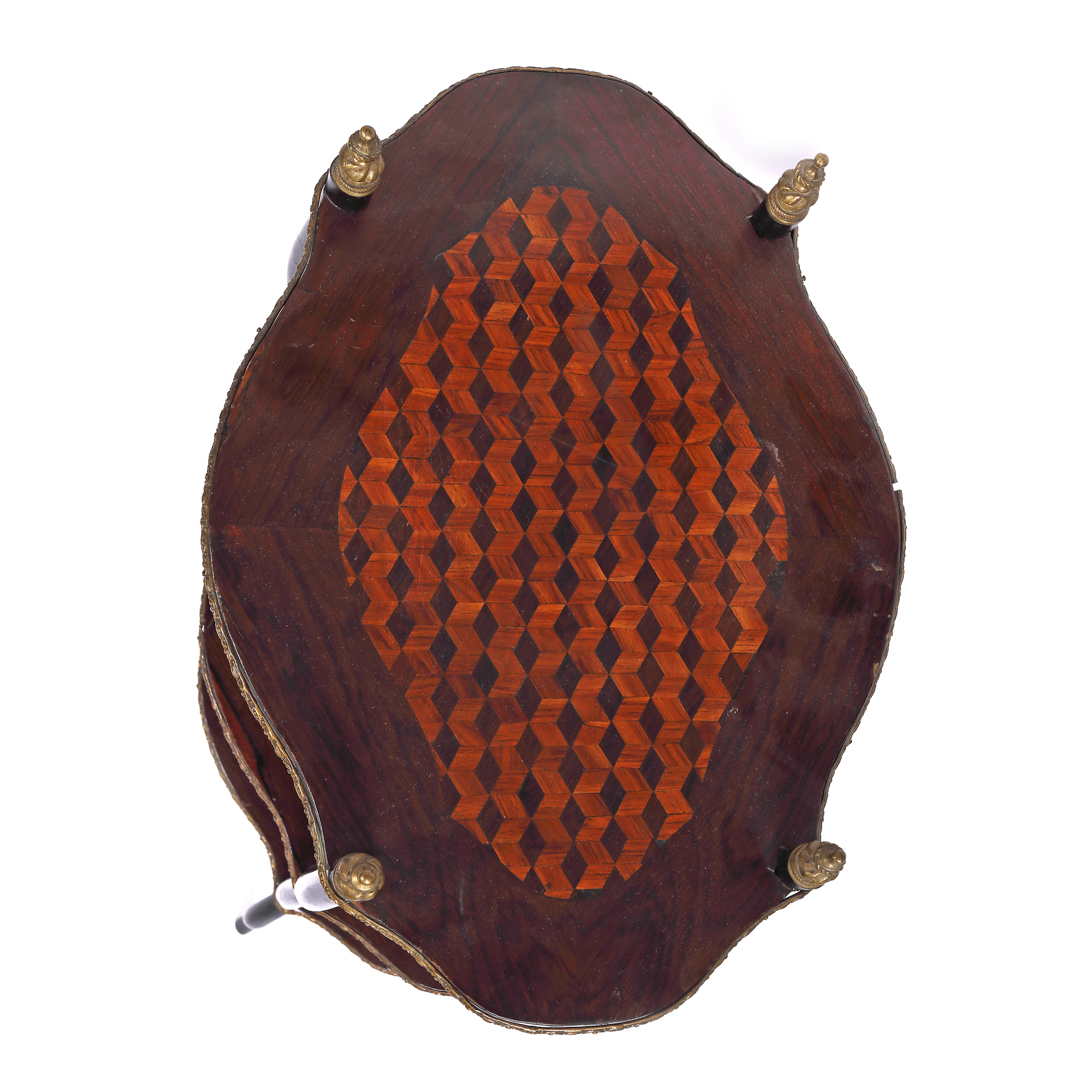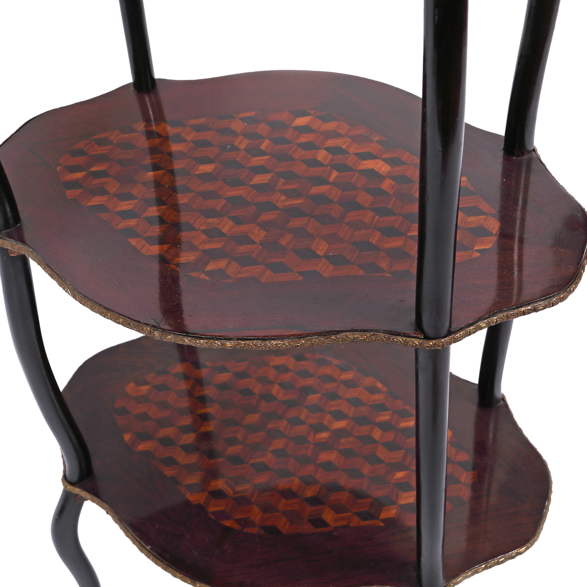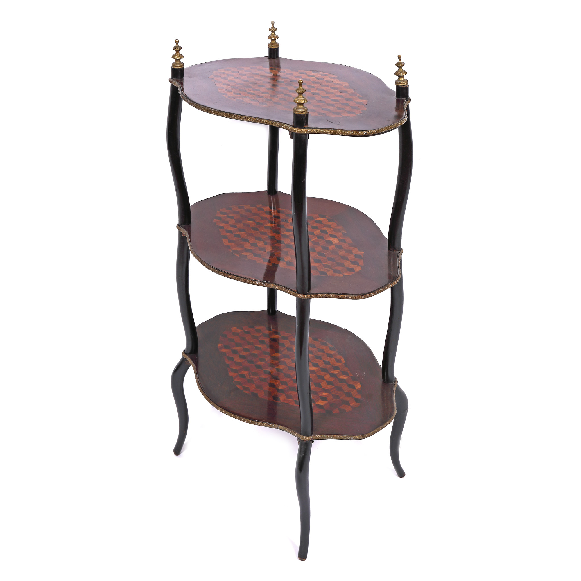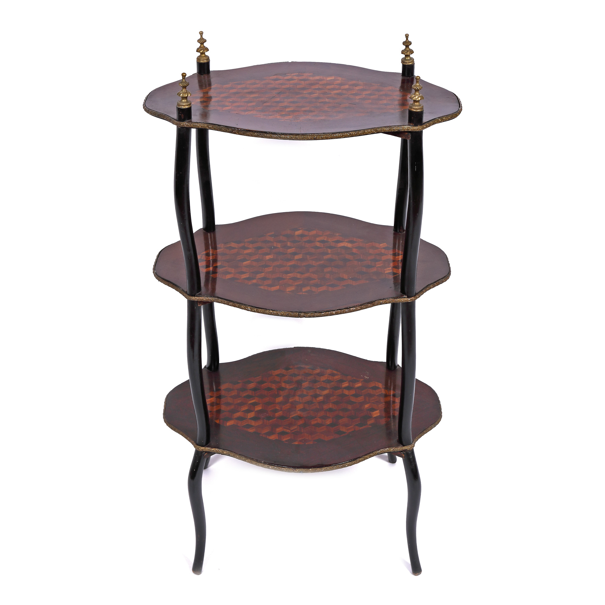 83. Etajeră cu trei rafuri în manieră Napoelon III, decorată cu marchetărie în model cubic, sec. XX