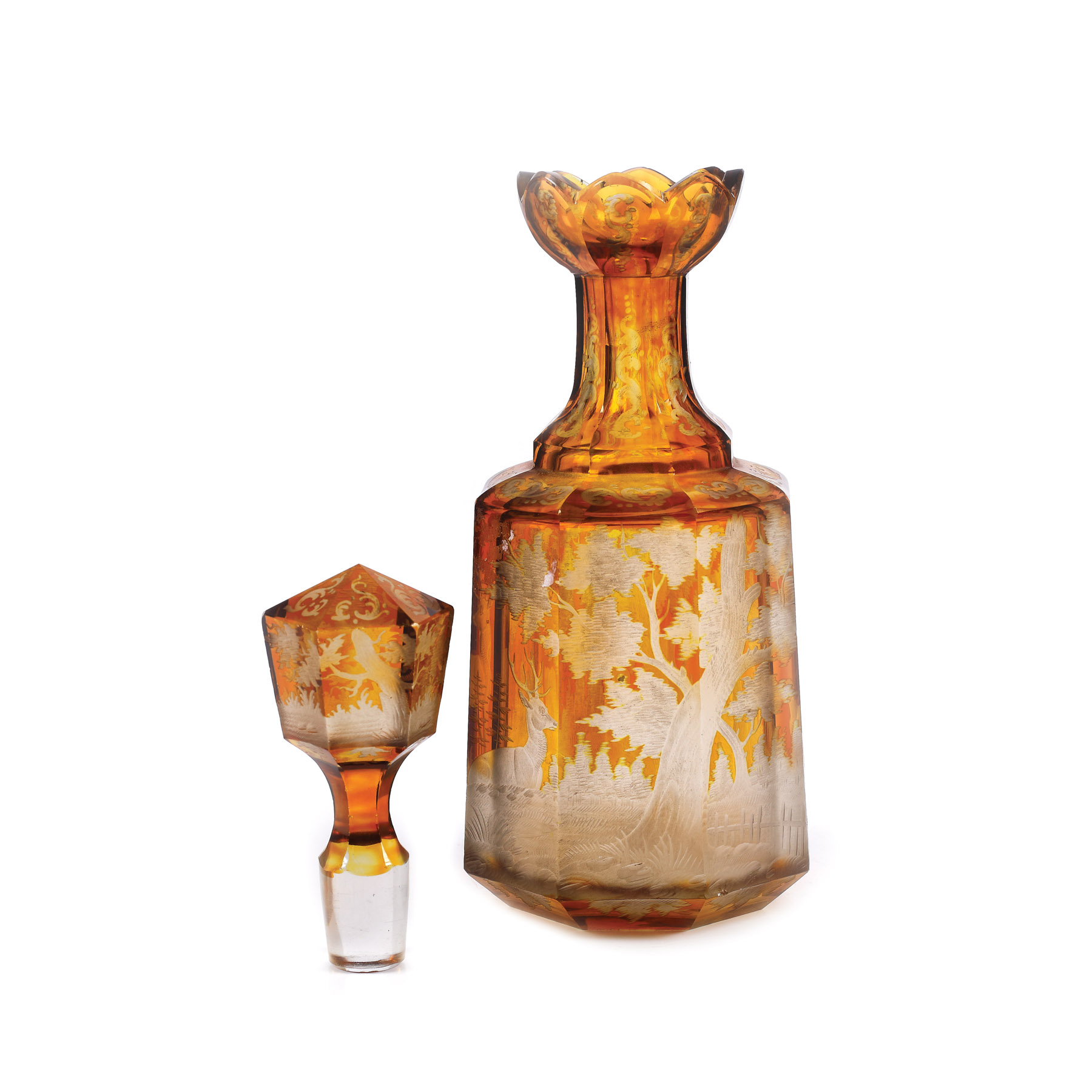 100. Flacon din cristal bohemian, gravat cu simboluri cinegetice, începutul sec. XX