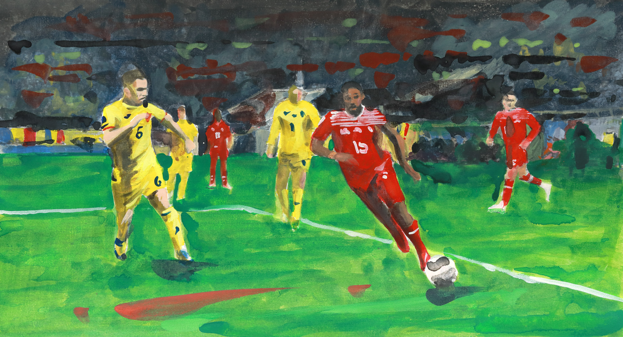 6. Lot format din tricou model EURO 2024, de joc, al meciului România - Ucraina, titular Marius Marin (6), semnat autograf, și acuarelă reprezentându-l pe sportiv, realizată de Ana-Raluca Niță (n. 2007, București)