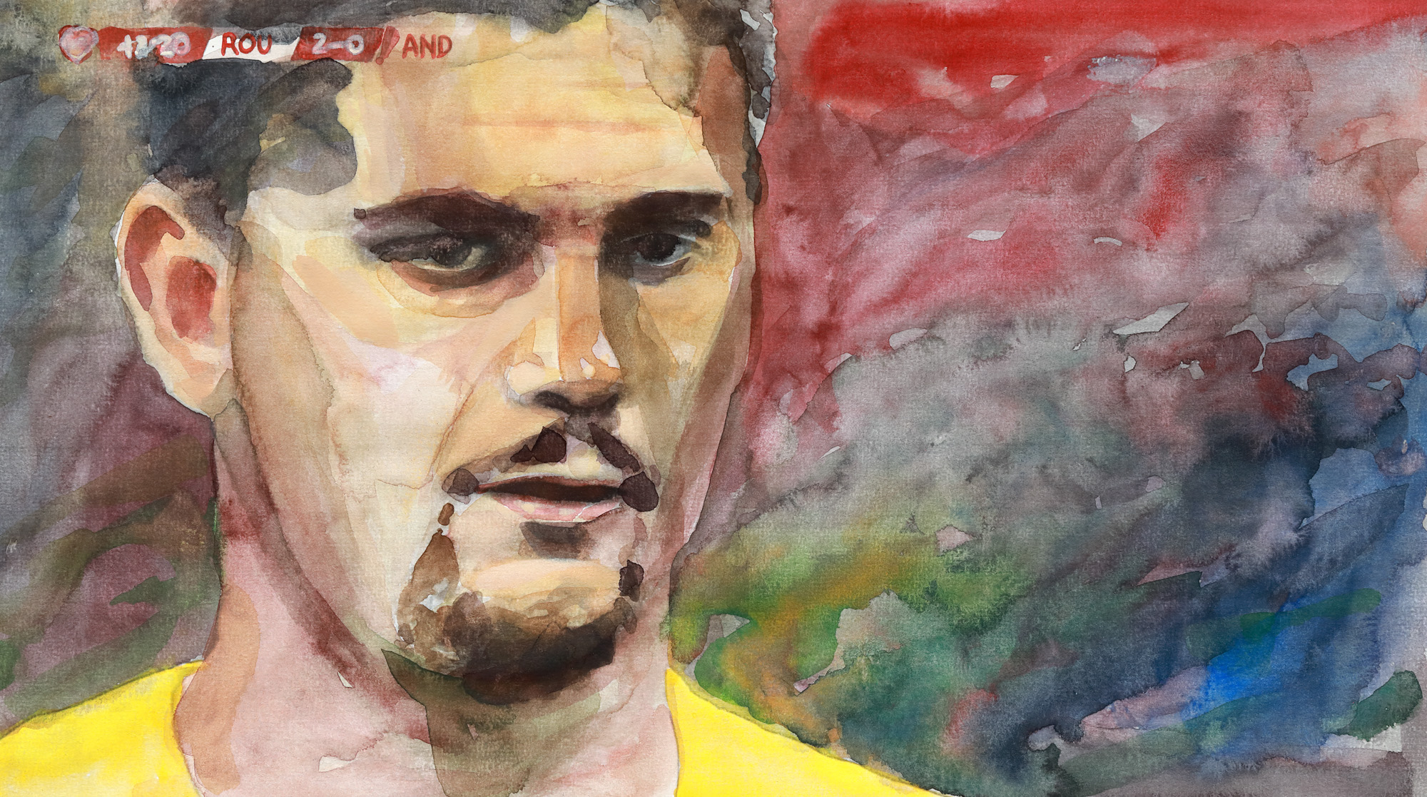 18. Lot format din tricou model EURO 2024, de joc, al meciului România - Ucraina, titular Răzvan Marin (18), semnat autograf, și acuarelă reprezentându-l pe sportiv, realizată de Andra Mânzu (n. 2007, București)