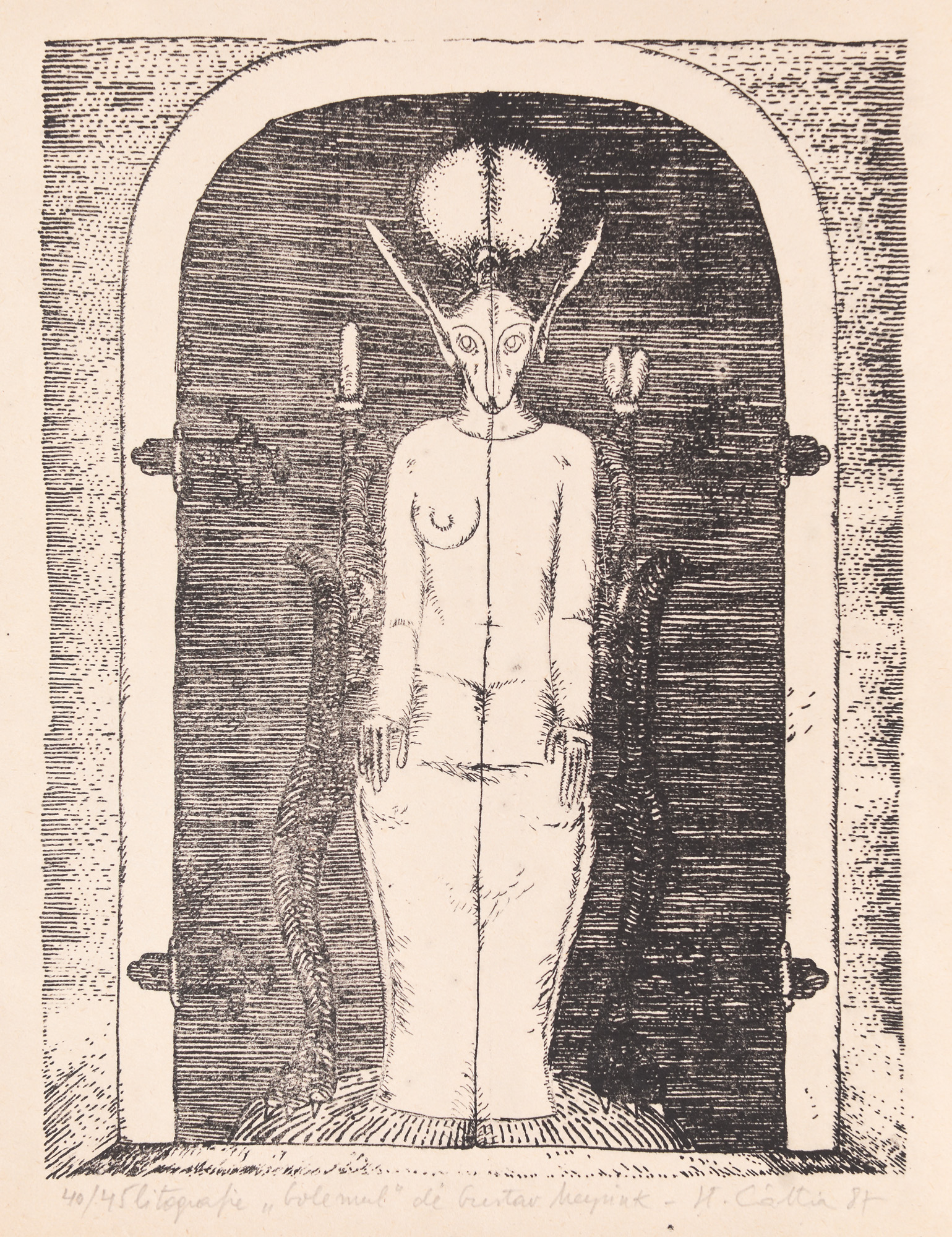 semnat, datat, intitulat, numerotat și notat central jos, în creion, "Șt. Câlția, (19)87, Golemul de Gustav Meyrink, 40/45"