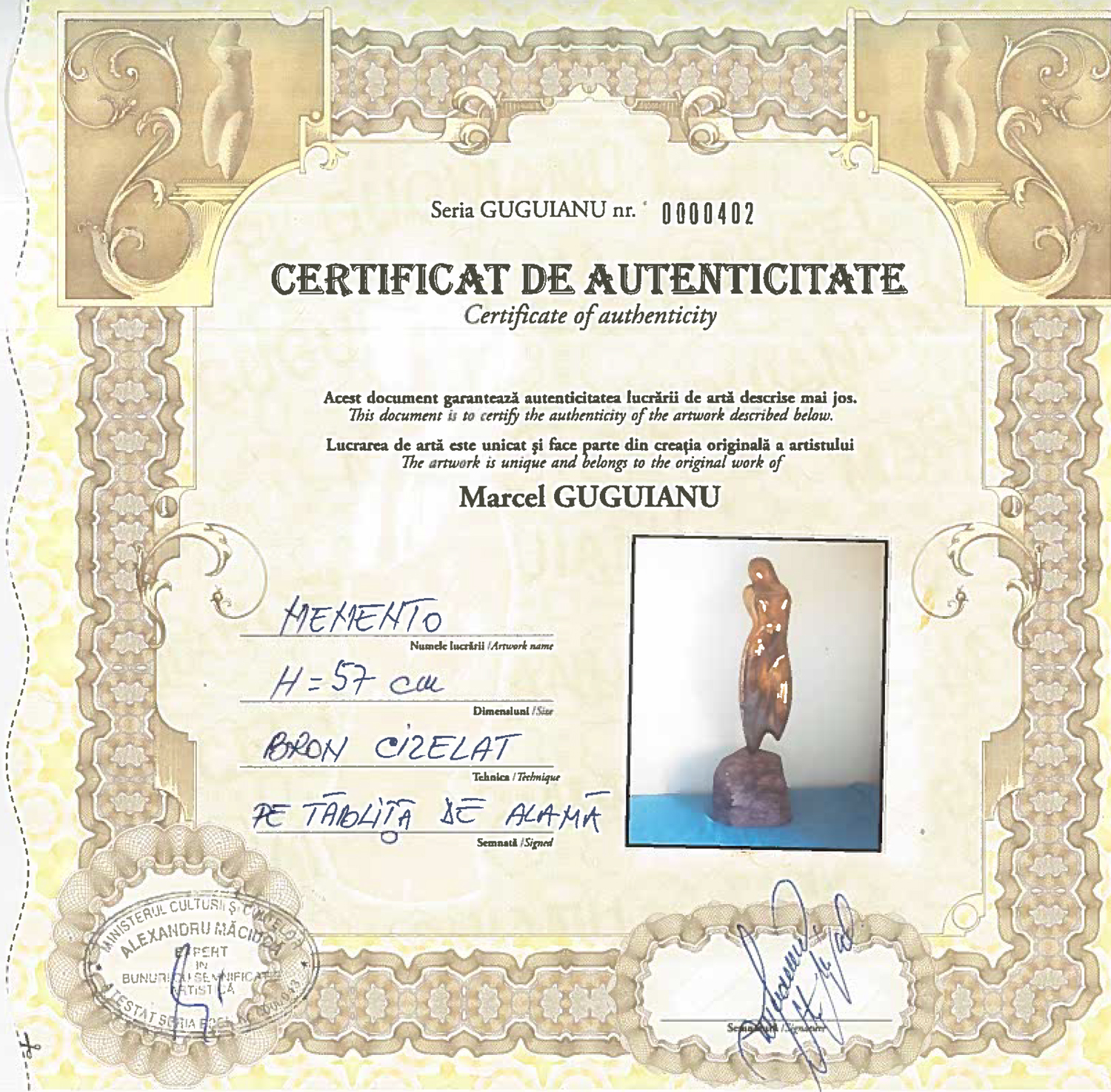 Opera vine însoțită de certificat de autenticitate.