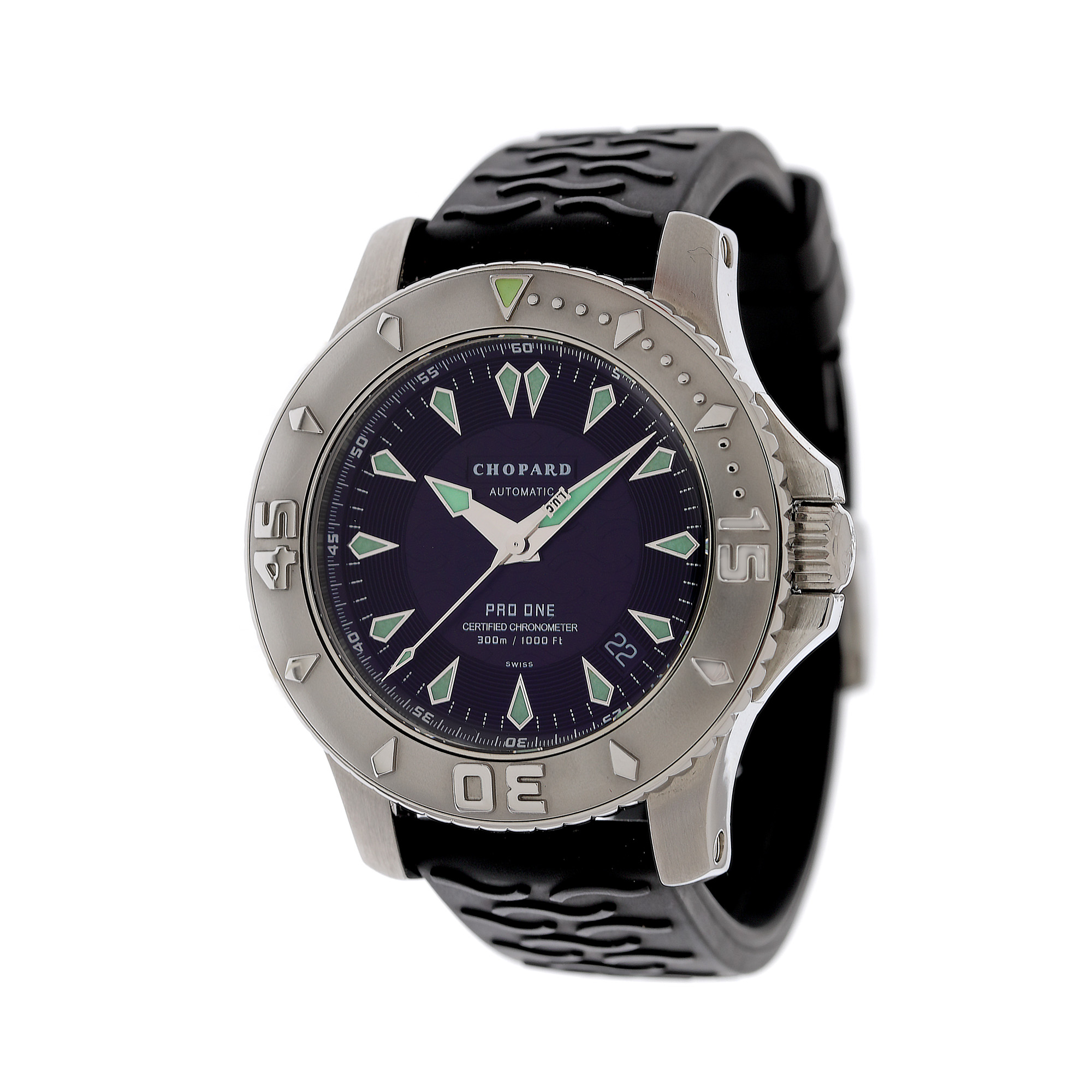 Ceas Chopard L.U.C. Pro One Diver, de mână, bărbătesc, referință 168912 3002. Mecanism automatic, calibrul 4.96, bezel mobil unidirecțional. Cadran culoare negru, decorat în relief, indici triunghiulari, cu un registru pentru dată situat între orele 4 și 5. Curea originală, din cauciuc, de culoare neagră, cu sistem de închidere de tip clasic. Accesorii: Card de garanție și fișă service.