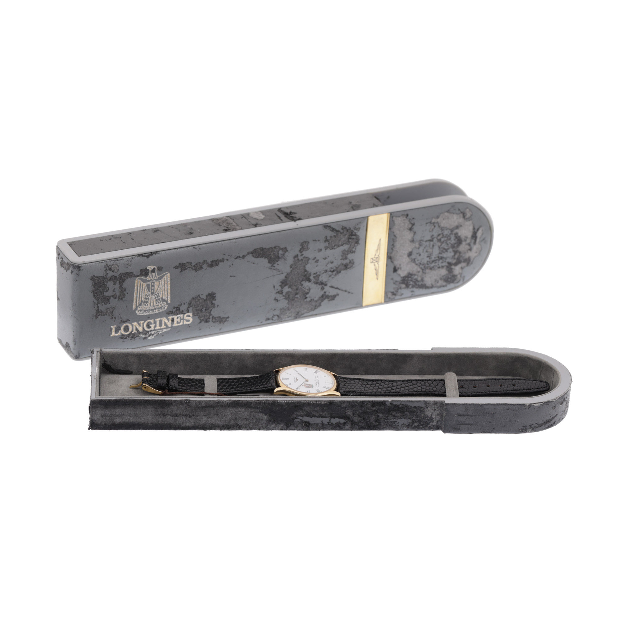 95. Ceas Longines Gents, de mână, bărbătesc, ediție limitată, comandă specială, decorat cu stema Irakului și cu mențiune cu privire la materialul simbolic intrat în aliajul de fabricație, cadou de protocol din partea lui Saddam Hussein, în cutia originală, a aparținut politicianului Corneliu Vadim Tudor [Cca. 1990]