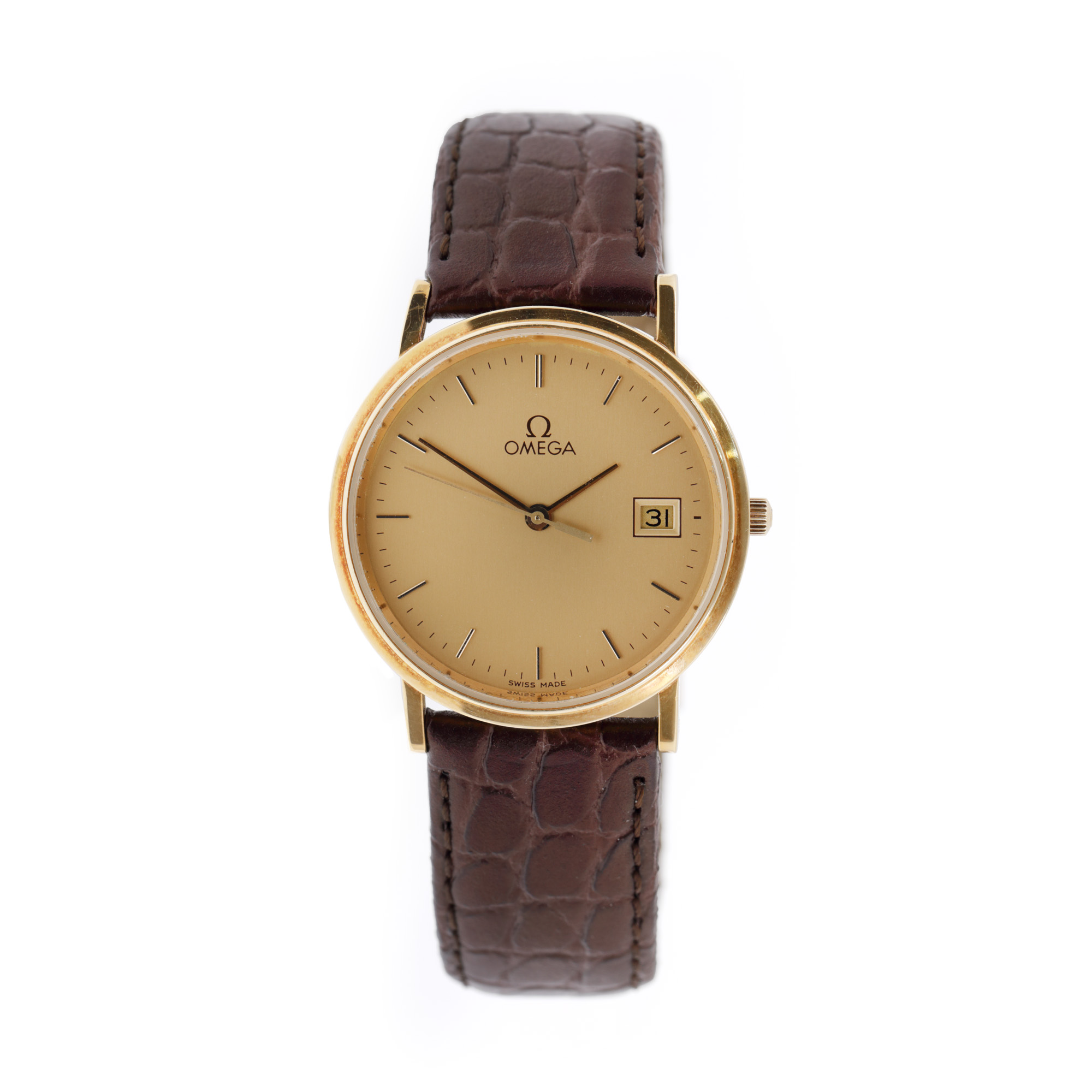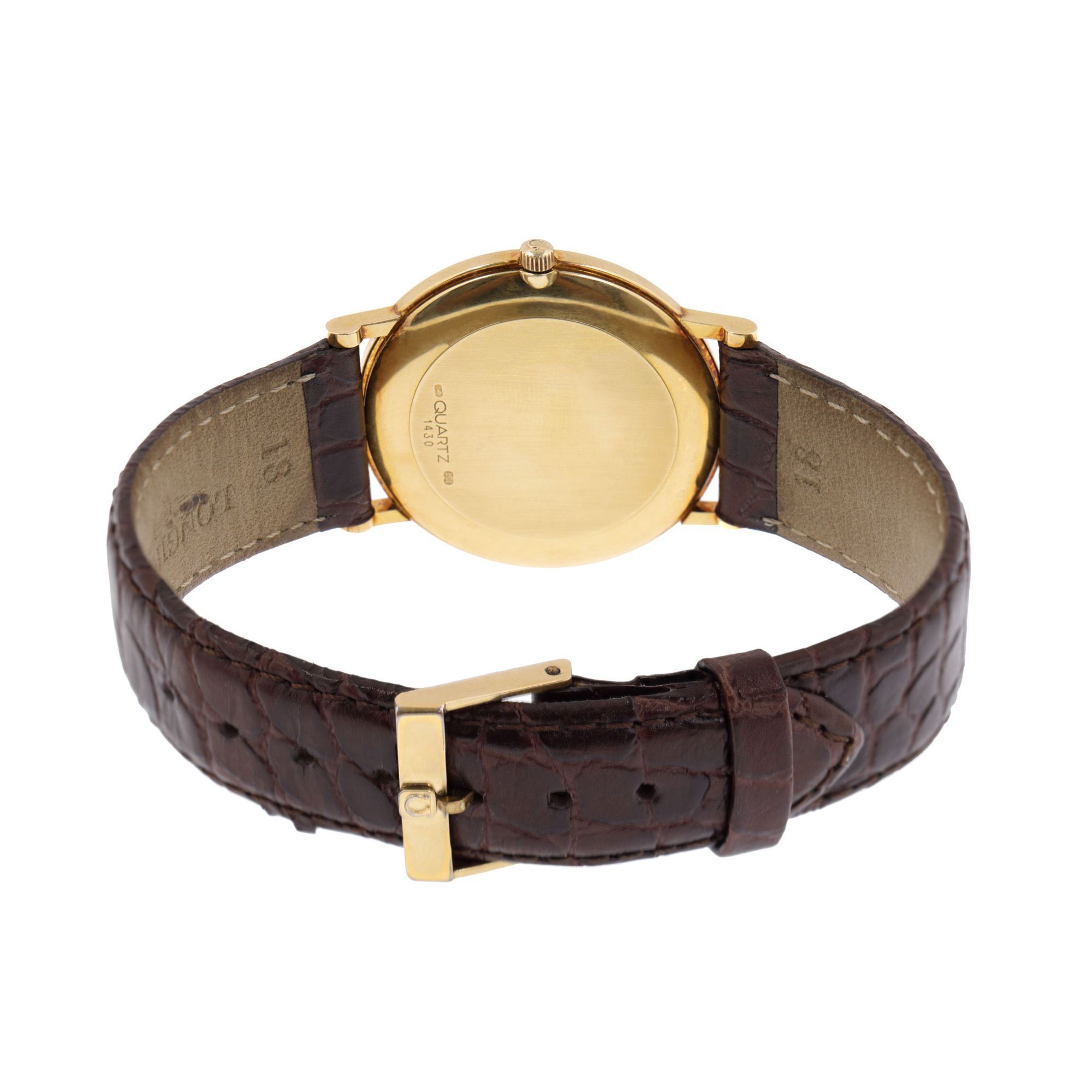 Ceas Omega din aur, de mână, bărbătesc, referință 1430, mecanism quartz. Cadran de culoare auriu, cu indici orari din aur și registru pentru dată în dreptul orei 3. Curea din piele, adăugată aftermarket, de culoare maro, cu catarama originală, cu sistem de închidere de tip clasic.