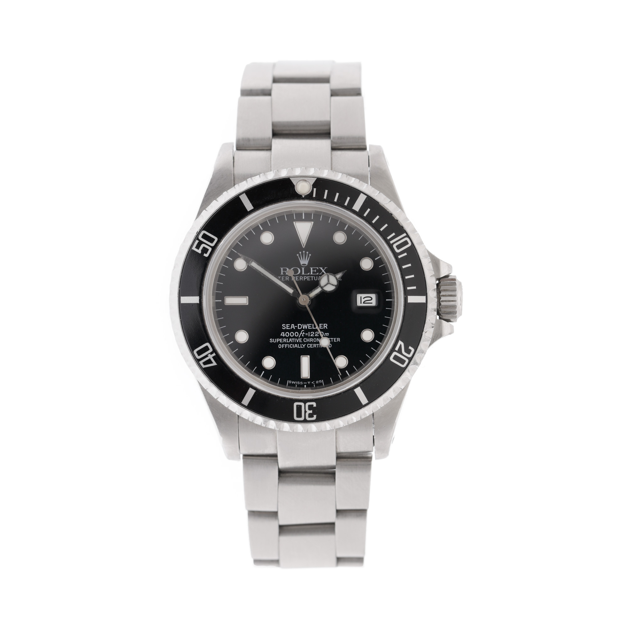 Ceas Rolex Sea Dweller, de mână, bărbătesc, referință 116660. Mecanism automatic, calibrul 3135. Cadran de culoare negru, indici circulari, cu un registru pentru dată în dreptul orei 3. Brățară originală din oțel inoxidabil, cu sistem de închidere de tip deployant. Accesorii: cutie Rolex și za suplimentară.