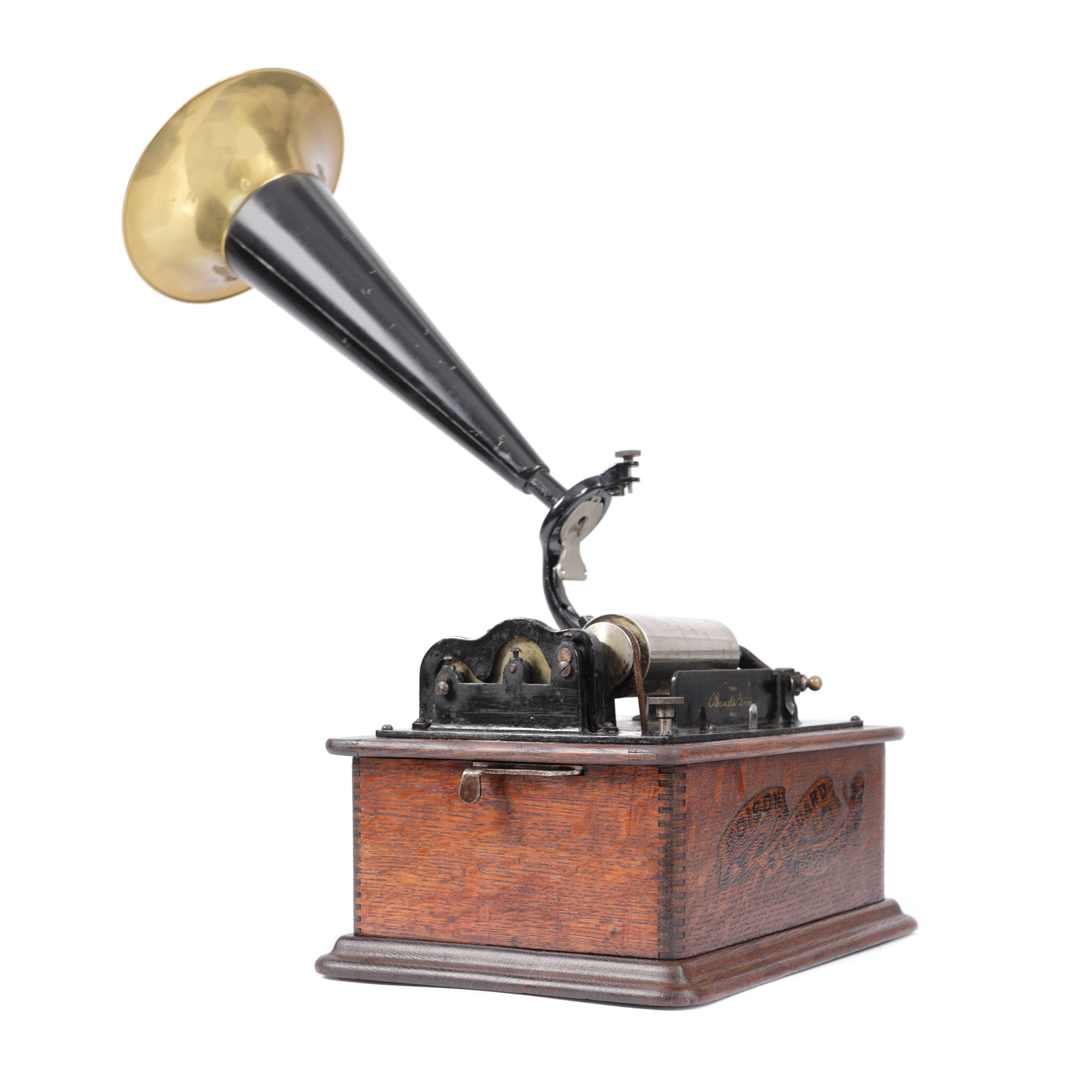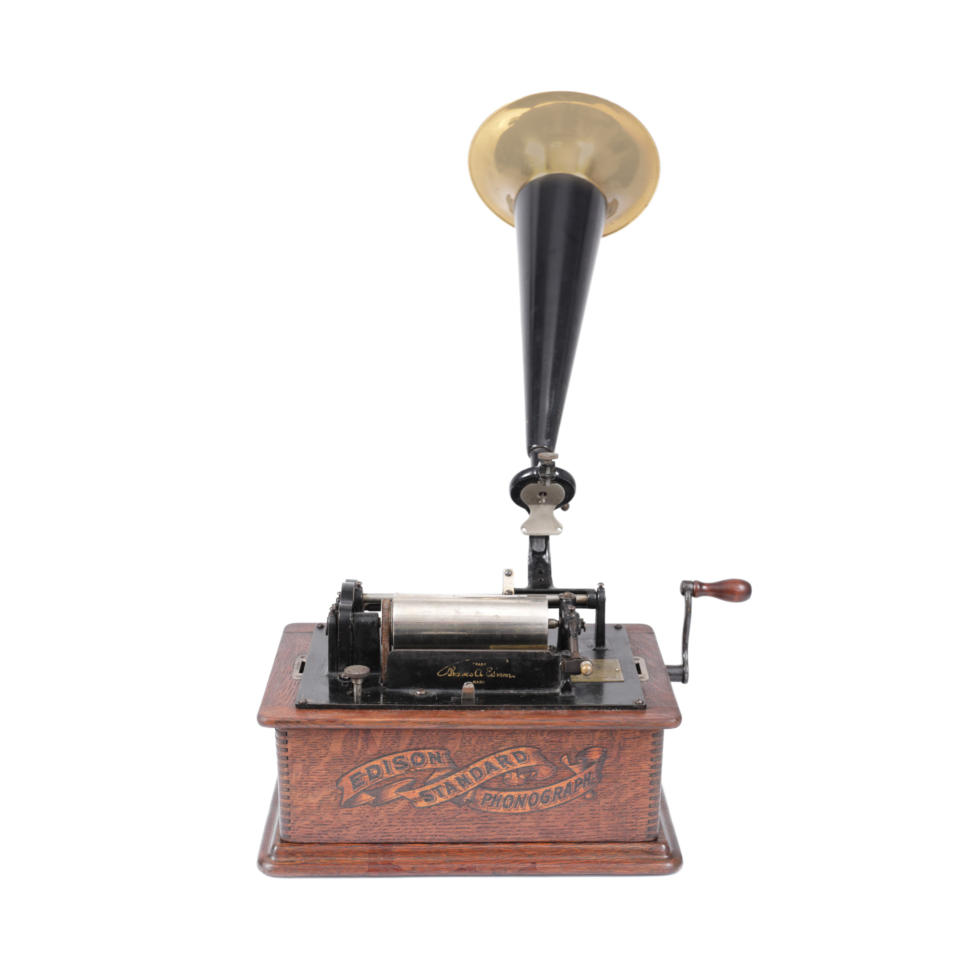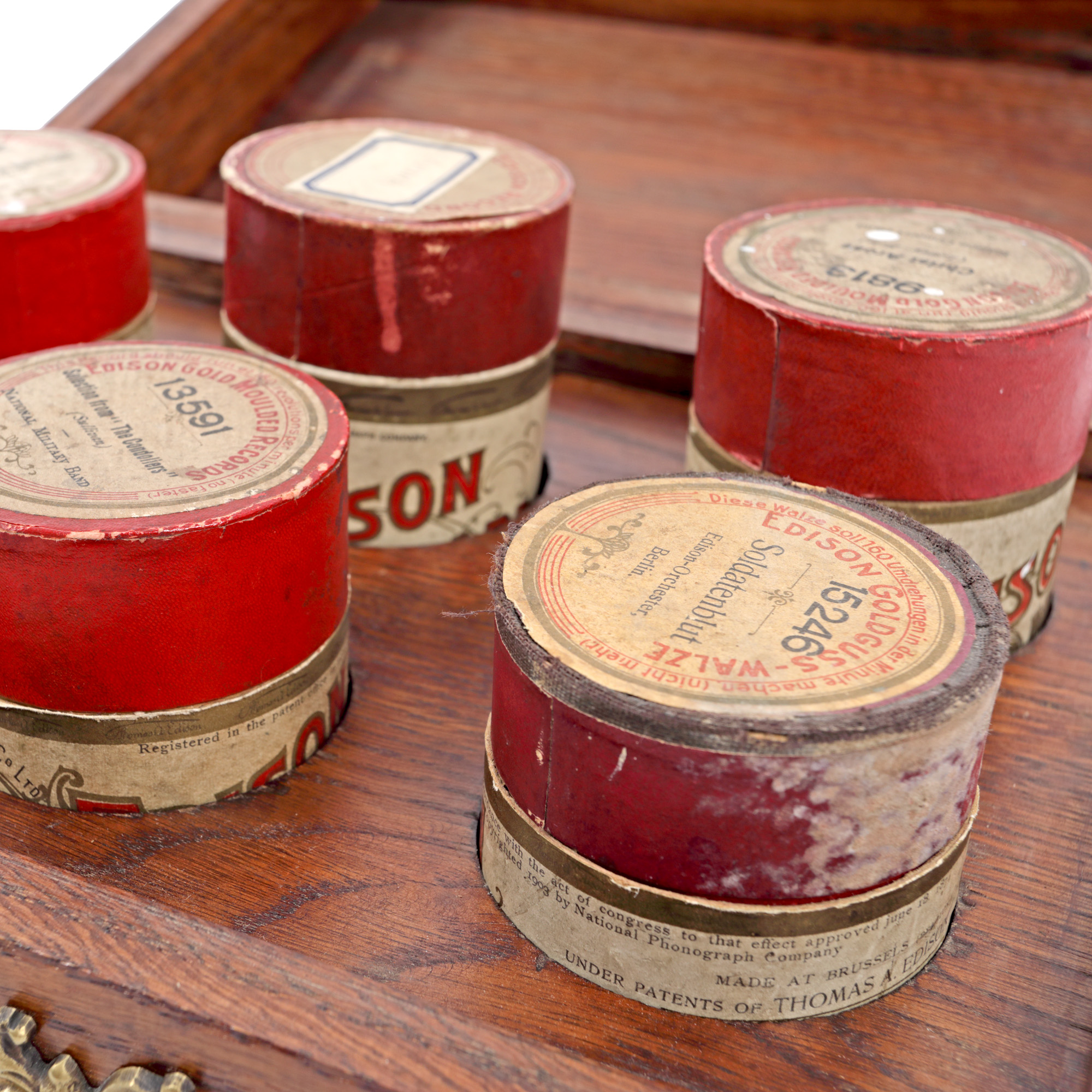 67. Fonograf Edison Standard, însoțit de o cutie cu șase cilindri Edison, din ceară, cu muzică, S.U.A., cca. 1900, piesă rară, de colecție