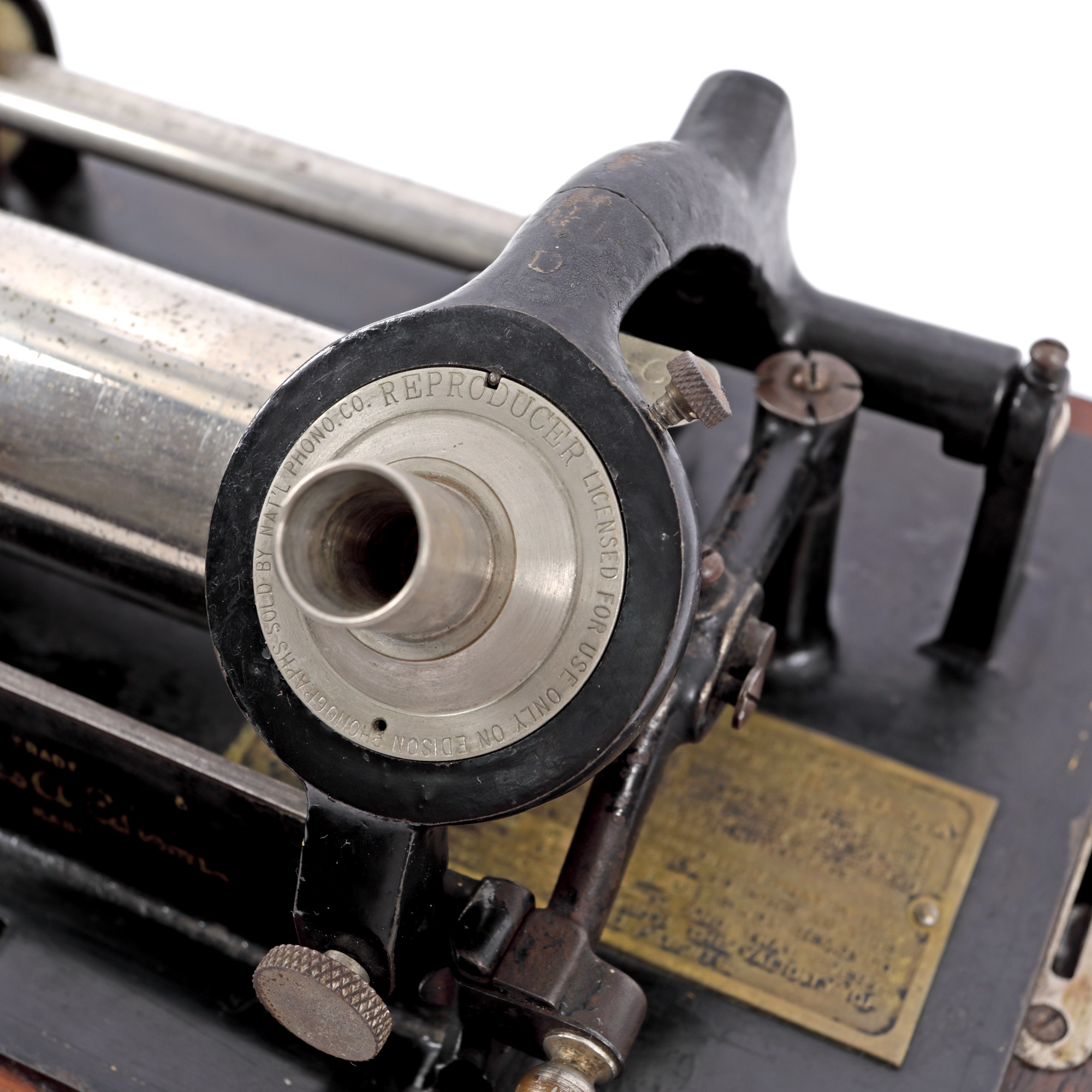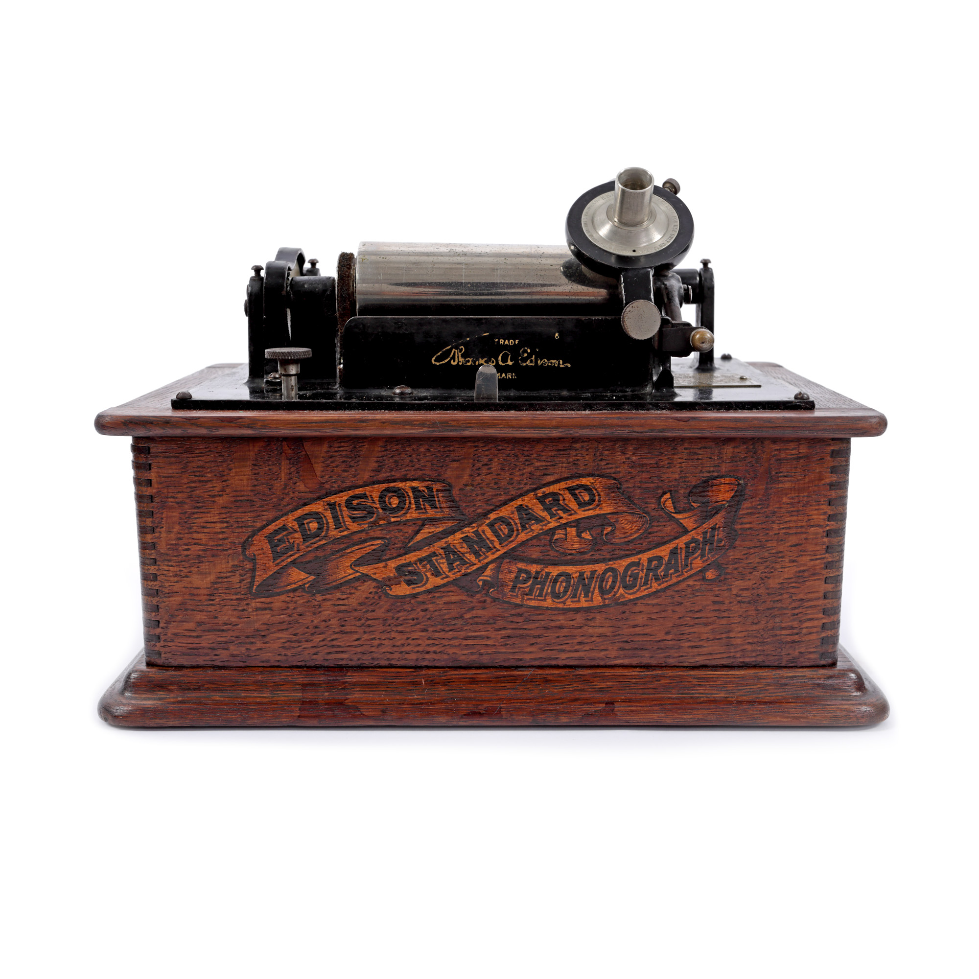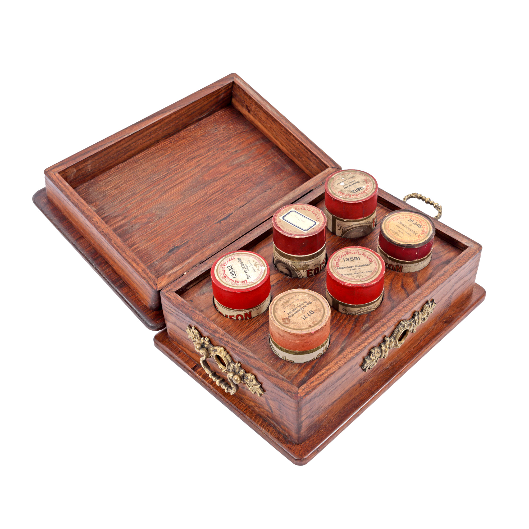 67. Fonograf Edison Standard, însoțit de o cutie cu șase cilindri Edison, din ceară, cu muzică, S.U.A., cca. 1900, piesă rară, de colecție