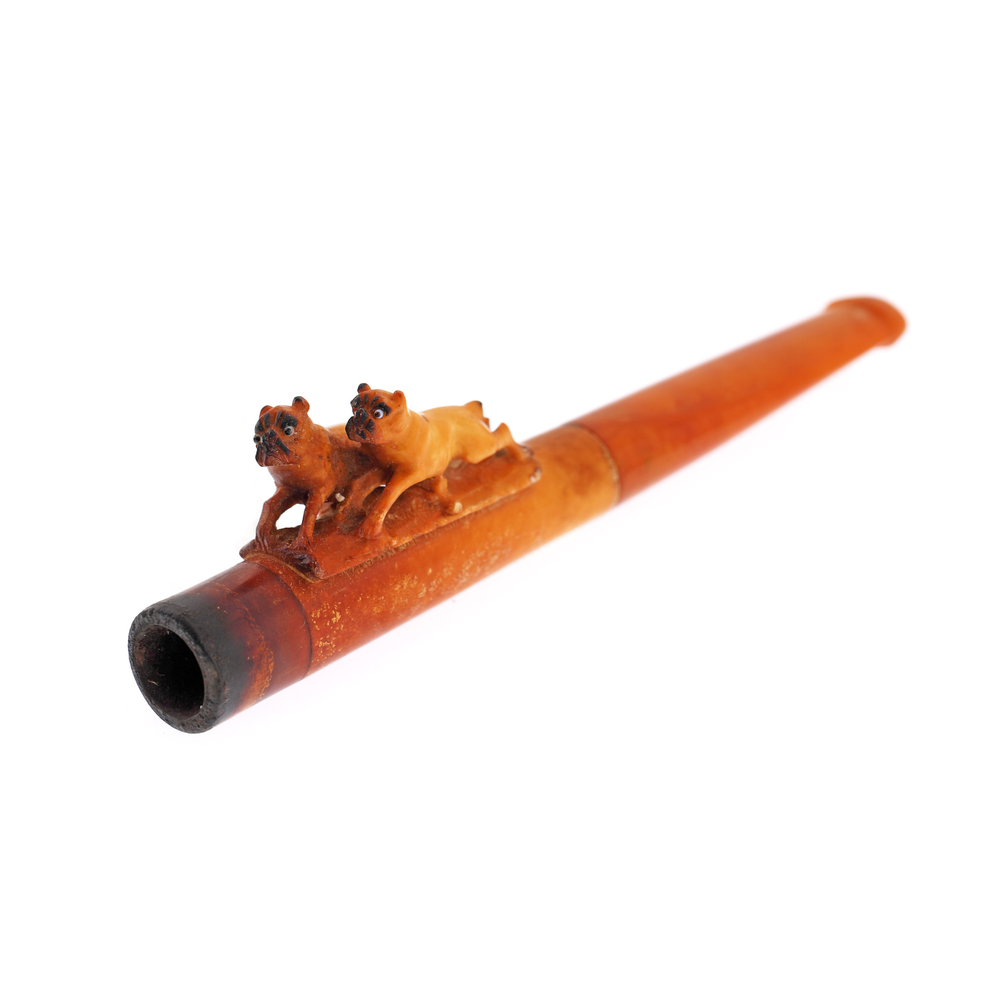 66. Port-țigaret din spumă de mare, decorat cu pereche de buldogi, în etui original [jumătatea sec. XX]