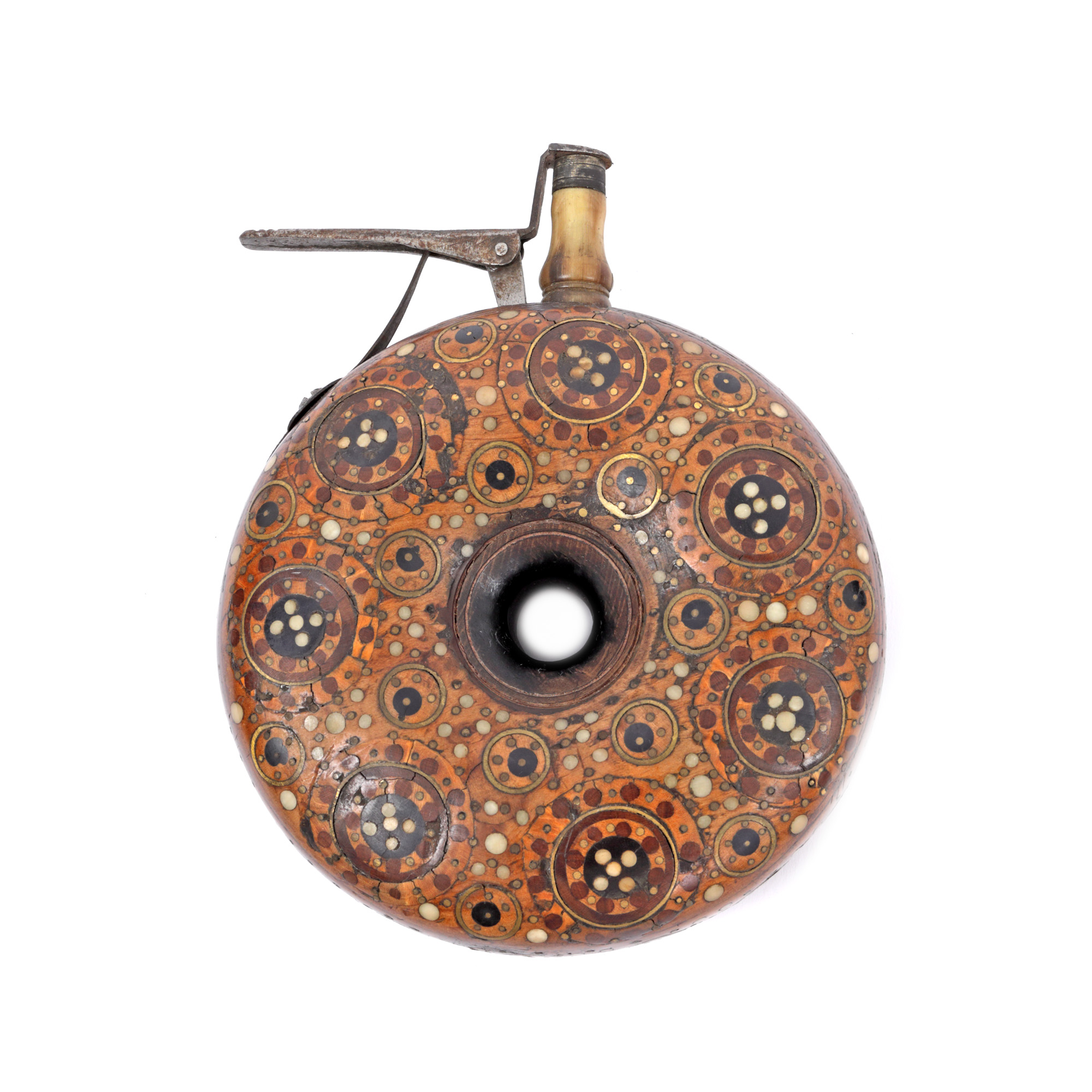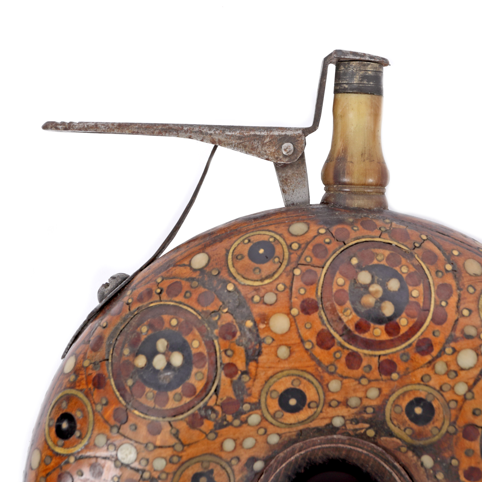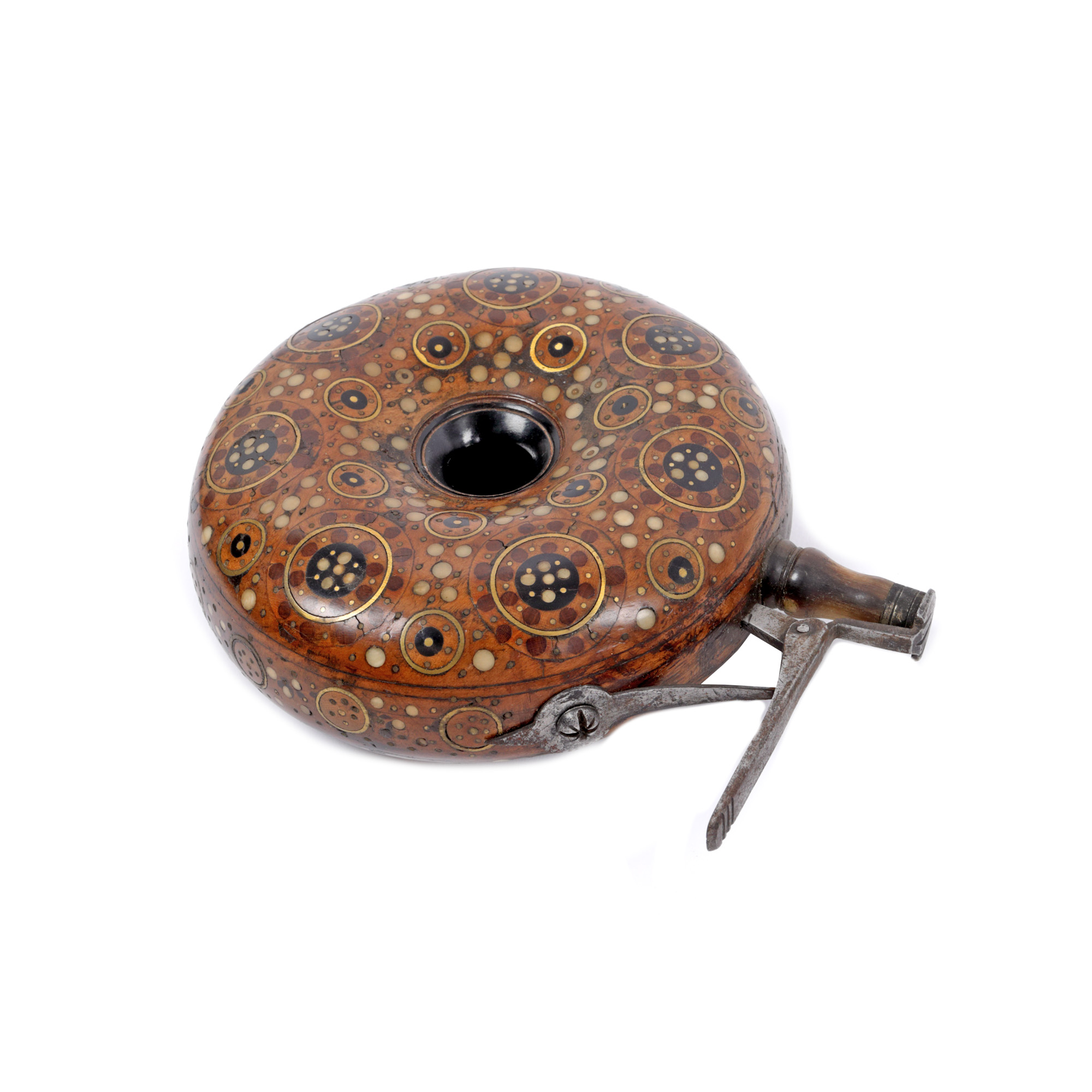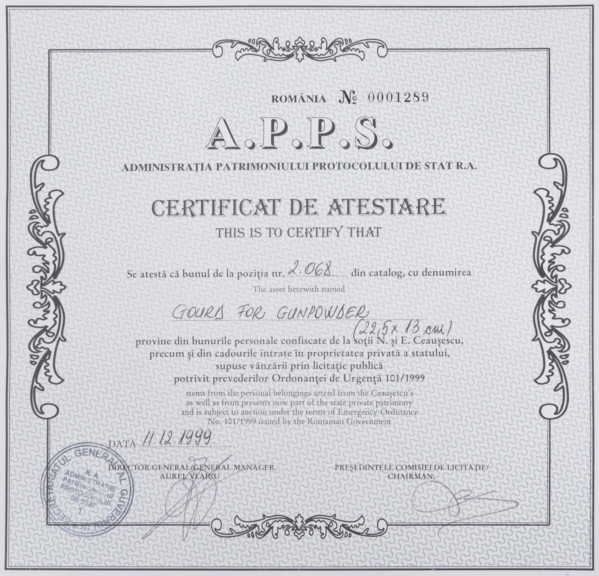 81. Recipient pentru păstrarea prafului de pușcă, cu intarsii din sidef, cadou de protocol către Nicolae Ceaușescu, pasionat de vânătoare, însoțit de certificat R.A.A.P.P.S.