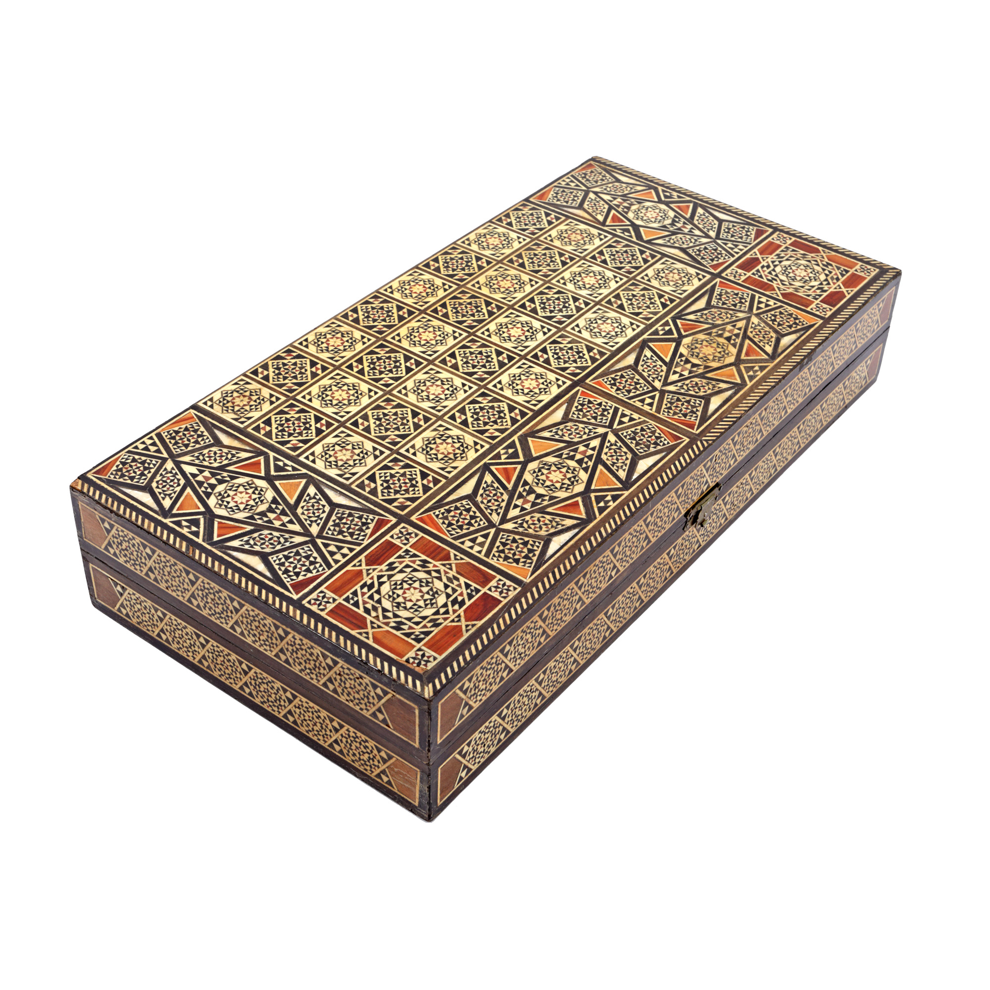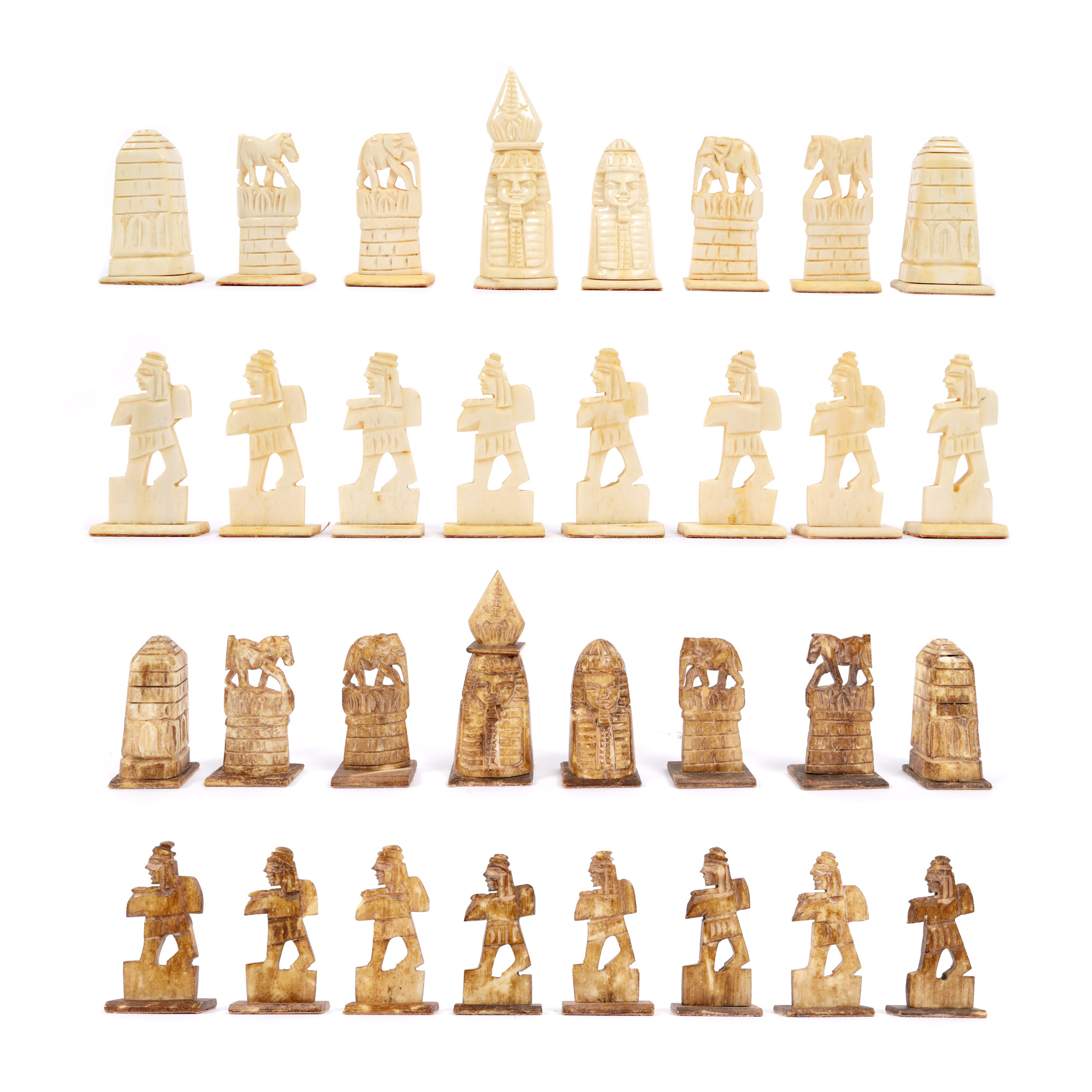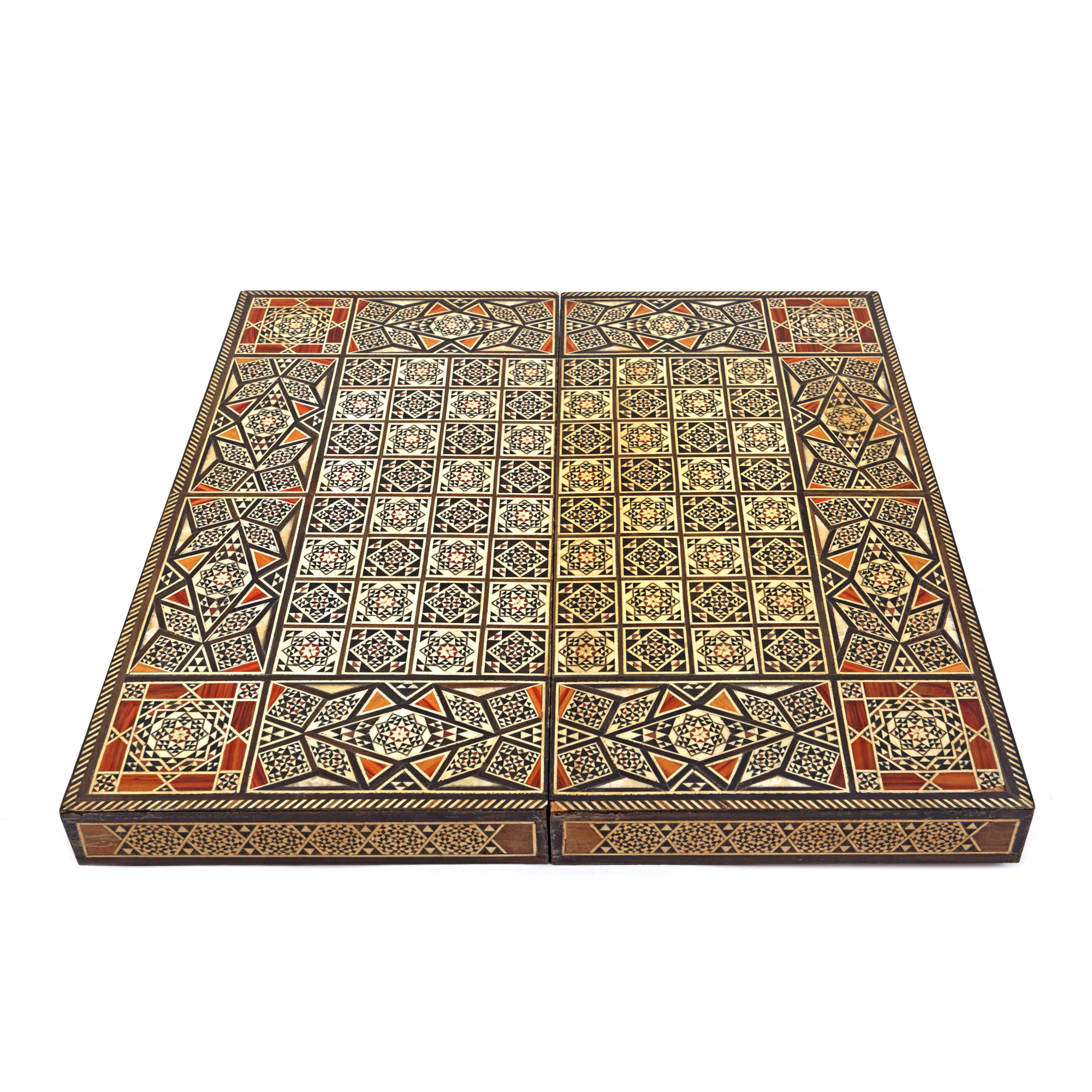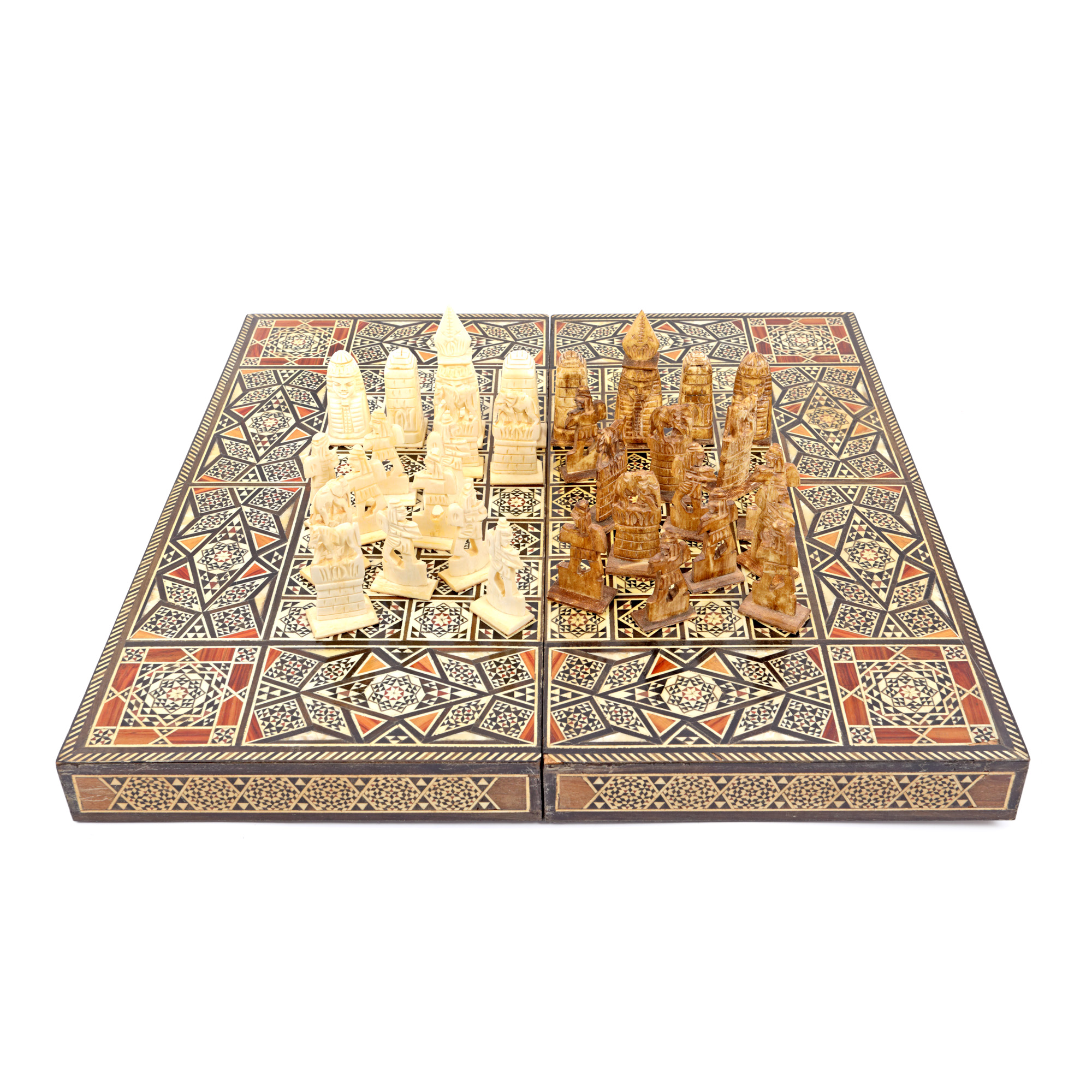 77. Tablă de șah, decorată minuțios cu intarsii din sidef, însoțită de piese de șah din os reprezentând personaje orientale