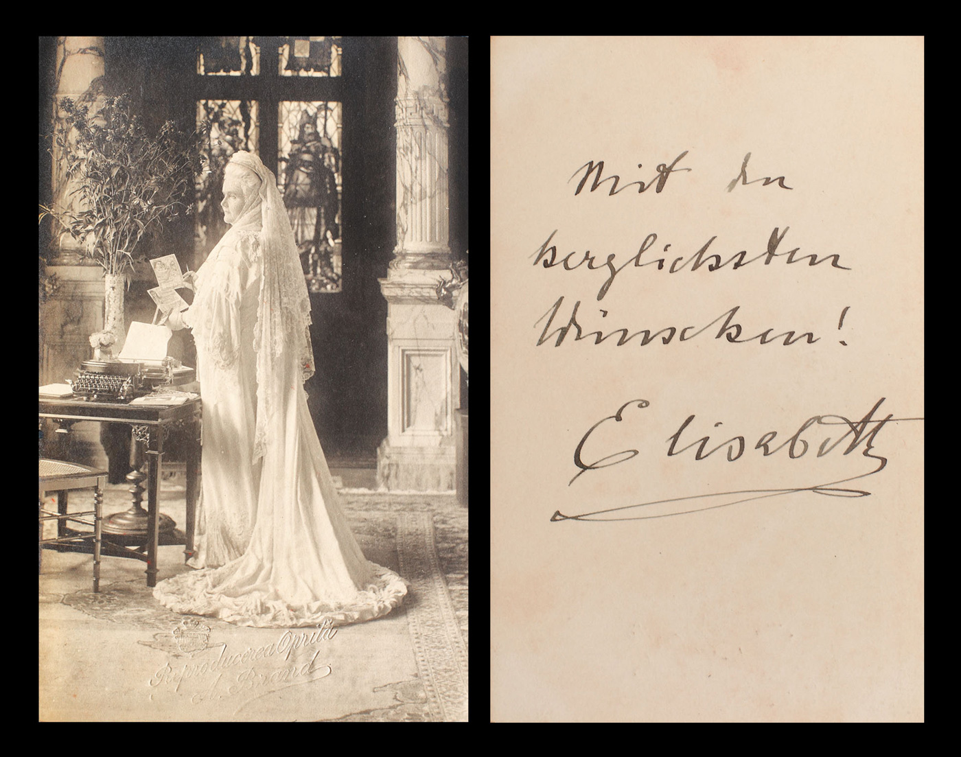 66. Carte poştală a Reginei Elisabeta, cu "urări din inimă", semnată olograf, cca. 1910