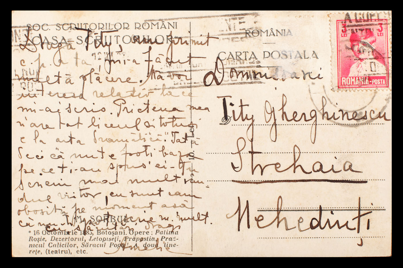 96. Carte poștală cu portretul lui Mihail Sorbul, purtând semnătura sa olografă, cca. 1925