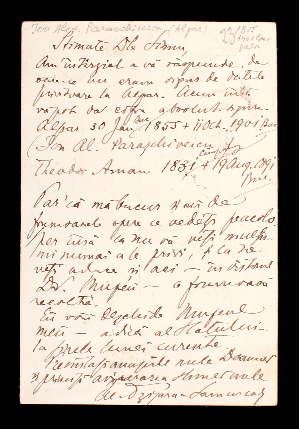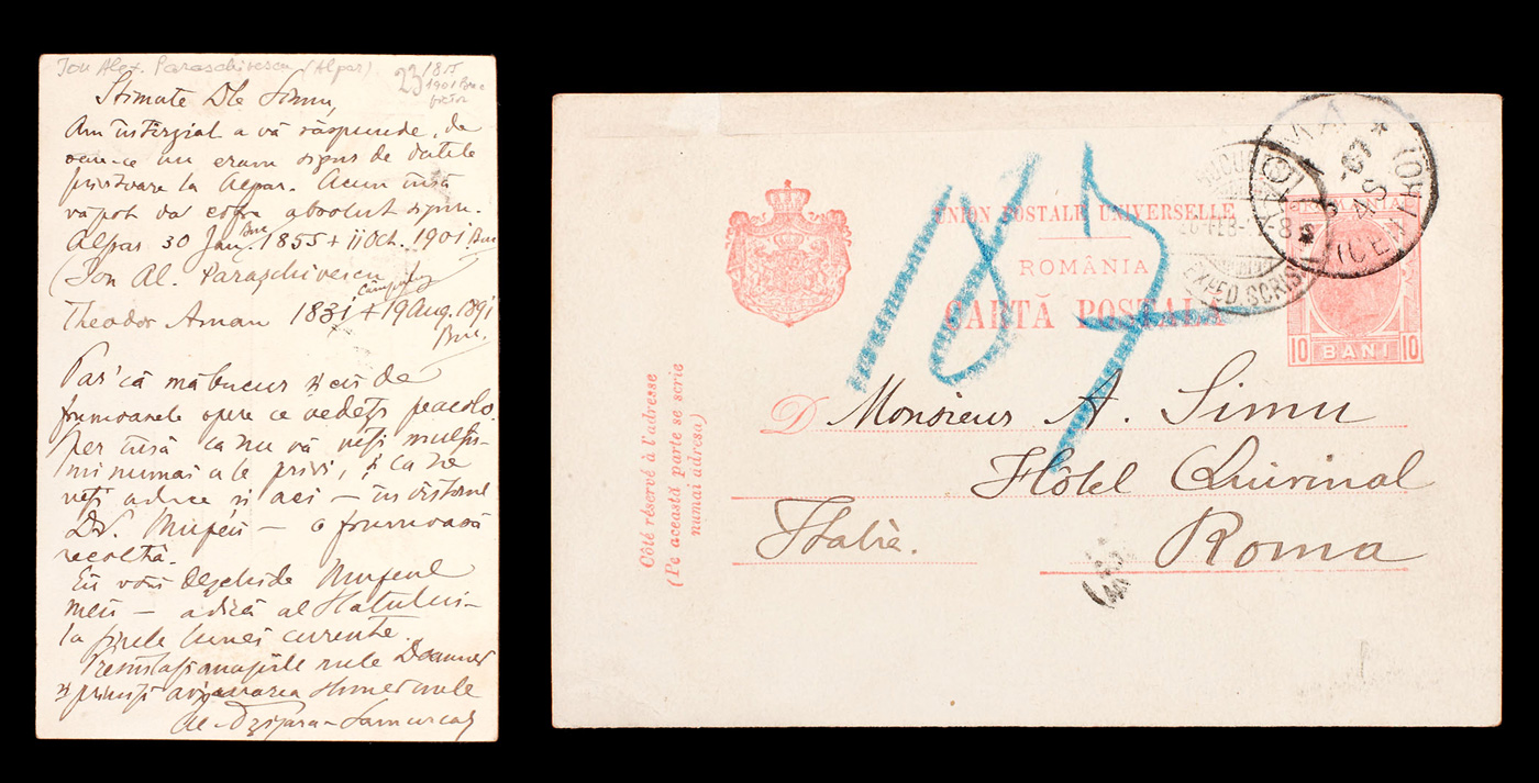 89. Carte poştală trimisă de Alexandru Tzigara-Samurcaș lui Anastase Simu, aflat la Roma, despre Alpar (pictorul Jean Alexandru Paraschivescu), precum şi despre bucuria admirării artei italiene, exprimă speranţa aducerii unor picturi italiene şi în muzeul său, 1907