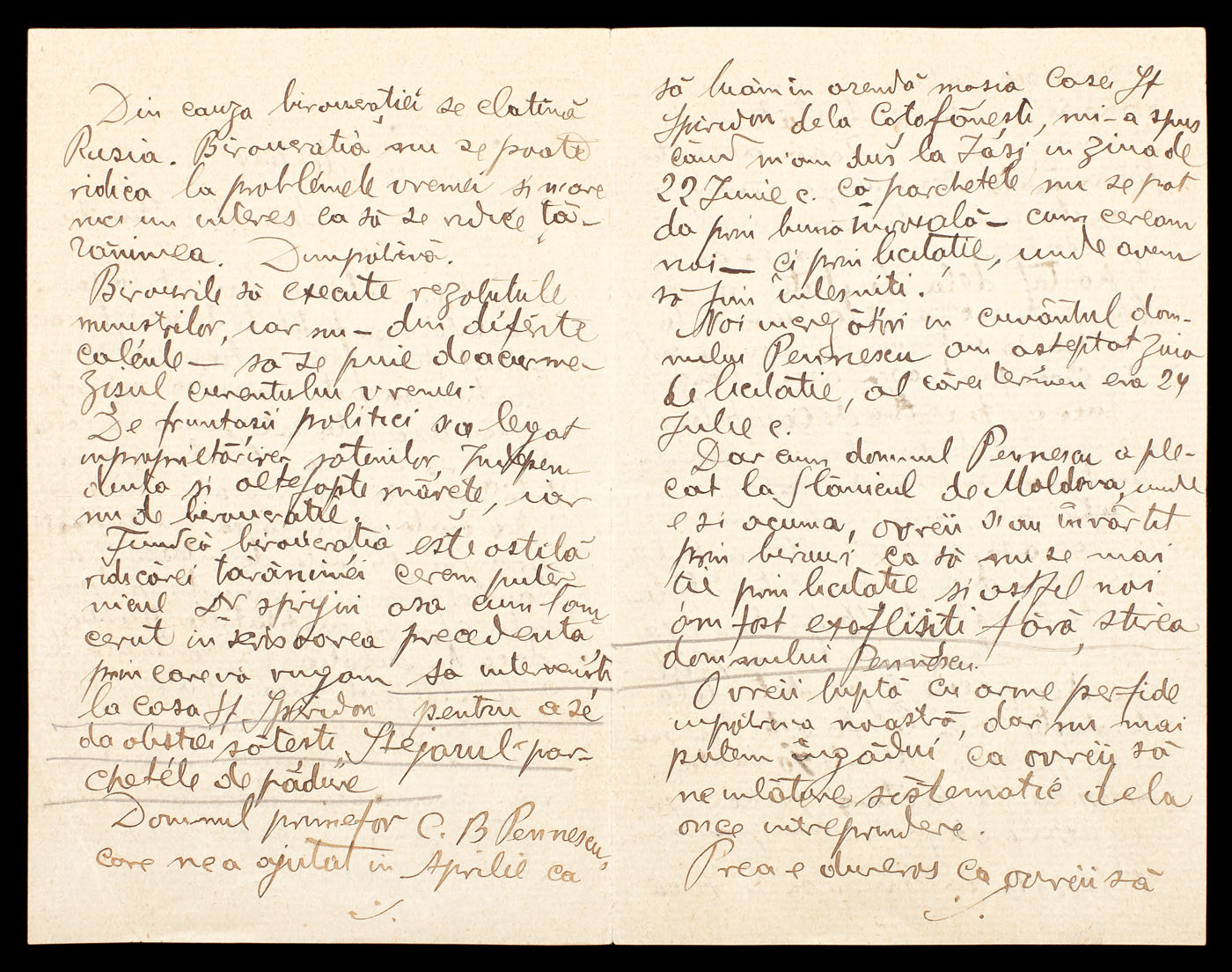 64. Jalbă către ministrul de interne Ion I.C. Brătianu, cu privire fraudarea licitației "parchetelor de pădure" de la Coțofenești ("prea e dureros ca ovreii să huzurească în țara românească iar românii să facă bătături la palme de sapă"), poartă rezoluția de grabnică rezolvare a lui Brătianu către primarul Iașilor C.B. Pennescu, august 1907