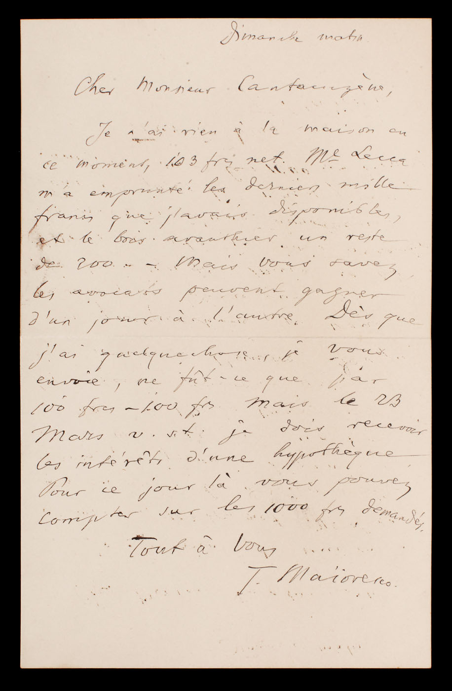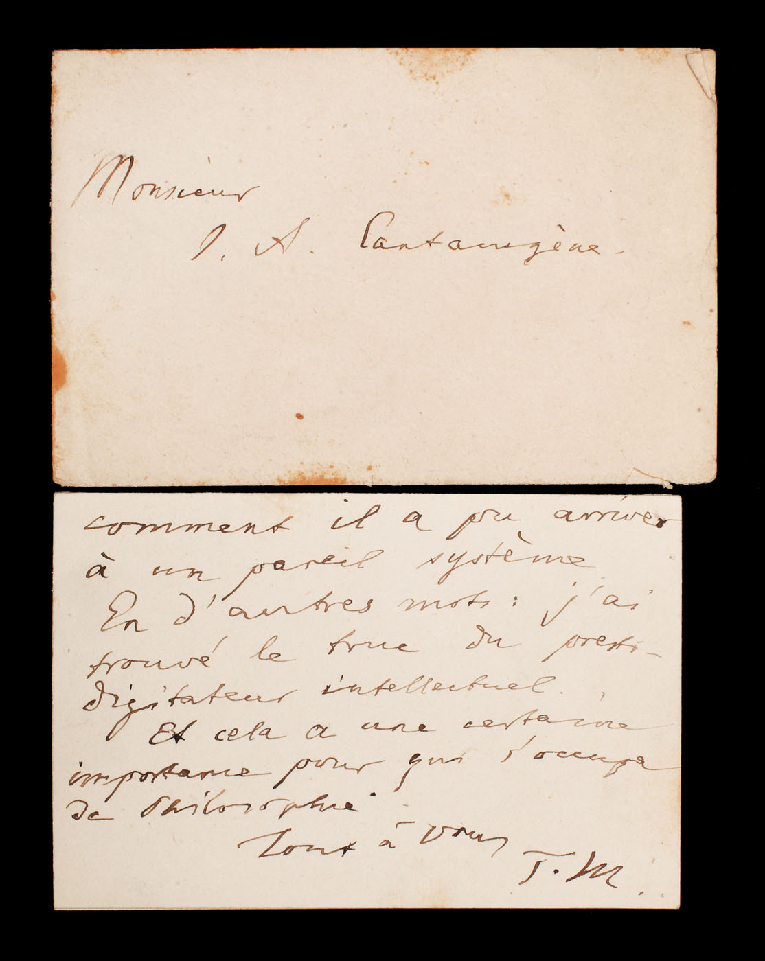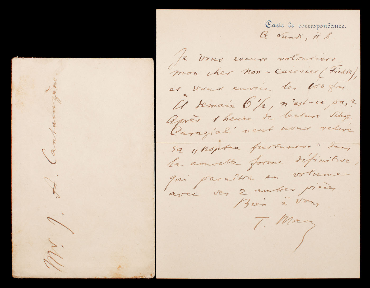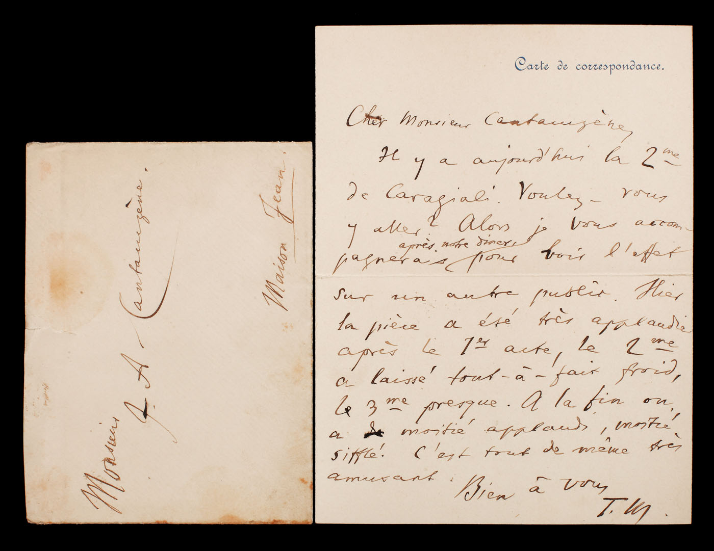 40. Lot format din 4 scrisori trimise de Titu Maiorescu către Ioan Alexandru ("Zizin") Cantacuzino, ministru și literat, despre discuțiile din sânul Junimii legate de I.L. Caragiale, înşoţite de trei plicuri originale, anii 1880-1890