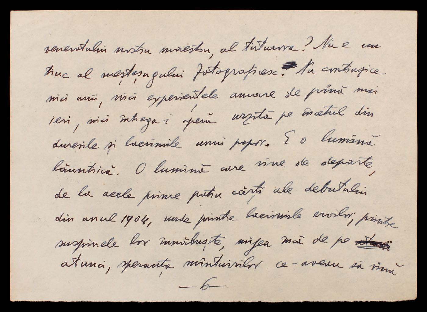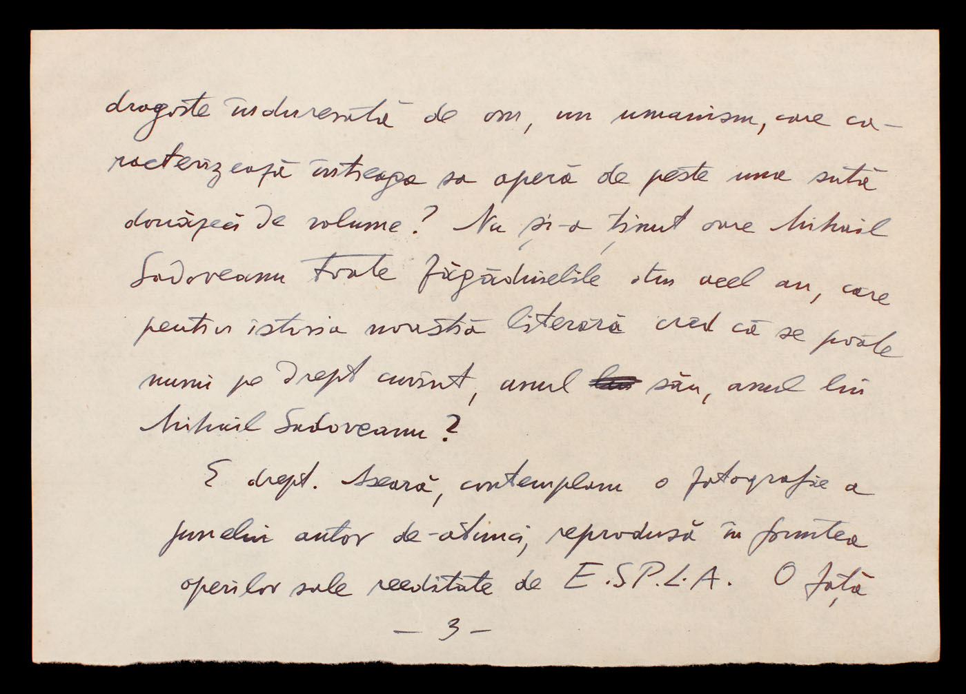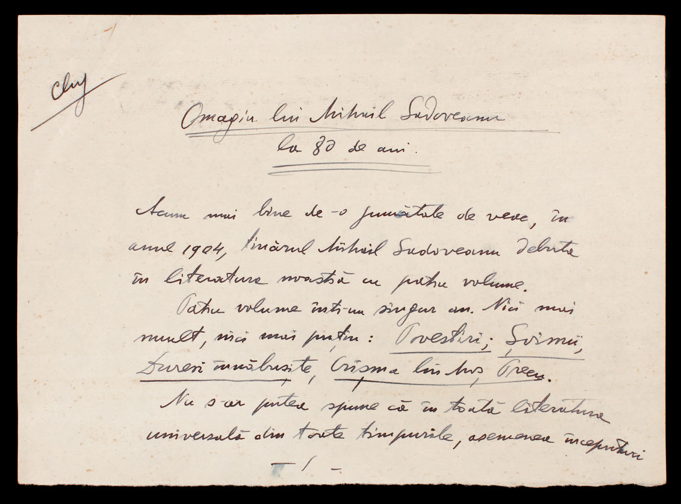 86. Manuscris al lui Cezar Petrescu, laudatio către Mihail Sadoveanu, cu ocazia împlinirii vârstei de 80 de ani, în plicul original, 1960 (7 file)