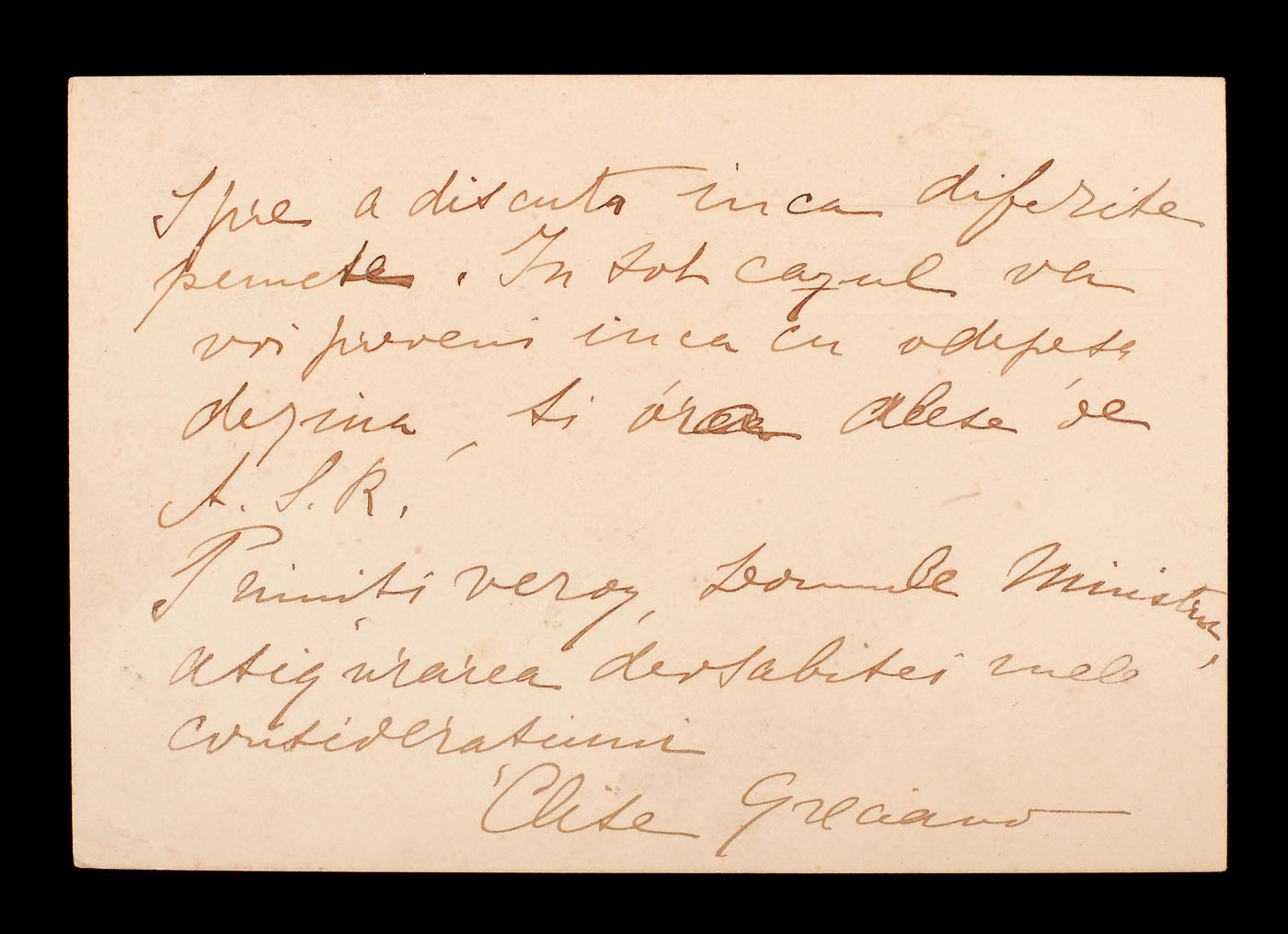 71. Scrisoare a Elizei Grecianu, doamnă de onoare a Principesei Maria, către ministrul instrucțiunii publice, pe hârtie cu antetul Serviciului Damei de Onoare a ASR Principesei României, de chemare a ministrului la raport, începutul sec. XX