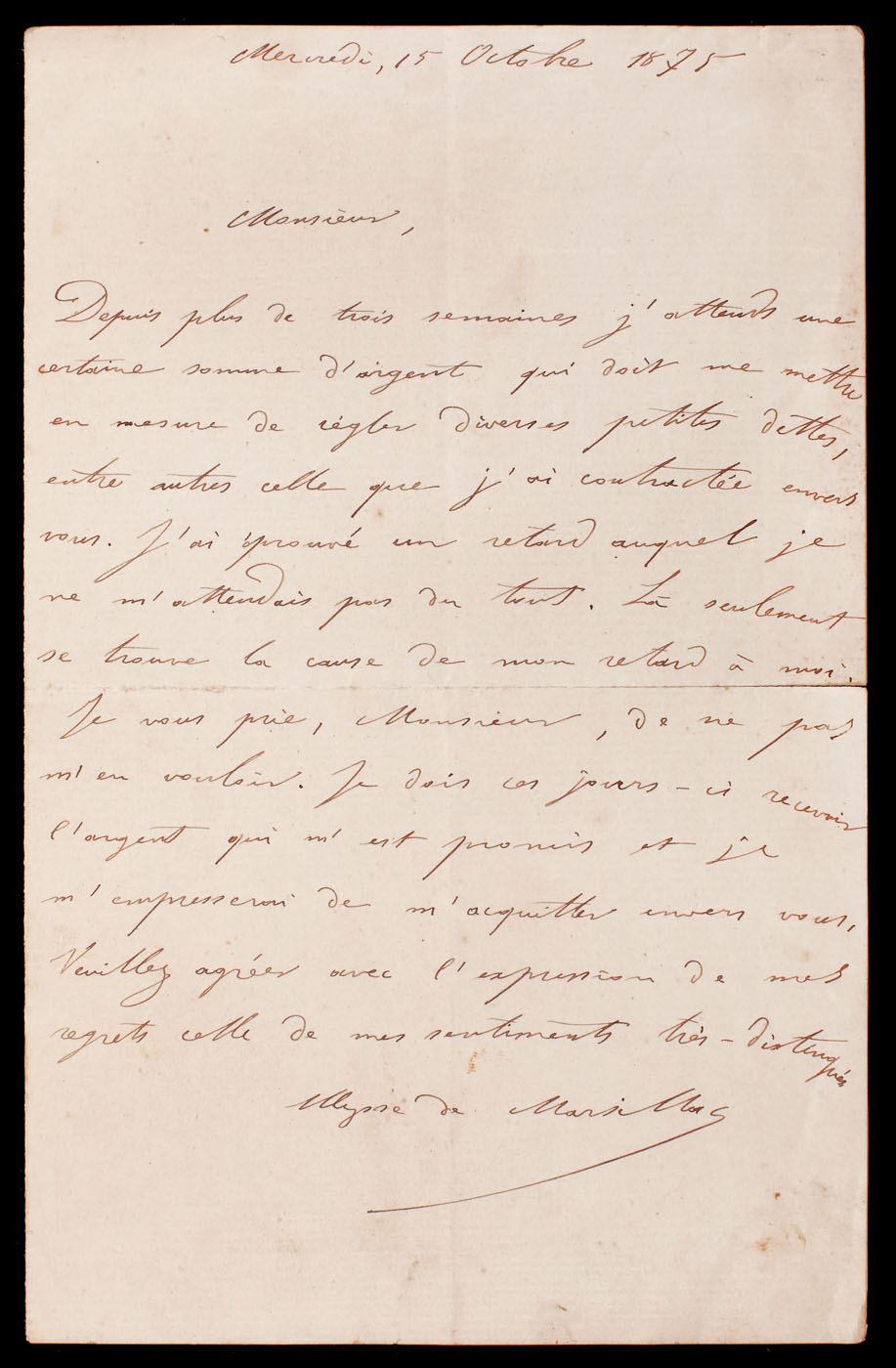 117. Scrisoare a jurnalistului francez naturalizat român Ulysse de Marsillac, referitoare la plata unei datorii, 15 octombrie 1875