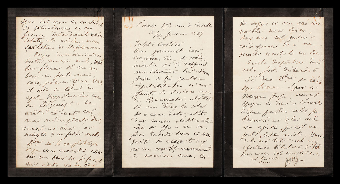 105. Scrisoare a lui Alexandru Odobescu către Constantin Caracaș, despre vizita sa incognito în București, însoțită de plicul original, francată, Paris, 1887 (3 file)