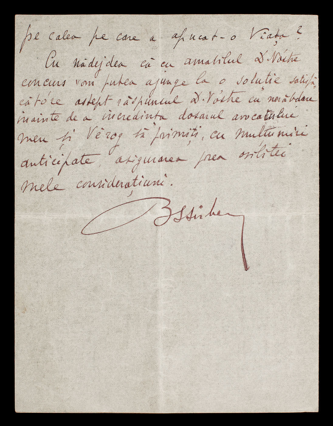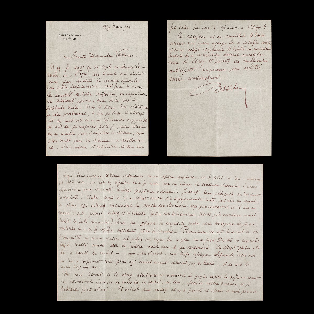 118. Scrisoare a lui Barbu Ştirbei (viitor prim-ministru și confident al Reginei Maria) către politicianul Mihail Vlădescu, referitoare la nemulţumirile sale legate de Societatea "Viaţa", care nu-şi respecta angajamentele luate, Palatul Buftea, 17 mai 1904 (2 file)