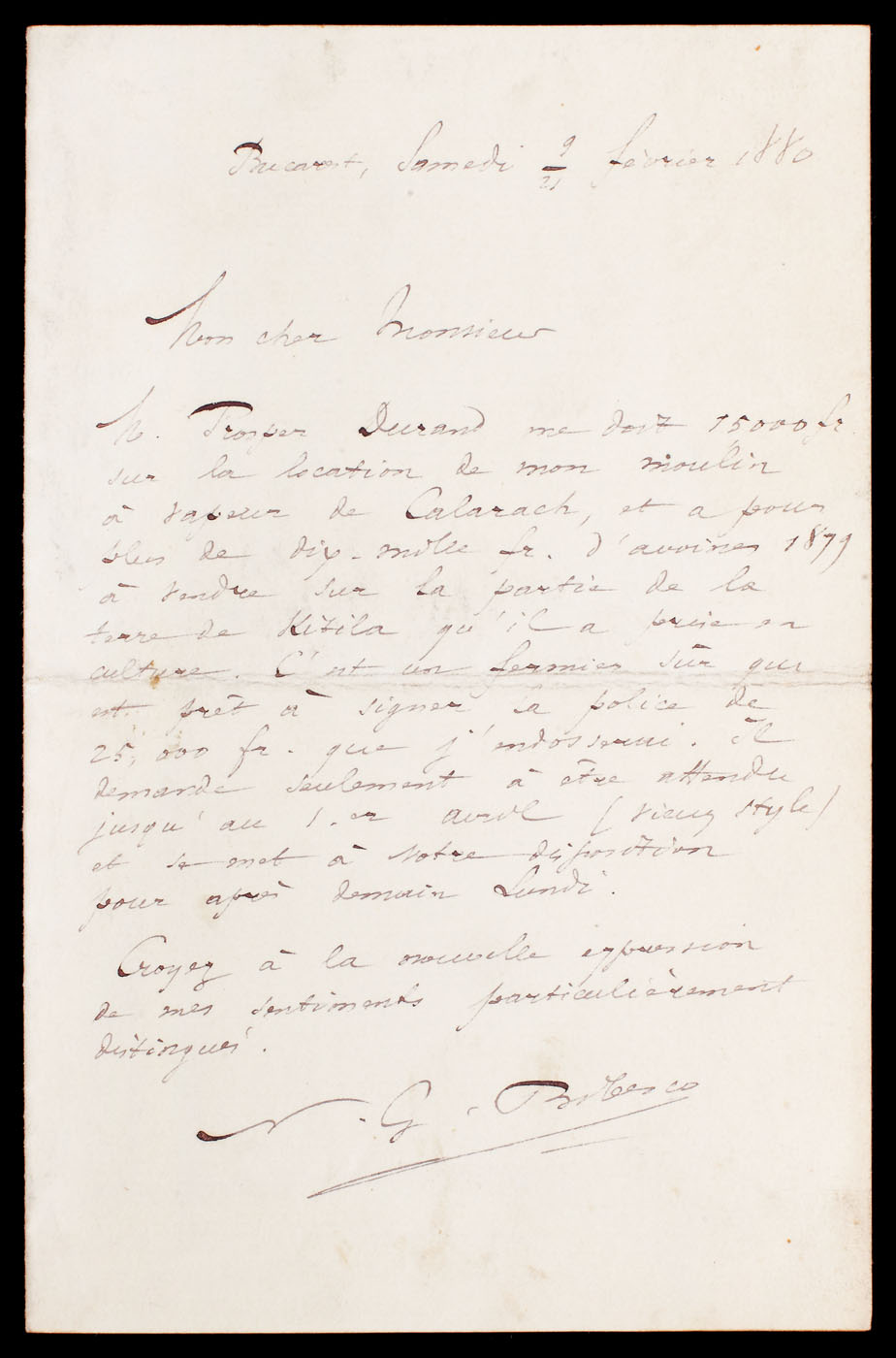 69. Scrisoare a lui George Bibescu, referitoare la încasarea unei sume de bani obţinută din chirii de la Prosper Durand, Bucureşti, 21 februarie 1880