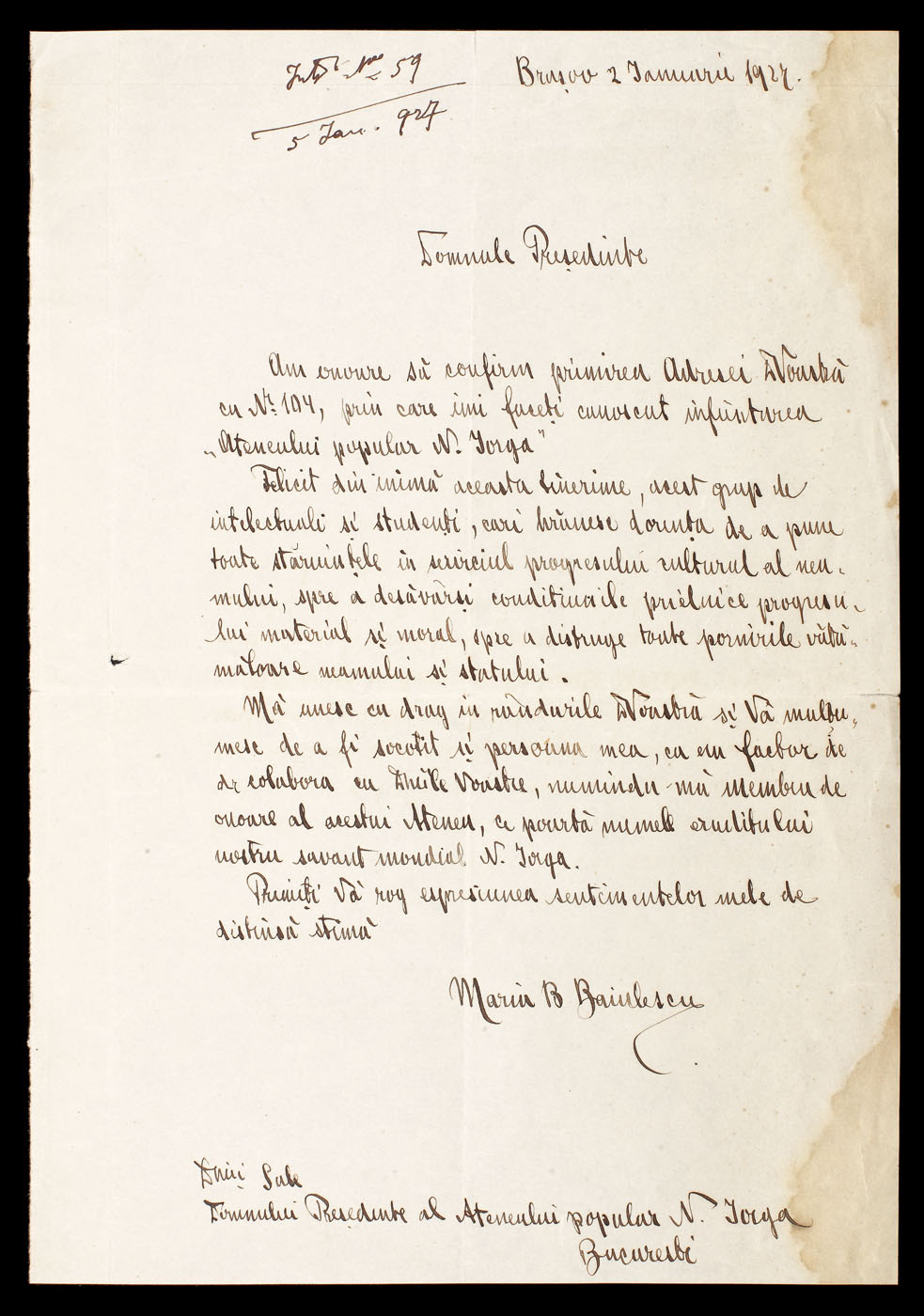 93. Scrisoare a Mariei Baiulescu, una dintre marile personalităţi feminine ale începutului sec. XX, adresată directorului Ateneului Popular "Nicolae Iorga" Bucureşti, 1927