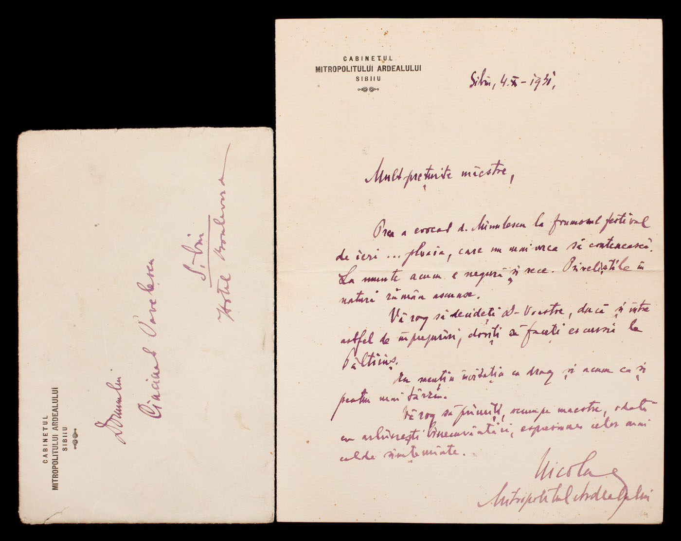 90. Scrisoare a Mitropolitului Ardealului Nicolae, către scriitorul Cincinat Pavelescu, prin care îl invită la Păltiniş, unde avusese loc un festival de poezie la care participase şi Ion Minulescu, în plicul original, Sibiu, 1931 (2 file)
