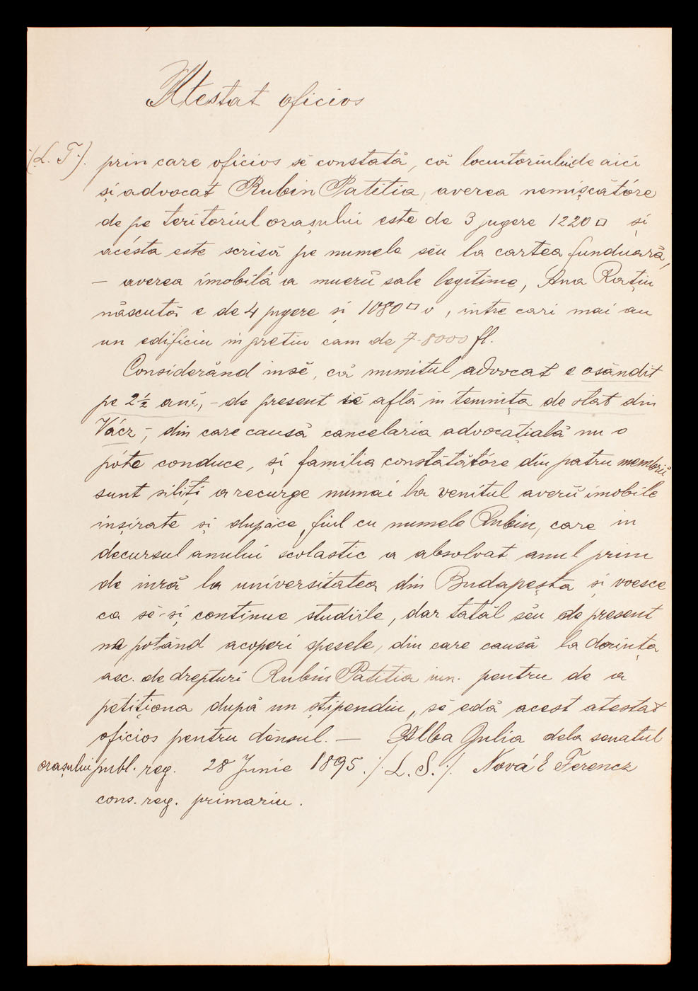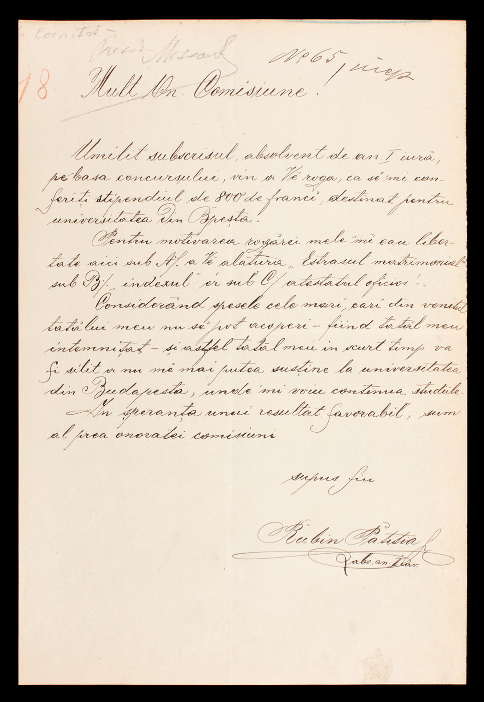 116. Scrisoare adresată de memorandistul Rubin Patiţia referitor la susţinerea financiară a studiilor sale la Budapesta, însoţită de un "Atestat oficios" în susţinerea scrisorii (2 file)