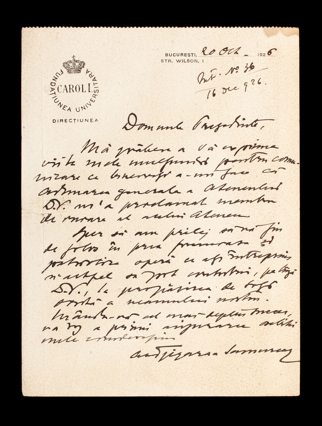 94. Scrisoare de mulţumire a lui Alexandru Tzigara-Samurcaș, directorul Fundaţiei Universitare Carol I, cu privire la primirea ca membru de onoare al Adunării Ateneului Popular "Nicolae Iorga" Bucureşti, 1926