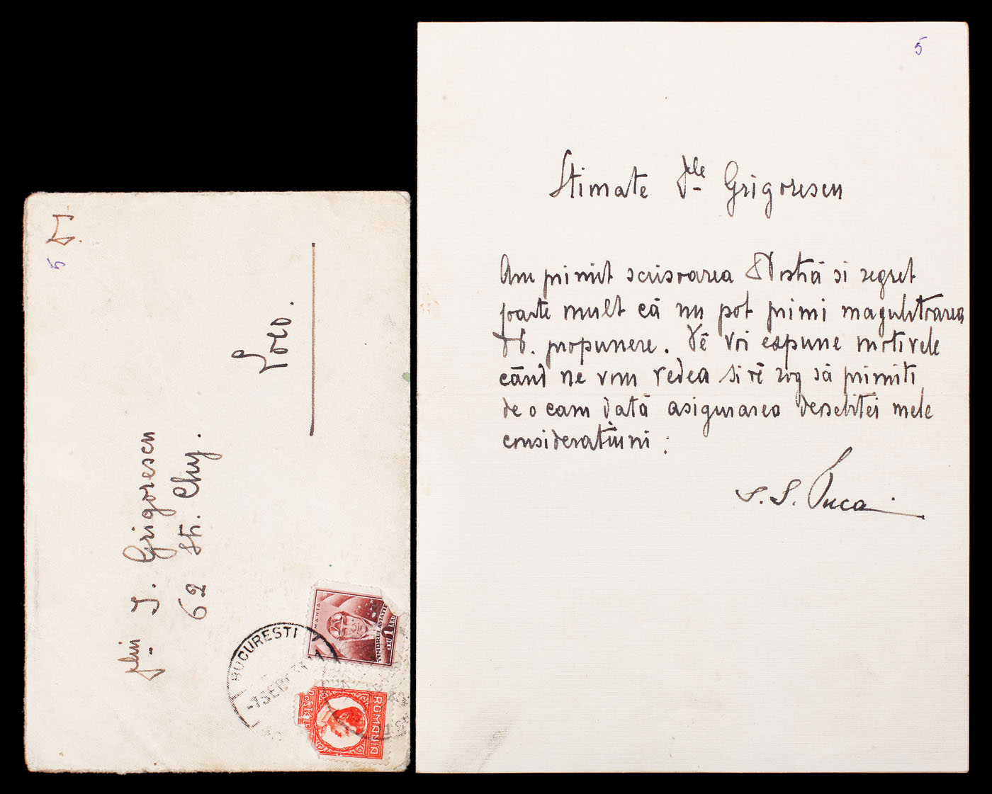 124. Scrisoare trimisă de fruntașul liberal I.G. Duca profesorului Ion Grigorescu, directorul Ateneului Popular, însoțită de plic francat, septembrie 1933, cu două luni înainte de asasinatul de la Sinaia