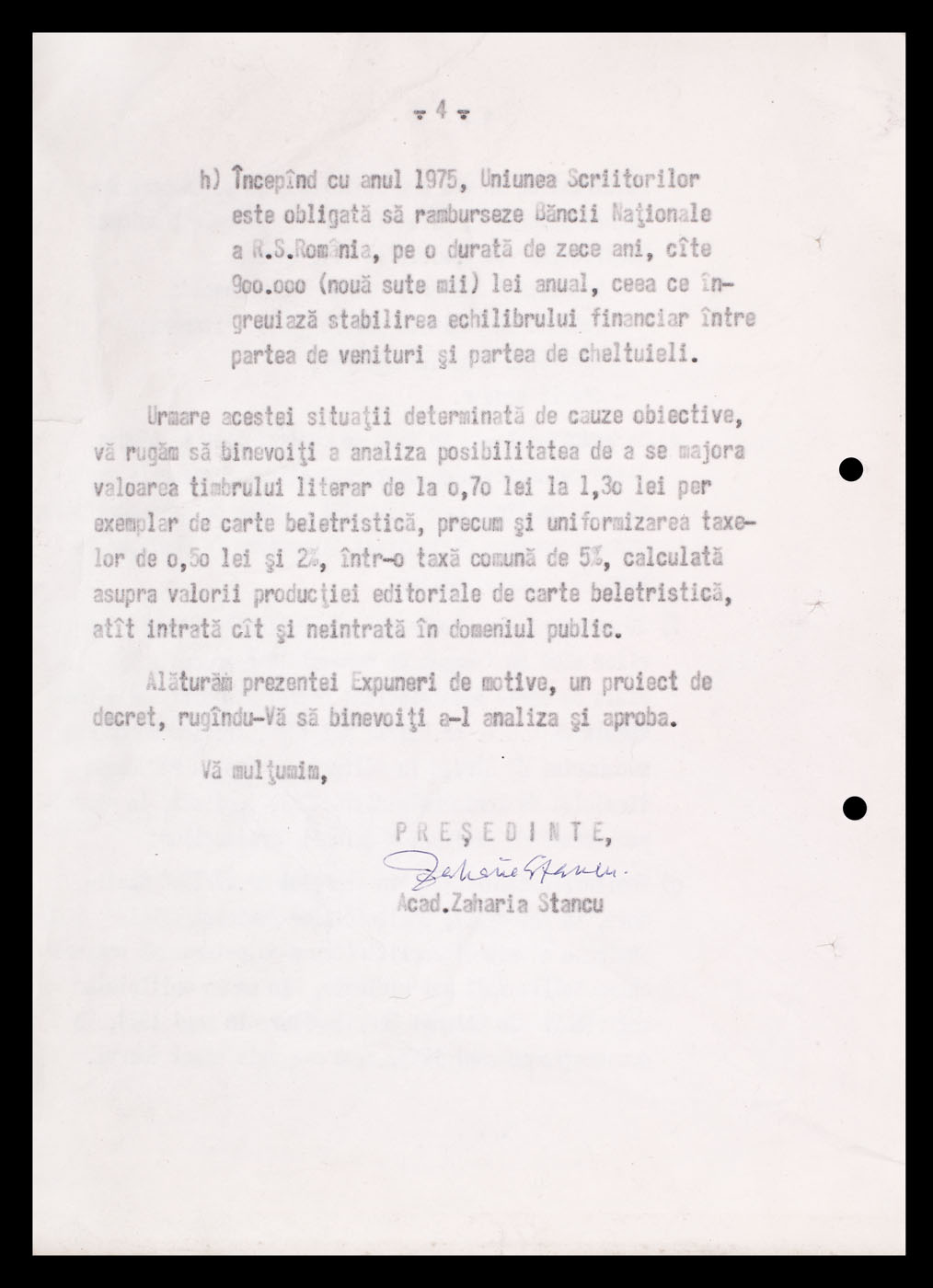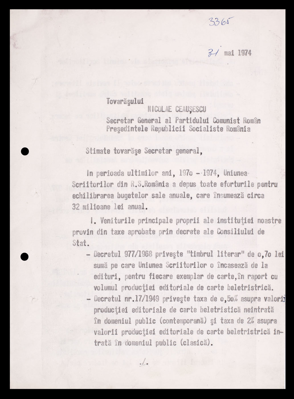 88. Solicitare a scriitorului Zaharia Stancu, președintele Uniunii Scriitorilor, către Nicolae Ceauşescu, de susținere financiară a USR, 1974