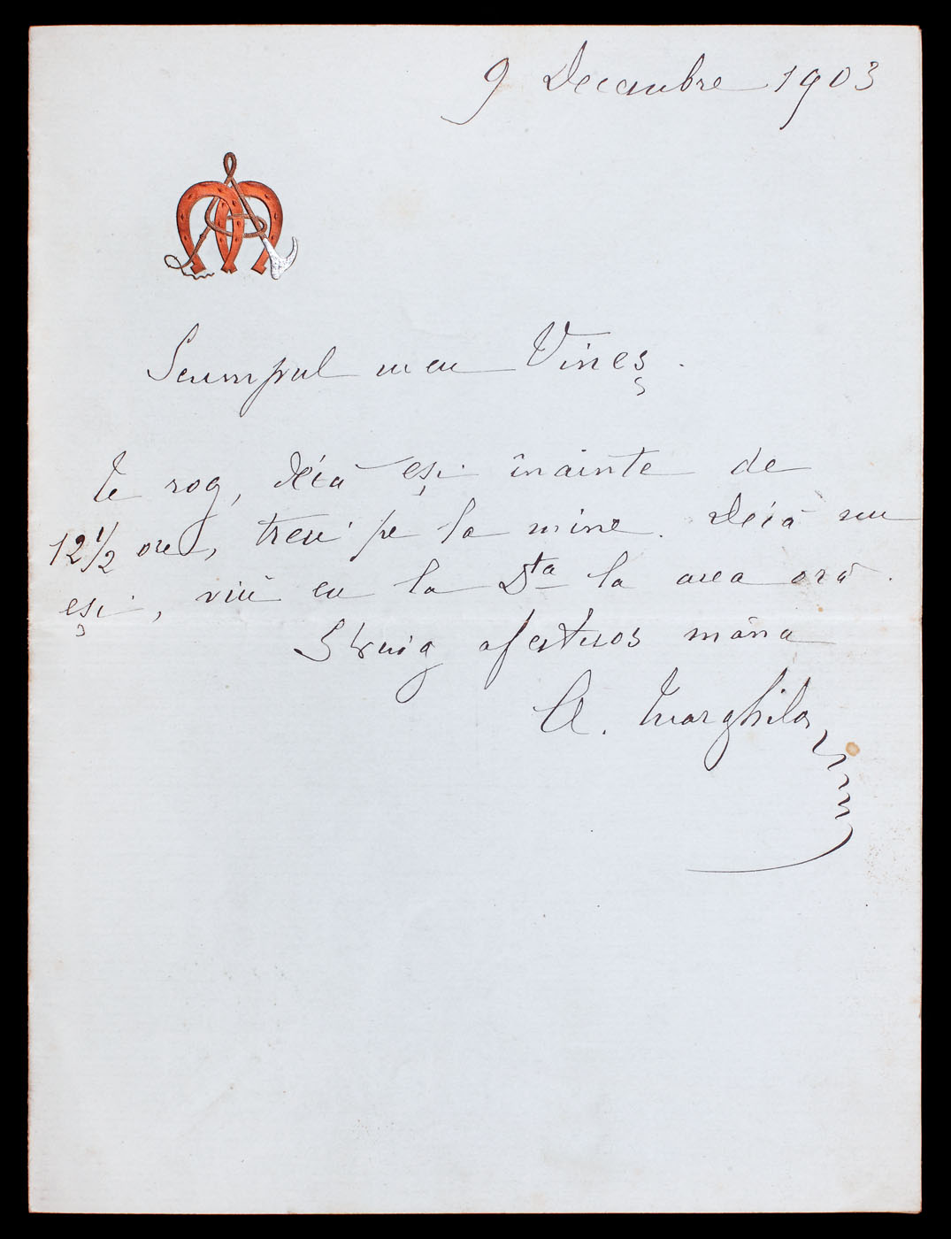 80. Superbă scrisoare a lui Alexandru Marghiloman, către prietenul Vineș, pe hârtie BFK Rives, decorată cu monogramă embosată și pictată, decembrie 1903