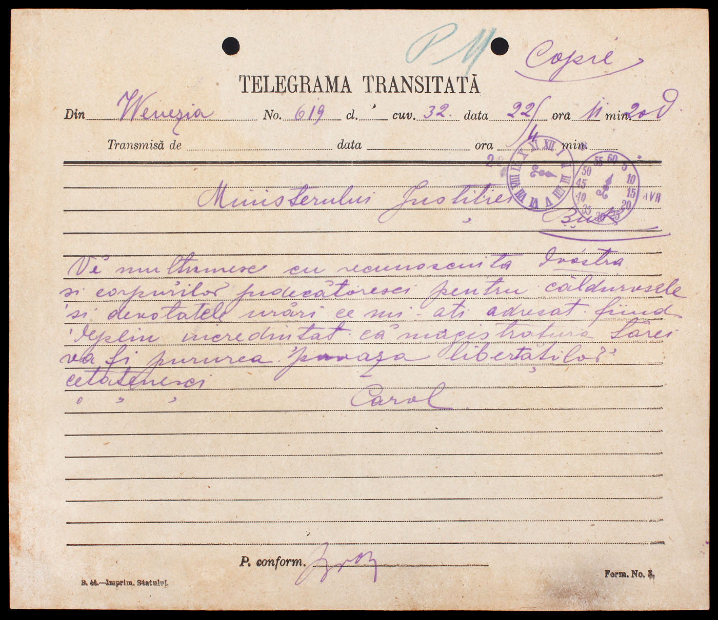 58. Telegramă de mulțumiri trimisă de Regele Carol I din Veneția, către ministrul Justiţiei, cca. 1900