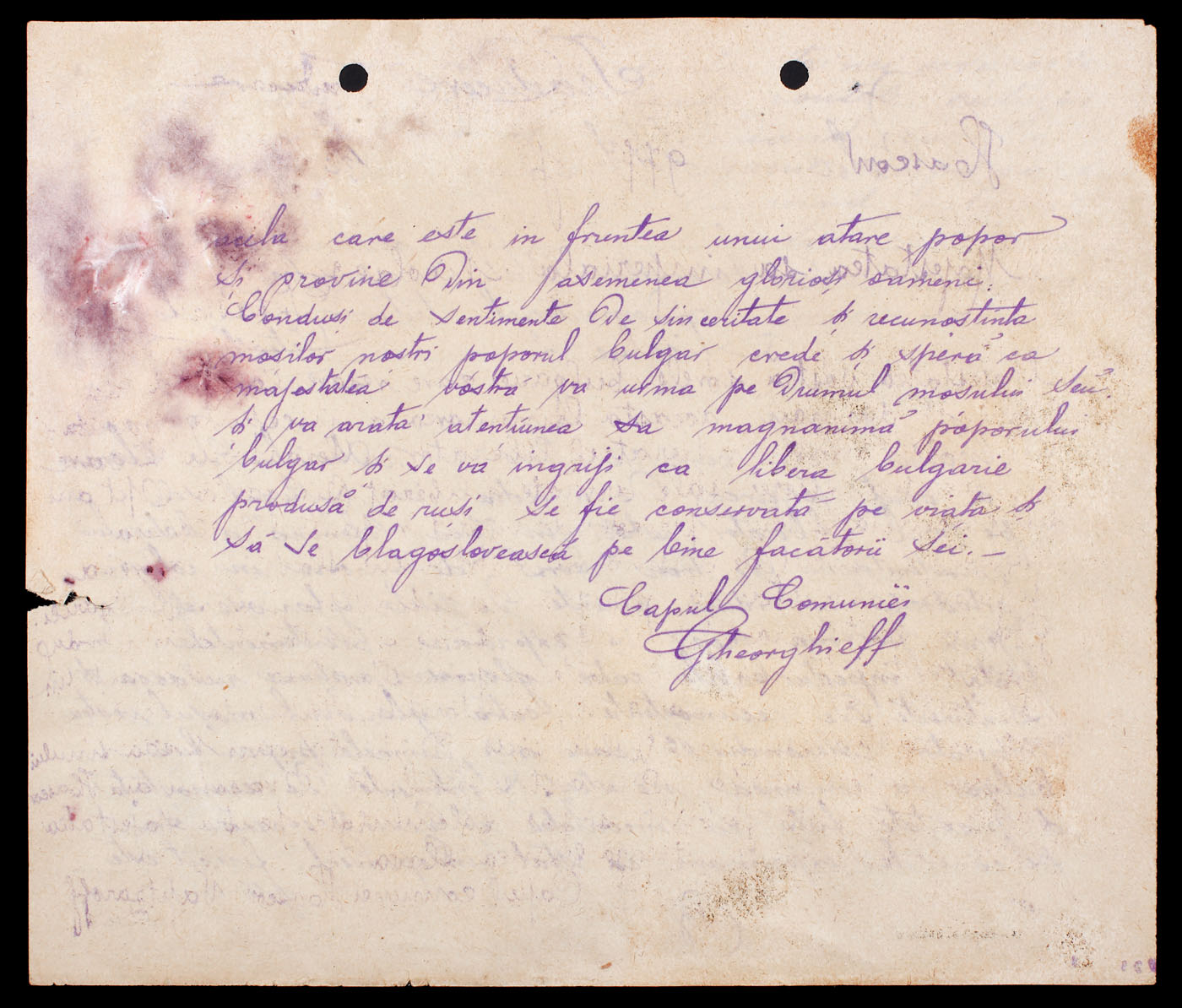 111. Telegramă trimisă de primarul orașului bulgăresc Bela către Nicolae al II-lea, Țarul Rusiei, de felicitare cu privire la nașterea Prințului Boris de Târnovo, interesantă mostră de cult al personalității, 1894