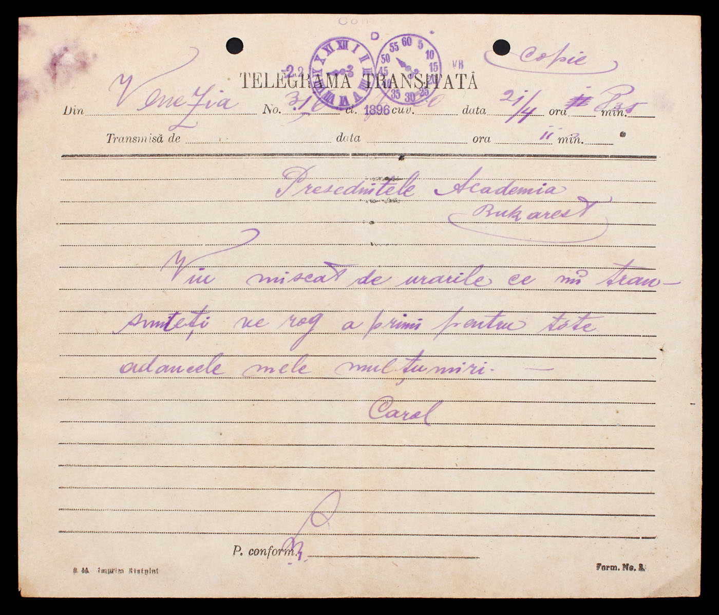 63. Telegramă trimisă de Regele Carol I către Nicolae Kretzulescu, Preşedintele Academiei Române, 1896